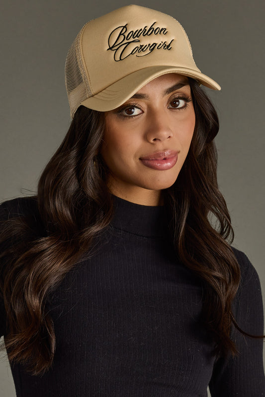 Bourbon Cowgirl Embroidered Foam Trucker Hat - Tan