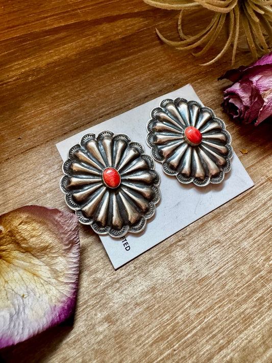 Large Concho Earrings with Red Spiny Oyster – Sterling Silver