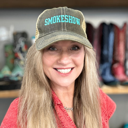 Smokeshow Trucker Hat Distressed Black Embroidered Pink or Aqua