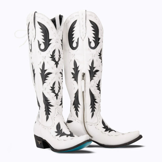 Reverie Newsprint Knee High Tall Snip Toe Black & White Cowboy Boots | Bourbon Cowgirl