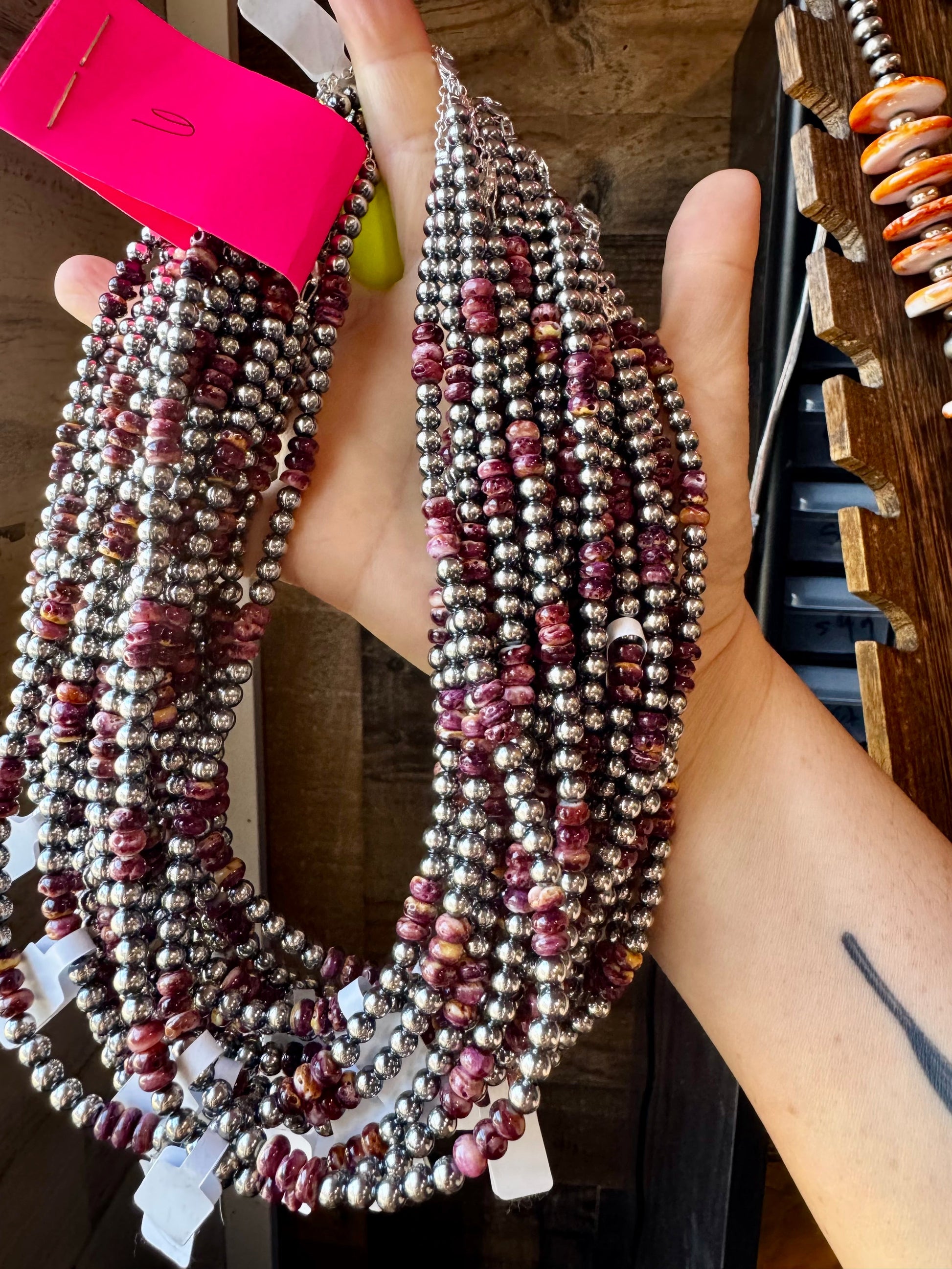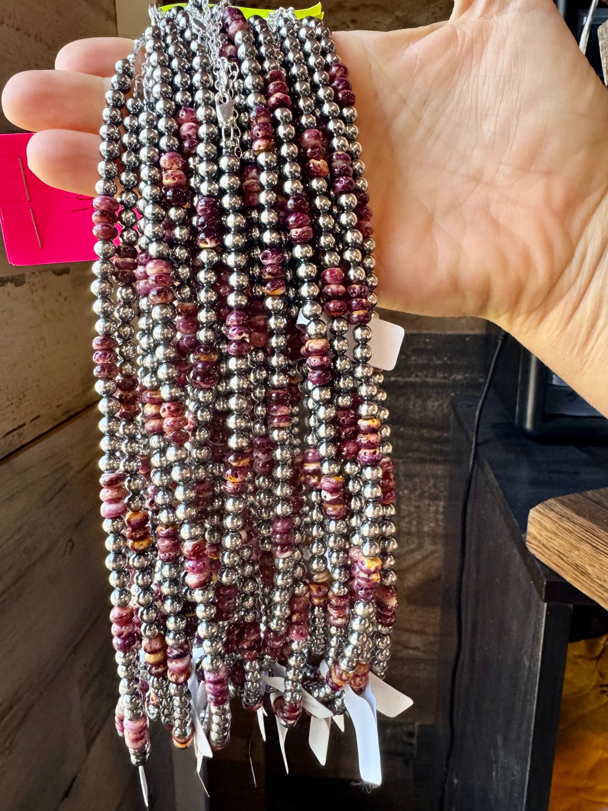 This handcrafted 18-inch necklace features 5mm sterling silver pearls paired with rich, deep purple spiny oyster beads. Finished with a 2-inch sterling silver extender for easy layering, this piece is bold, rare, and made to stand out.