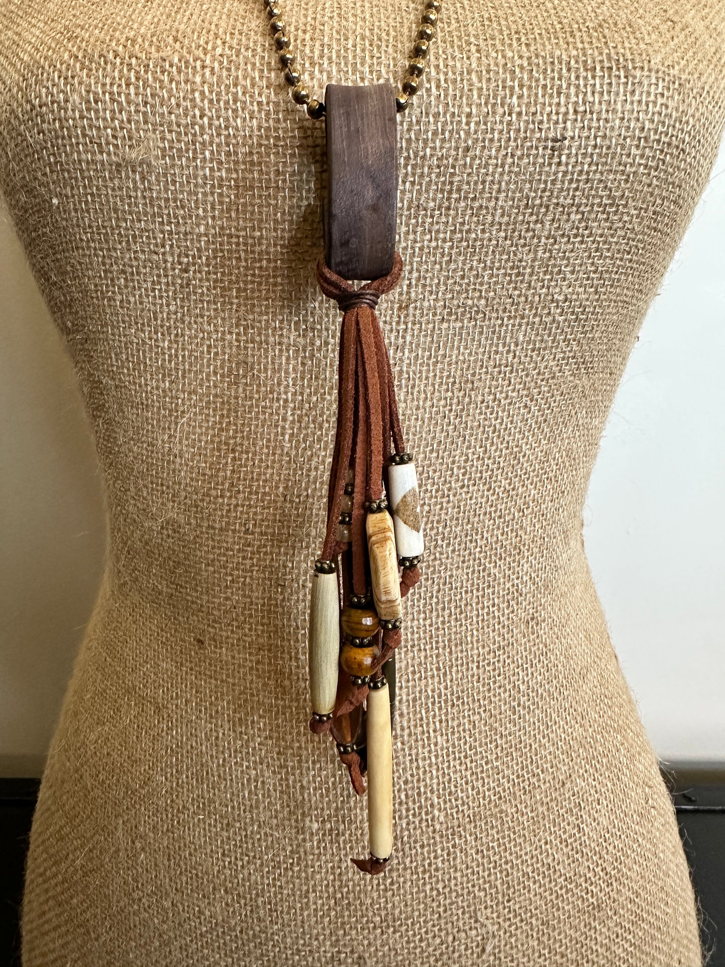 29" ball chain and 7" drop tassel made of leather, horn and bone.