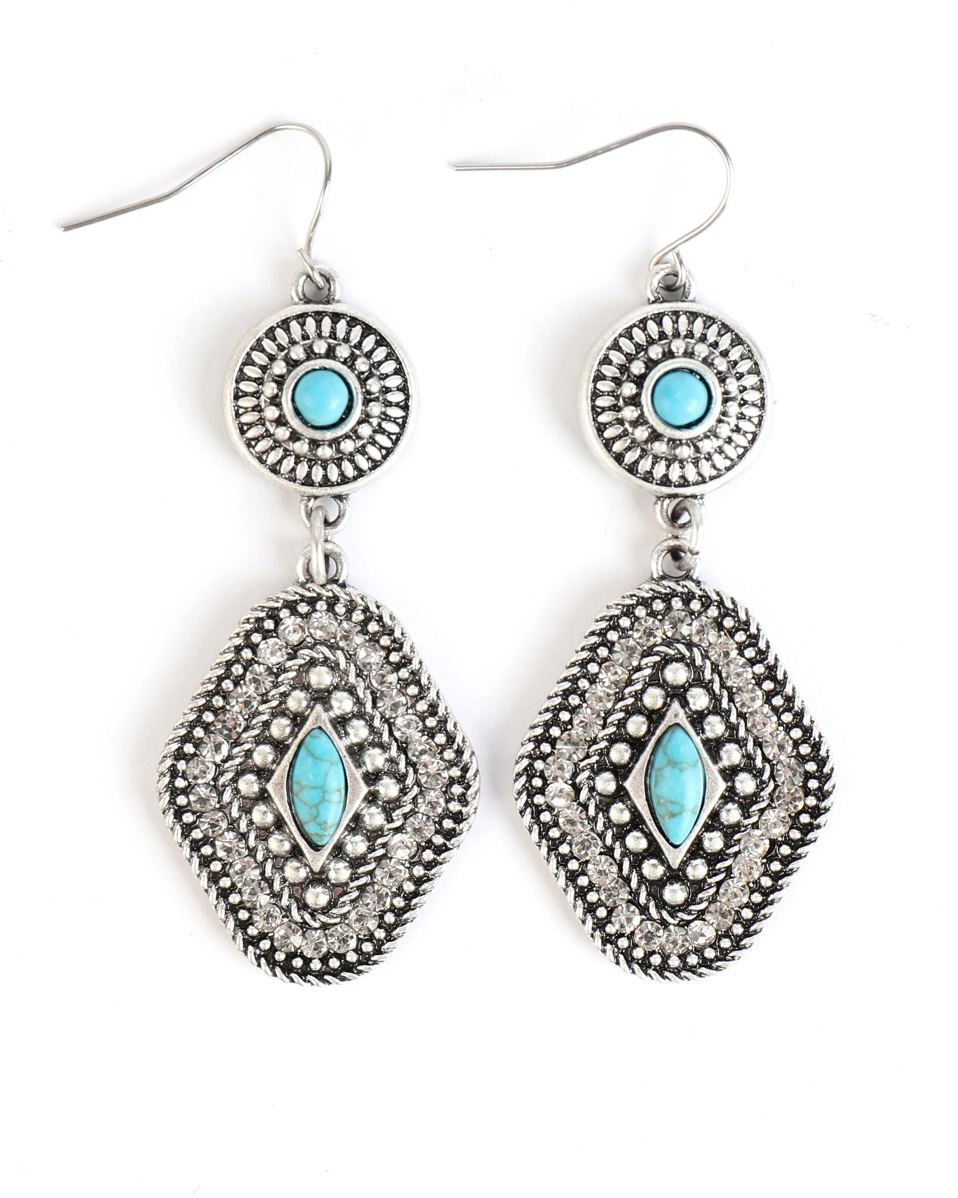 - Each medallion is accented with a turquoise center and a rhinestone outline