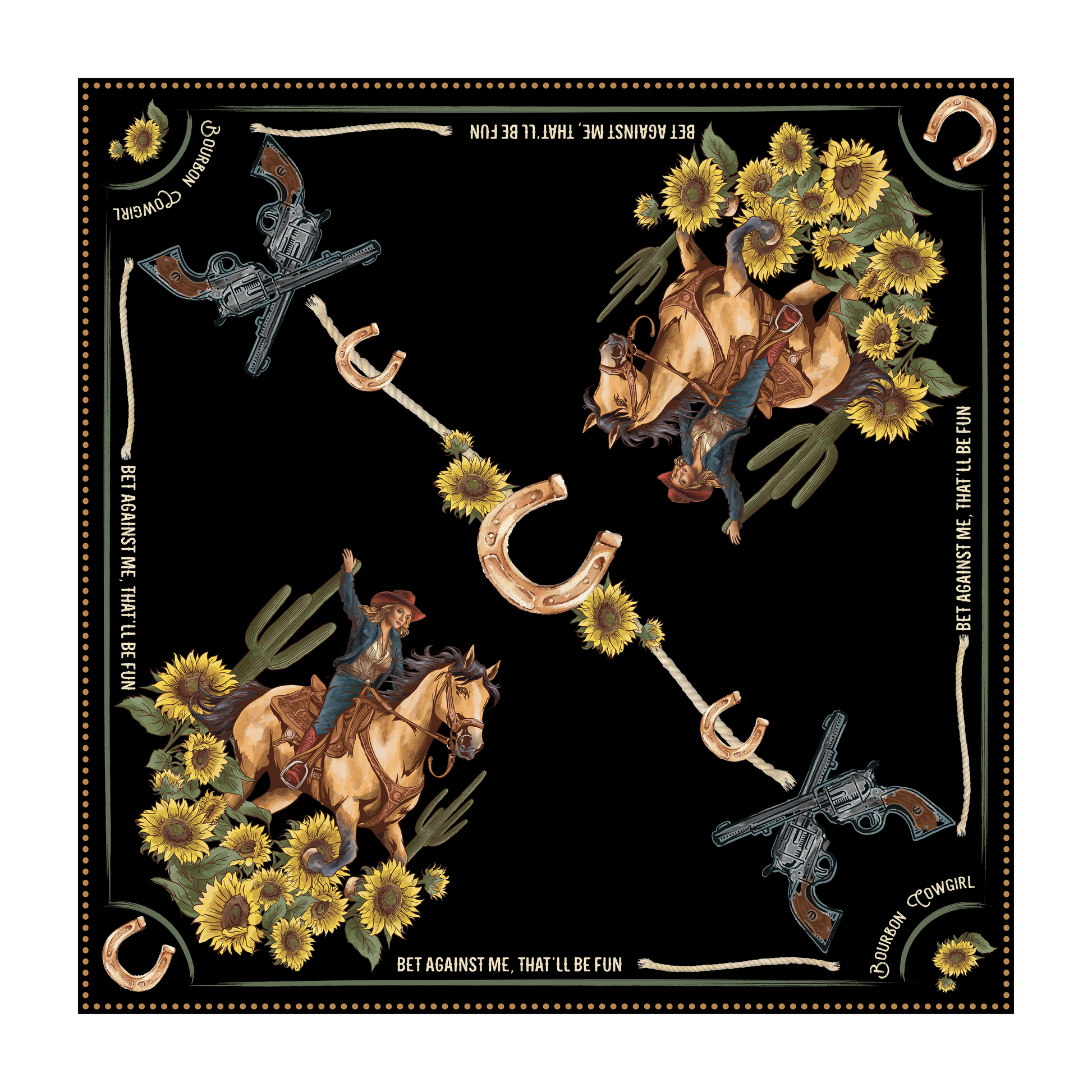 Bet Against Me That'll Be Fun Wild Rag Scarf in black by Bourbon Cowgirl. Introducing our very own wildrag designed by Sherri Blum, the founder of Bourbon Cowgirl. This stunning women's scarf is made from 100% silk, measuring approximately 26" x 26". Its unique design featuring a cowgirl on her rearing buckskin horse and dueling pistols make it a standout piece in any western accessory collection. Bet Against Me, That'll Be Fun is boldly expressed around the edges of the scarf. Add this versatile piece to your western style wardrobe and stand out in the crowd as the spirited woman you are. Every cowgirl needs a proper rodeo wildrag to show off her free spirit and cowgirl attitude. Bourbon Cowgirl has you covered.