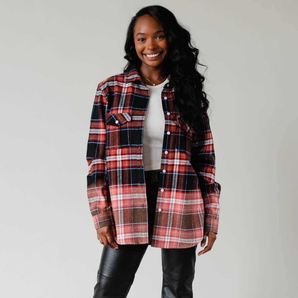 Black, rust & blue plaid flannel with bleached dipped contrast. Cowgirls love a cozy flannel for hanging out at the campfire, horseback riding and date night. The perfect shirt to take you through fall and winter.