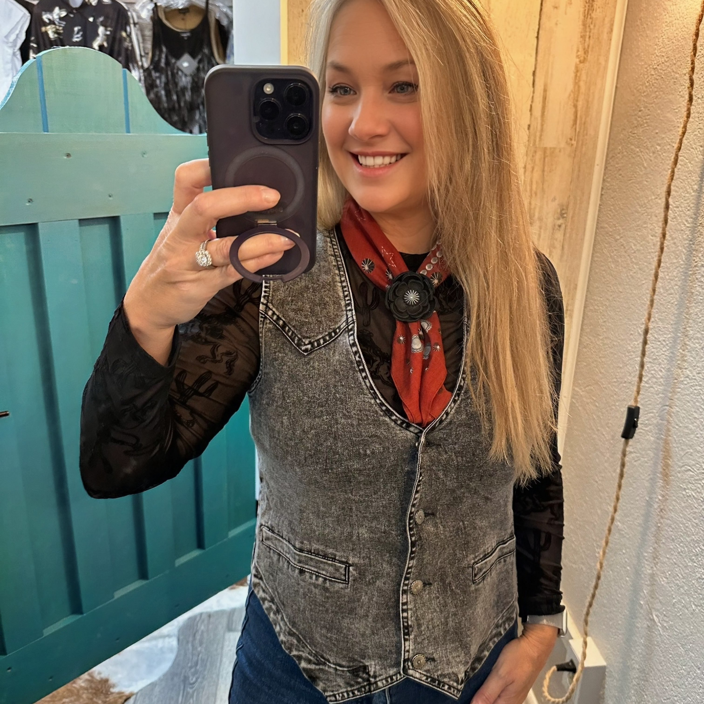 Black Wash Denim Button Down Western Yoke Vest Bourbon Cowgirl