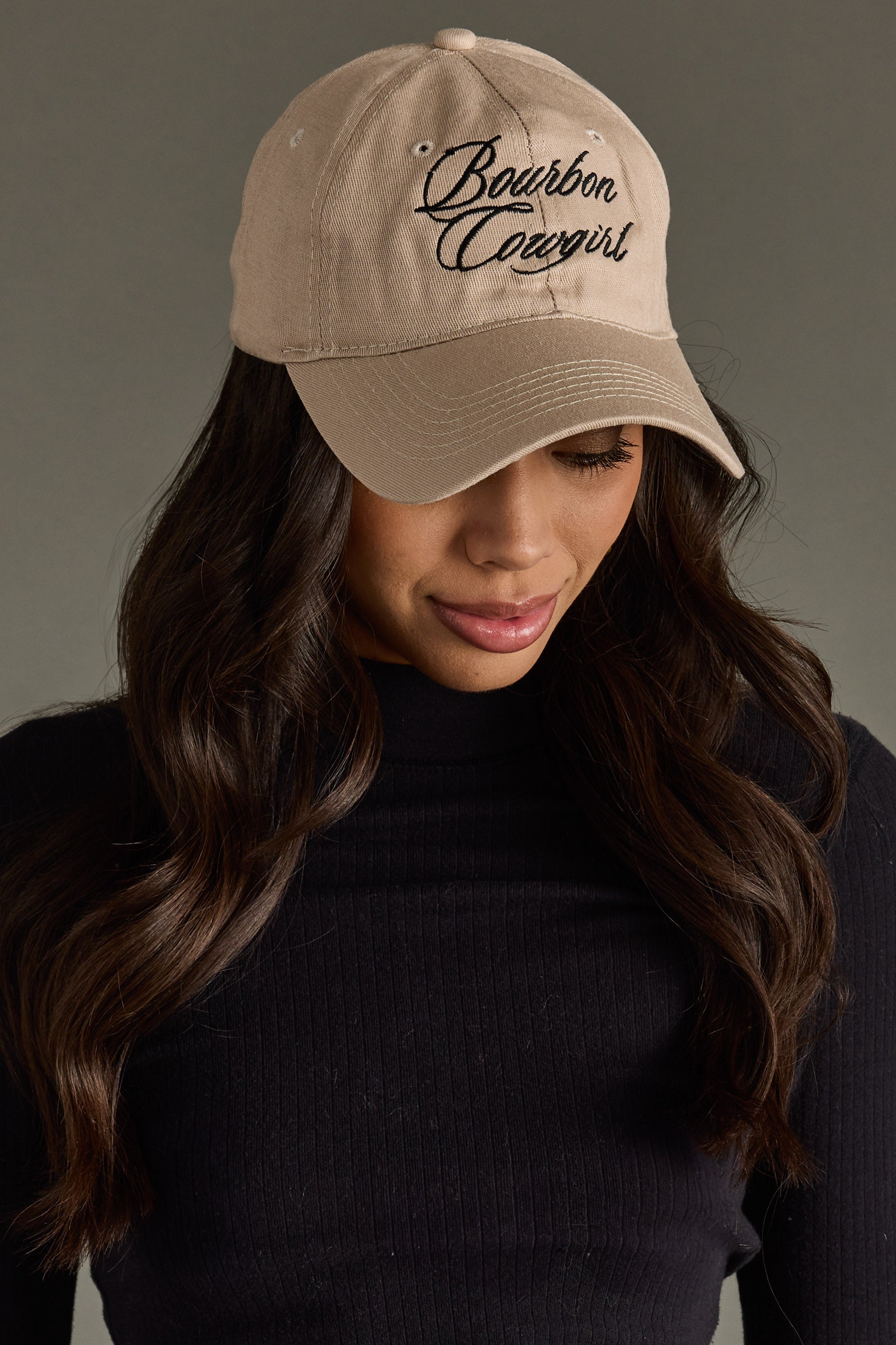Bourbon Cowgirl Script Embroidered Baseball Hat -Tan