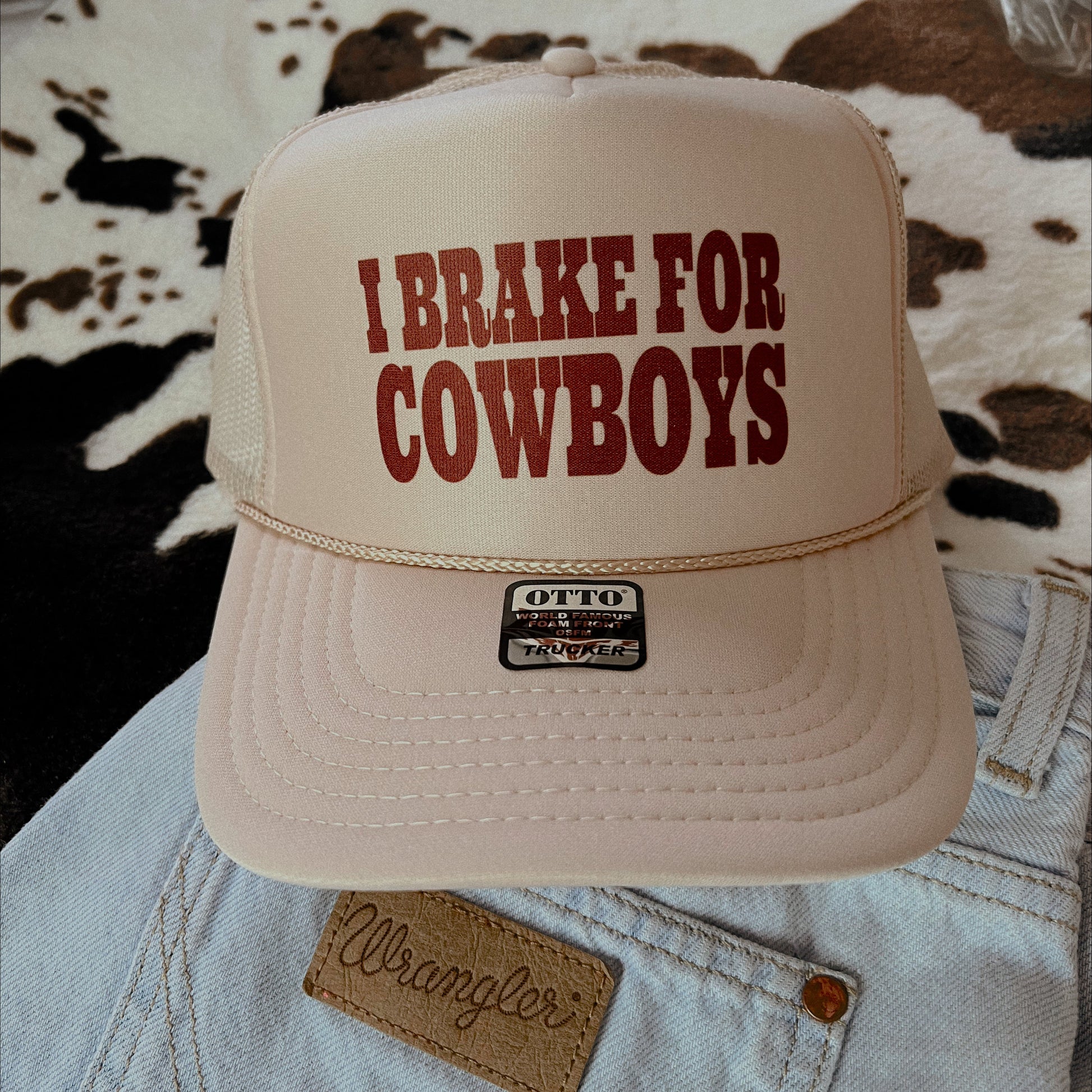 I Brake for Cowboys Trucker Hat. Printed design. Foam hat.