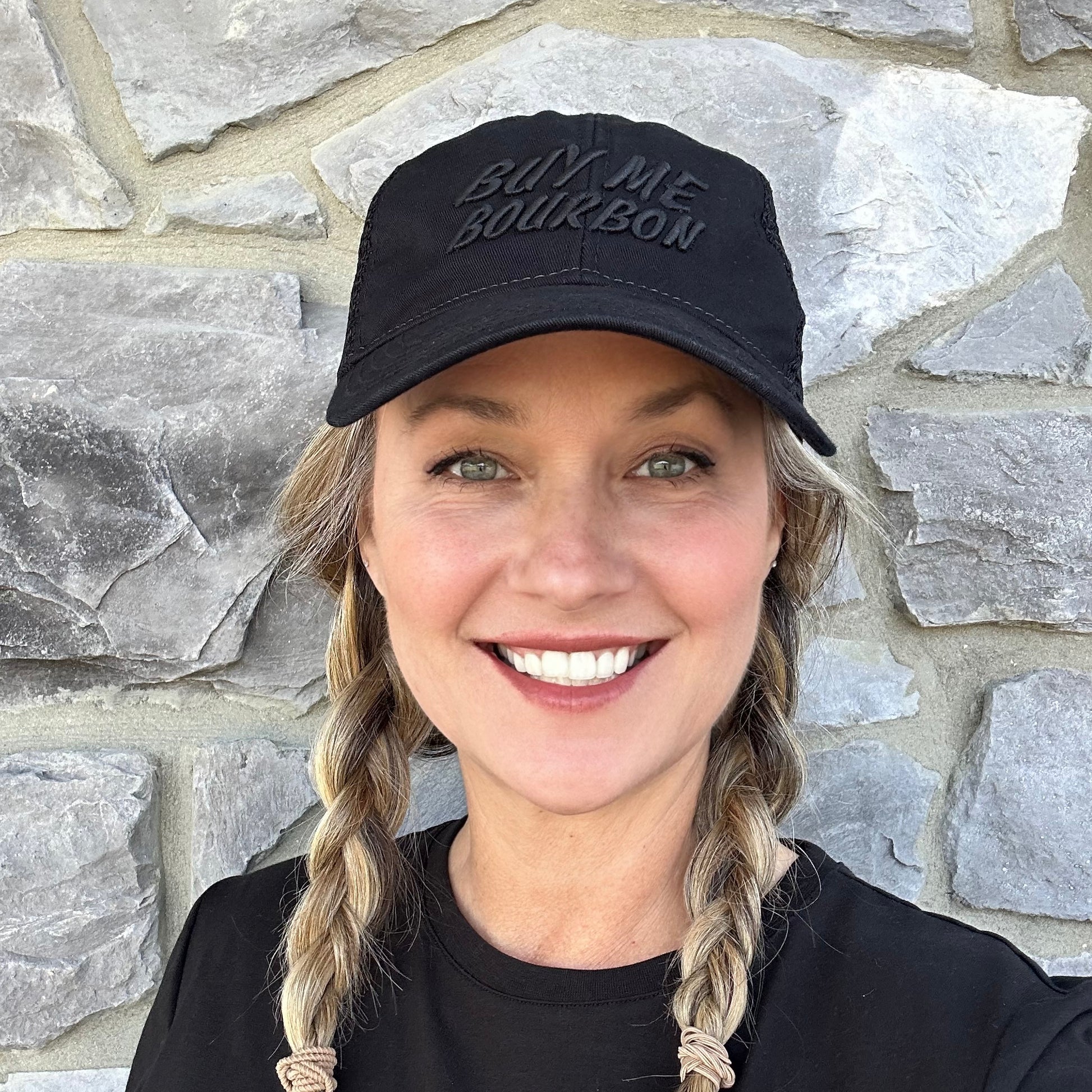 BUY ME BOURBON Embroidered Trucker Hat. This trucker features puff embroidery in black on black to deliver a not-so-subtle message in an understated way. This hat will be your favorite country music festival or rodeo hat. Shop trucker caps at Bourbon Cowgirl. If you know a woman who loves bourbon, she's going to want this hat.