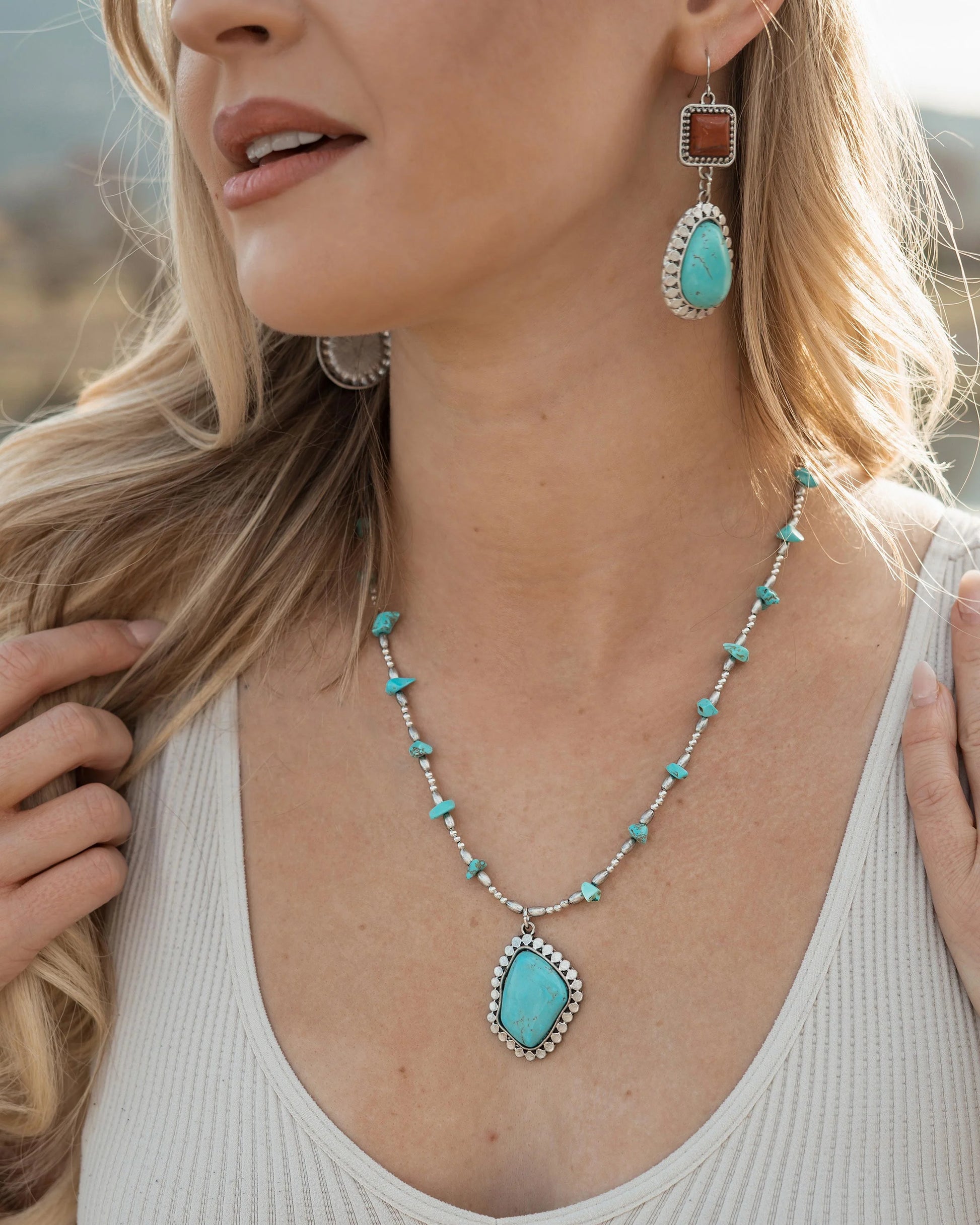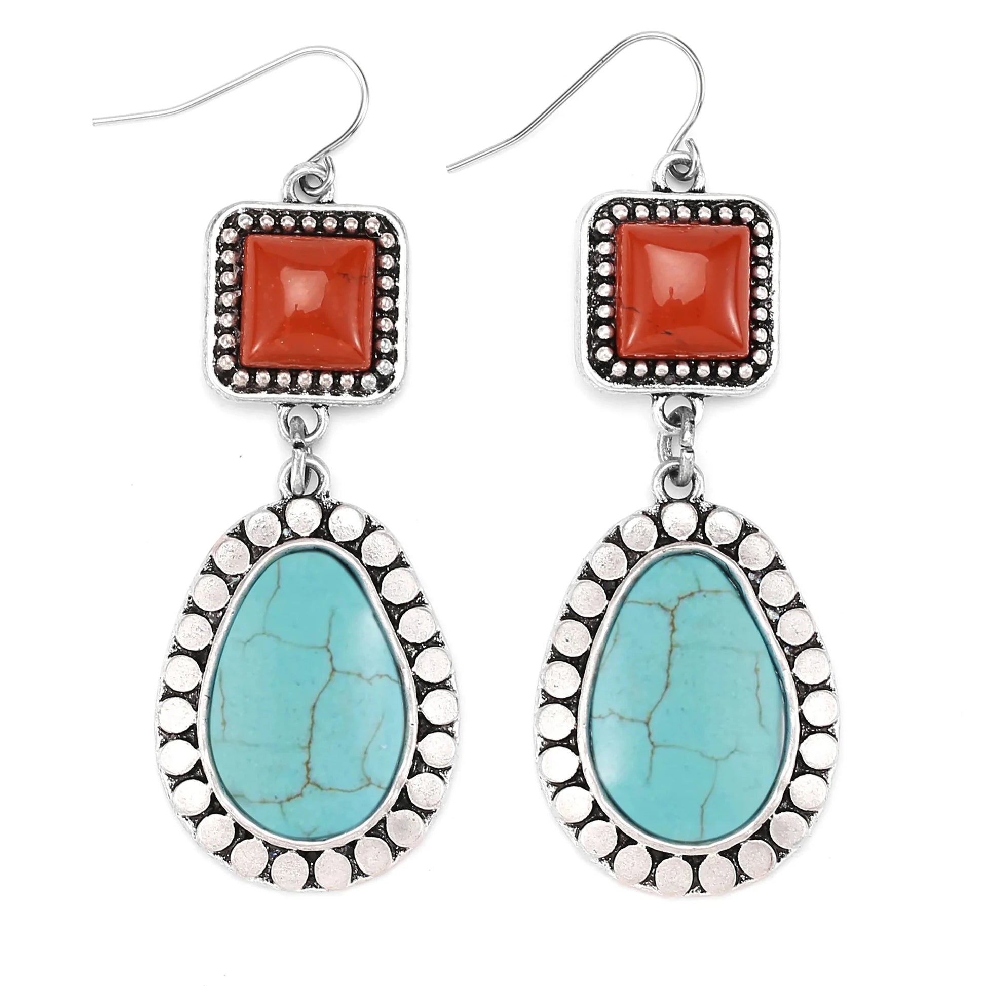 Silver earrings that pair a bold square red jasper stone with a teardrop-shaped howlite turquoise