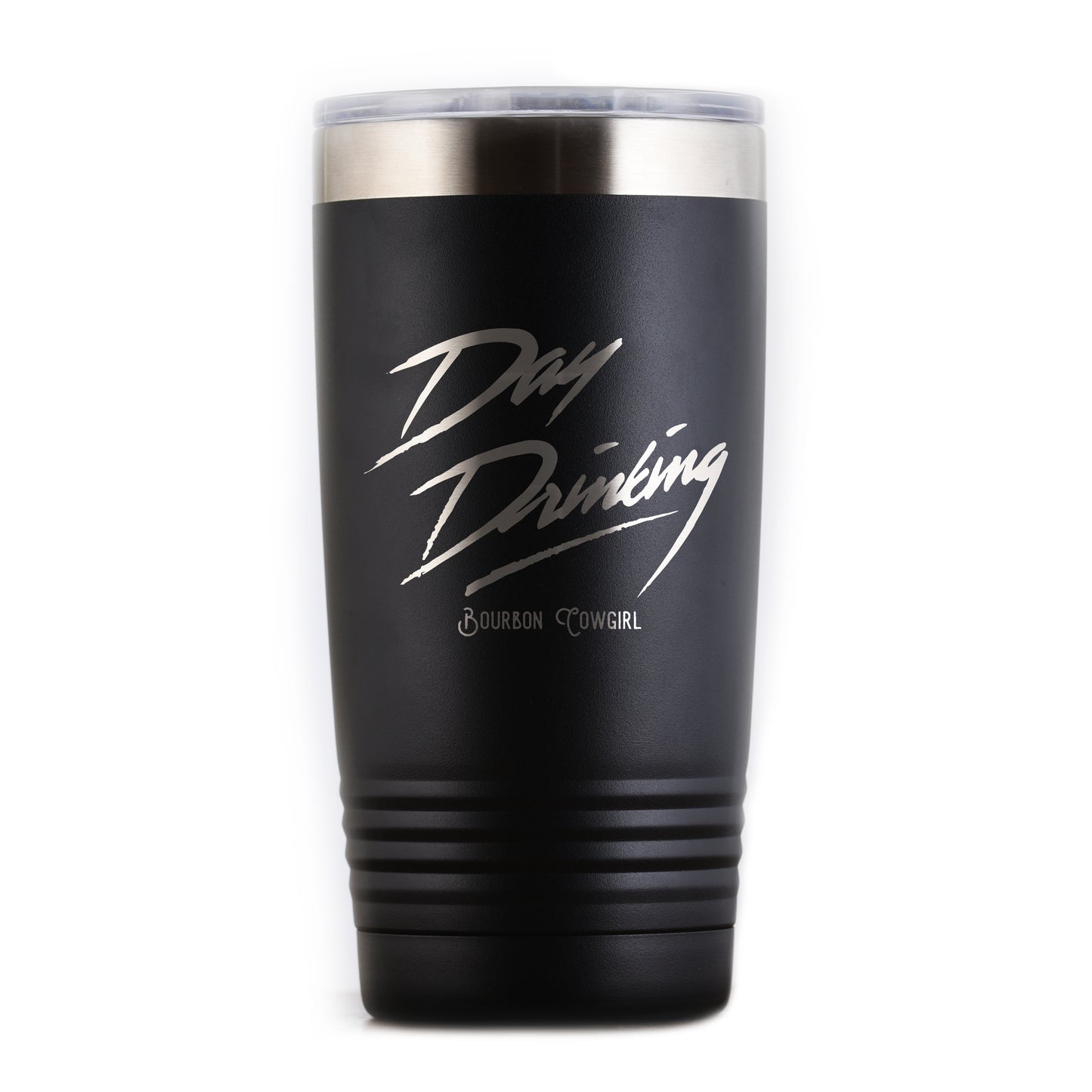 Day Drinking Engraved Travel Tumbler. 20 ounce vacuum insulated ring neck Polar Camel travel tumbler for your beer, wine, cocktail and booze loving best friends. Our travel tumbler is perfect for hot coffee or cold beverages on the run and has a narrower bottom to fit most cup holders in your car, jeep or truck. The opening in the lid is also big enough for a straw!  We selected these Polar Camel 20 oz. ringneck vacuum insulated travel mugs for their high quality and durability. We engrave our unique, funny and clever quotes and designs into the powder coated travel tumbler, which creates the design in a sleek stainless steel finish.
