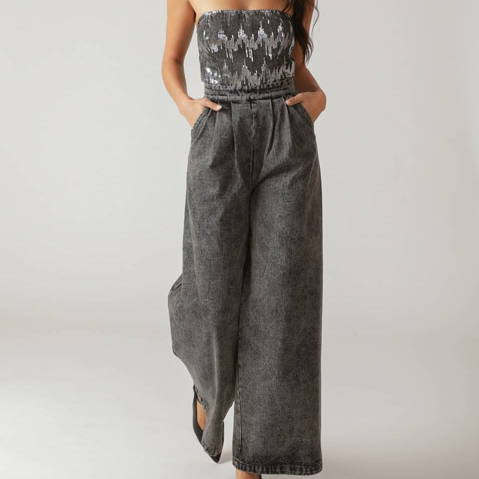 A washed denim jumpsuit featuring sequin denim tube top, washed denim pant with pleats and side pocket and back zipper closure