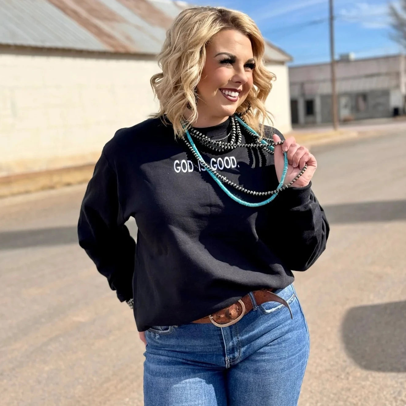All the time, GOD IS GOOD. So simple. So powerful. White embroidered lettering. Shown on a Port & Company black crew neck sweatshirt.