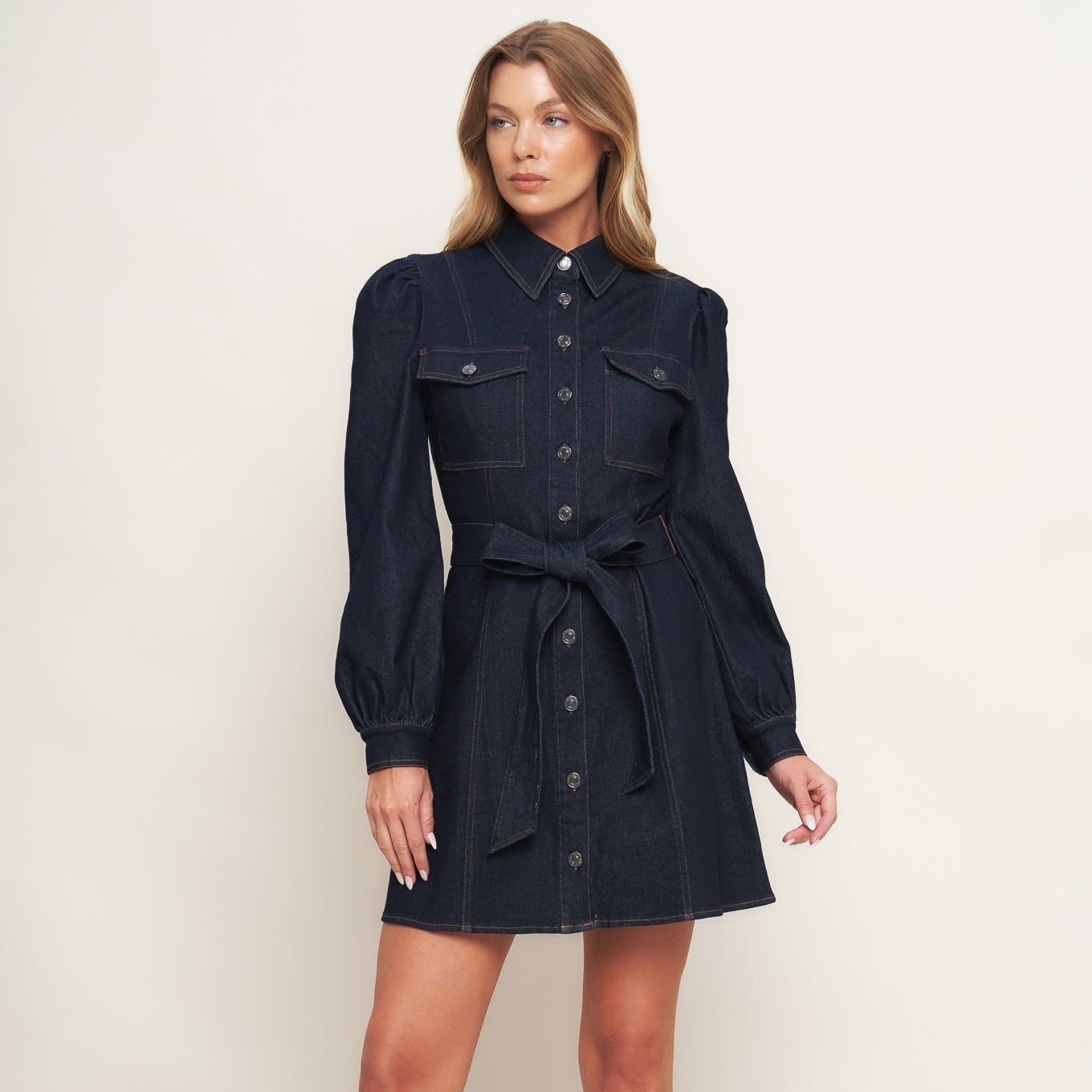 A denim mini dress featuring collar, long sleeve, front pocket, button down closure and self sash tie
