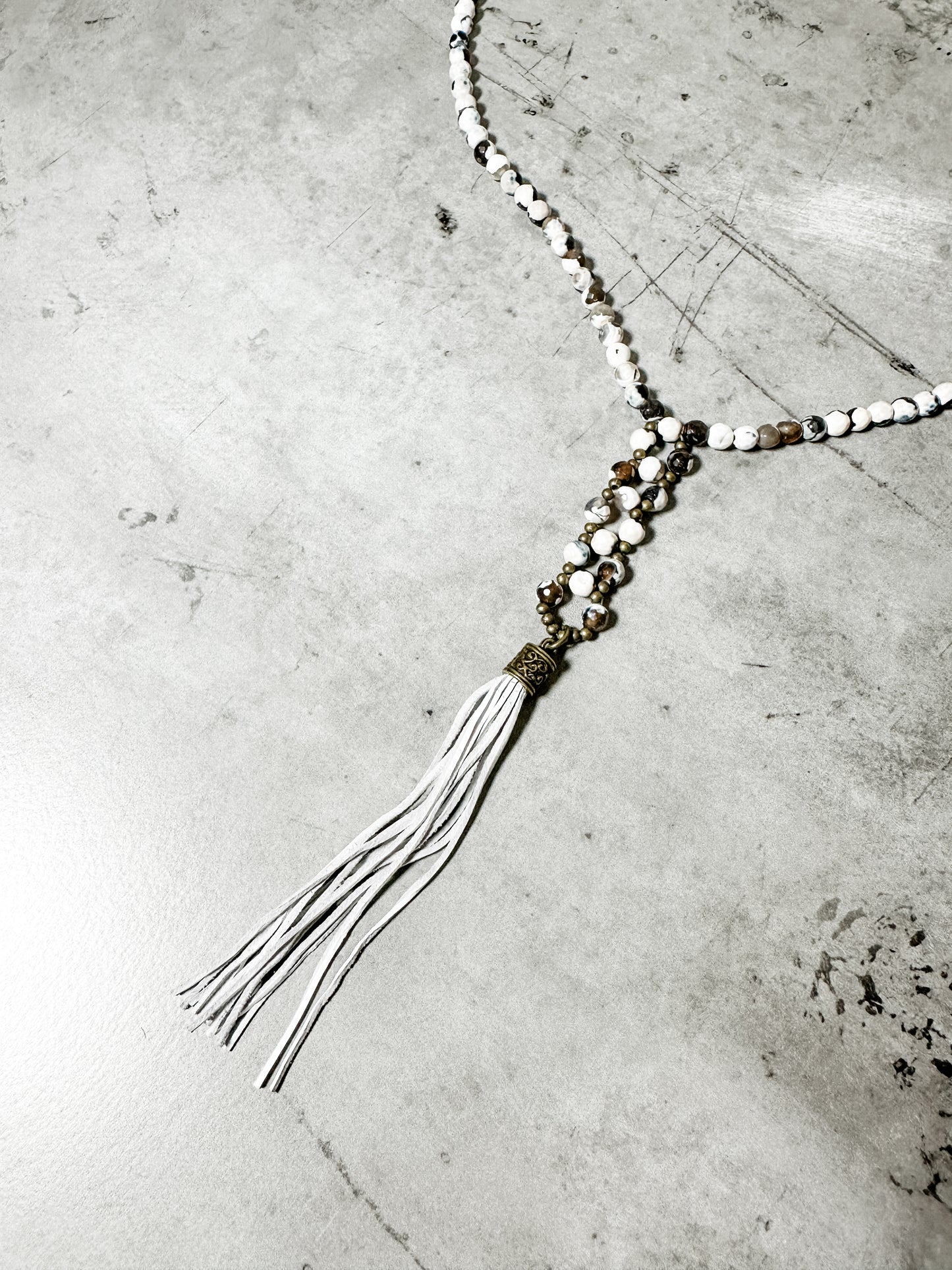 Howlite and agate beads with white leather tassel. 32" total length.