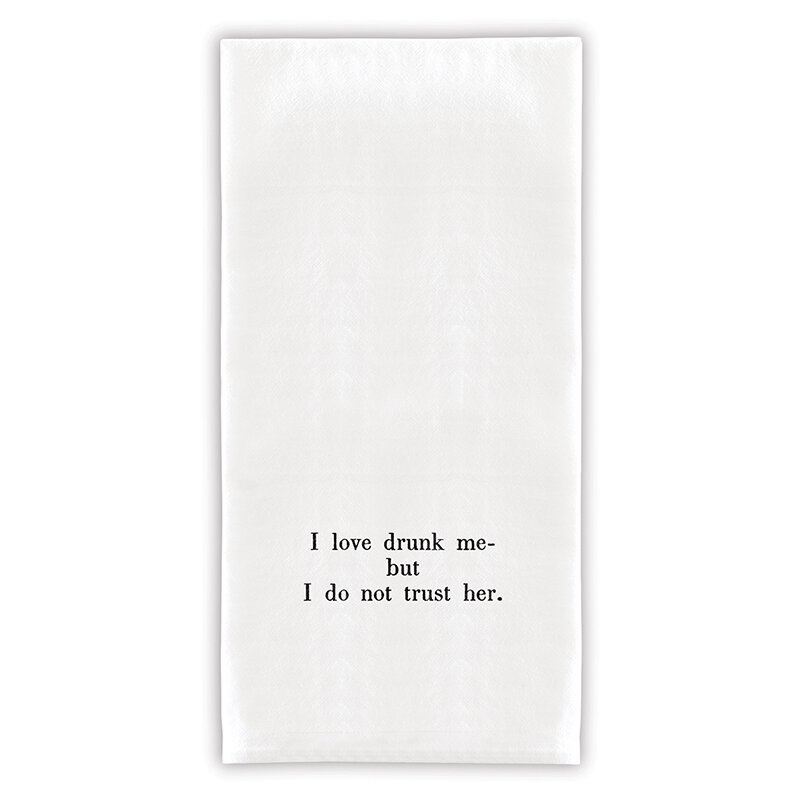 I Love Drunk Me, But I Do Not Trust Her Towel. A great towel is hard to find, but not anymore! Our tea towels are super absorbent, soft to the touch and gentle on glassware. Perfect for kitchen, bathroom, or everyday use. Simply hang to dry using the attached corner loop.