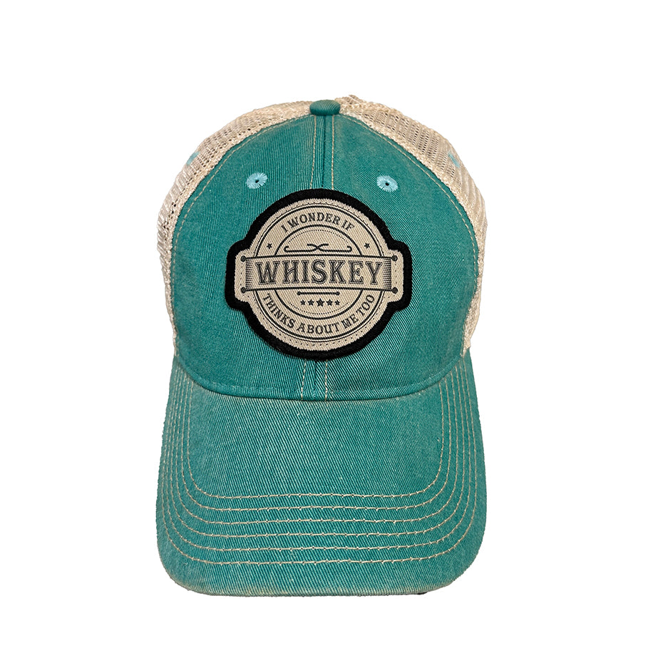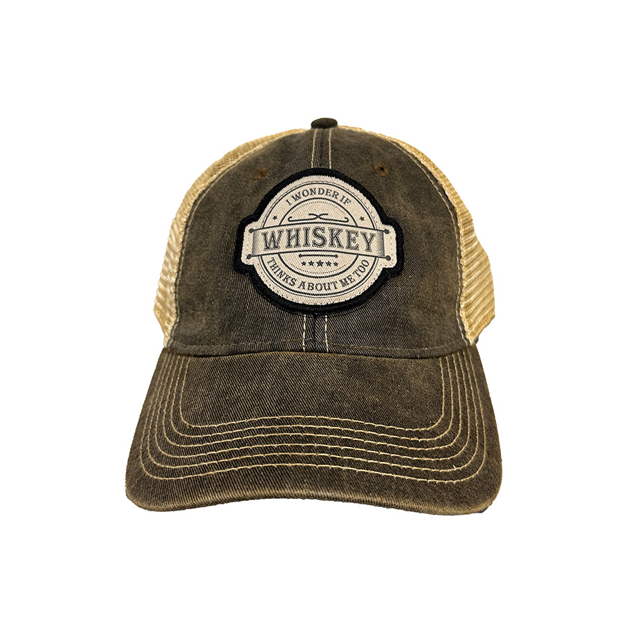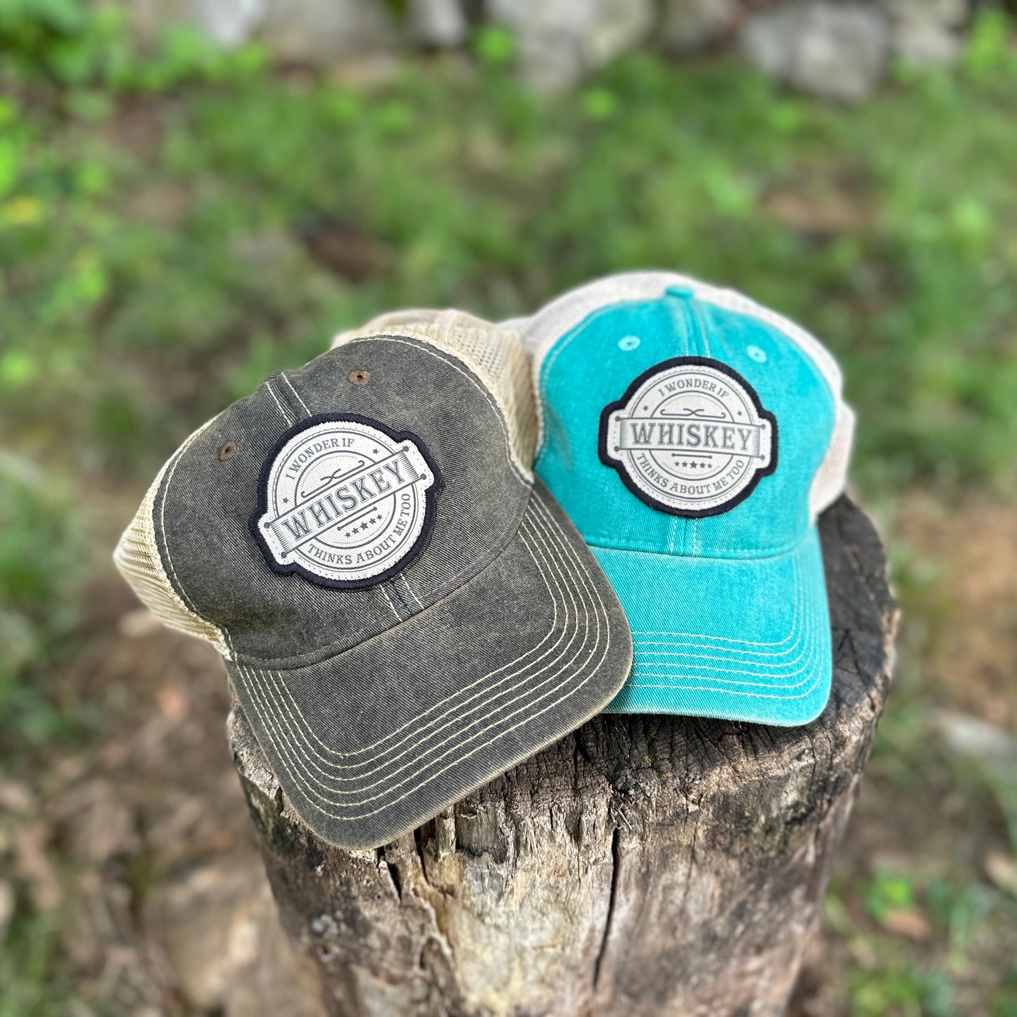 I Wonder if Whiskey Thinks About Me Too distressed trucker hat gift for the whiskey lover. This funny gift for the spirited woman who loves bourbon, scotch and whiskey, will be her new favorite go-to hat year round.