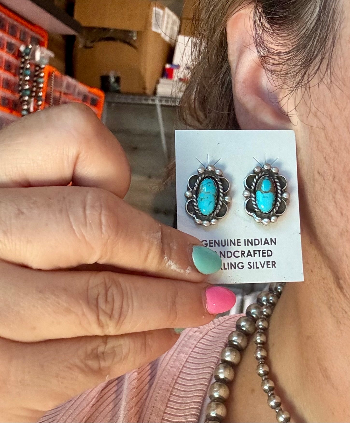 Handmade in the USA by Native artist L. Silversmith, these stud earrings feature detailed sterling silver pearls paired with genuine Kingman turquoise. Stamped for authenticity, each earring is slightly unique due to the natural turquoise stones. Lightweight and comfortable, they’re perfect for daily wear while adding a touch of bold Southwestern style.