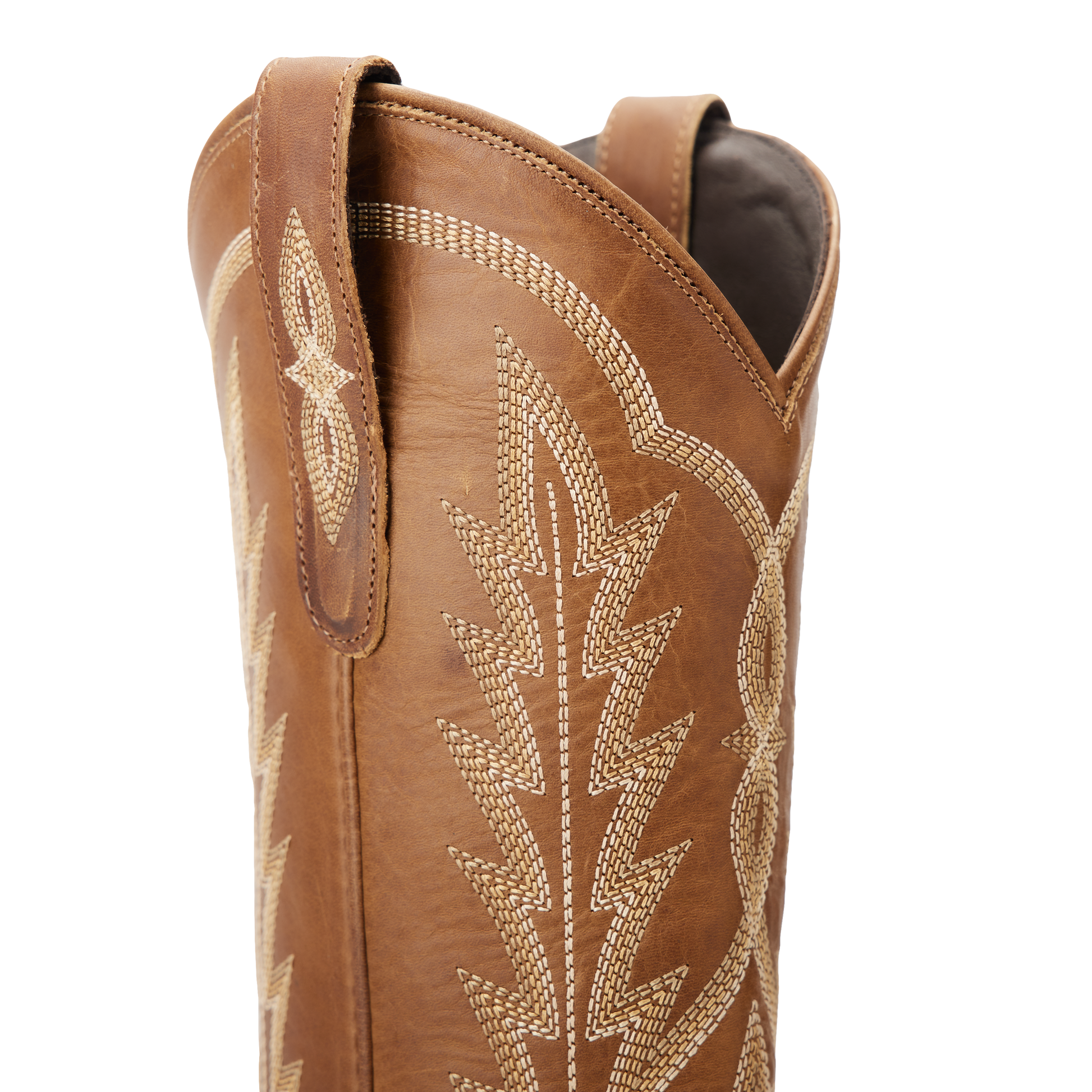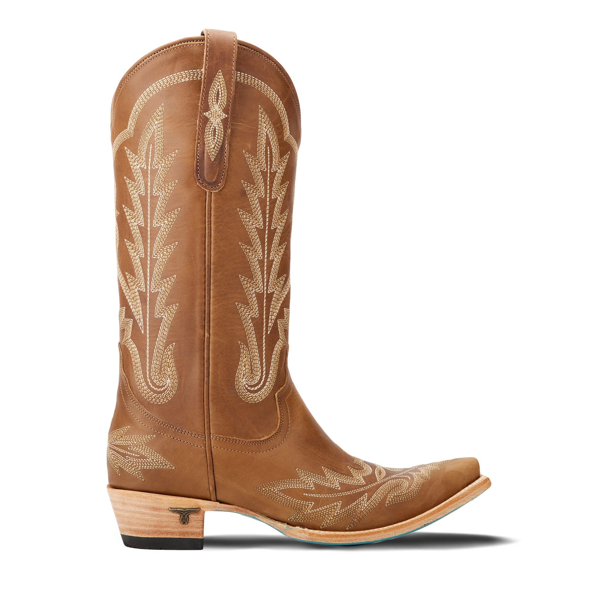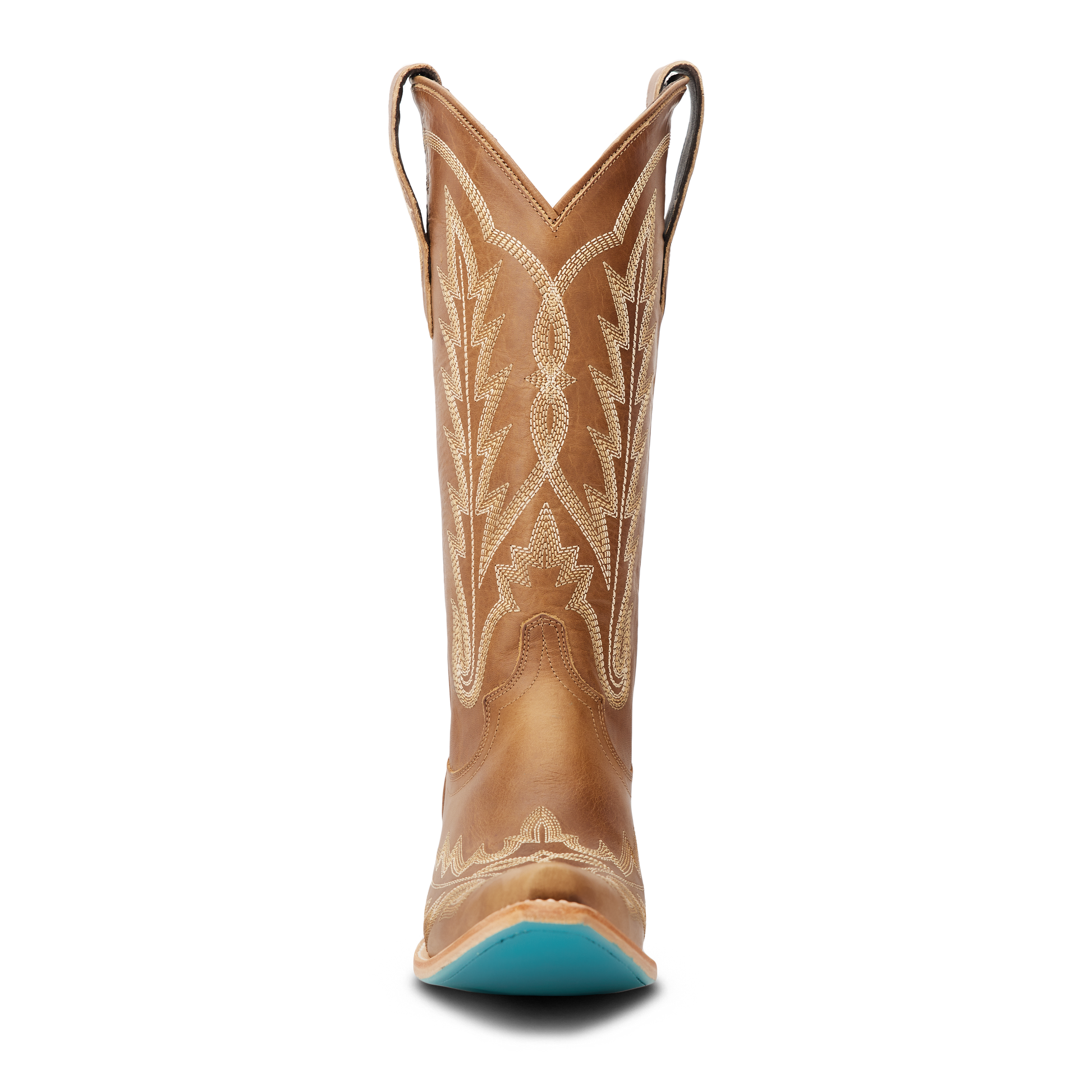 She's the perfect tan cowgirl boot. Heirloom quality with a western vibe. The classic snip toe profile is embroidered to perfection with a twist on traditional flame stitch. Her saddle finish makes it a perfect fit for everyday to girl's night out.