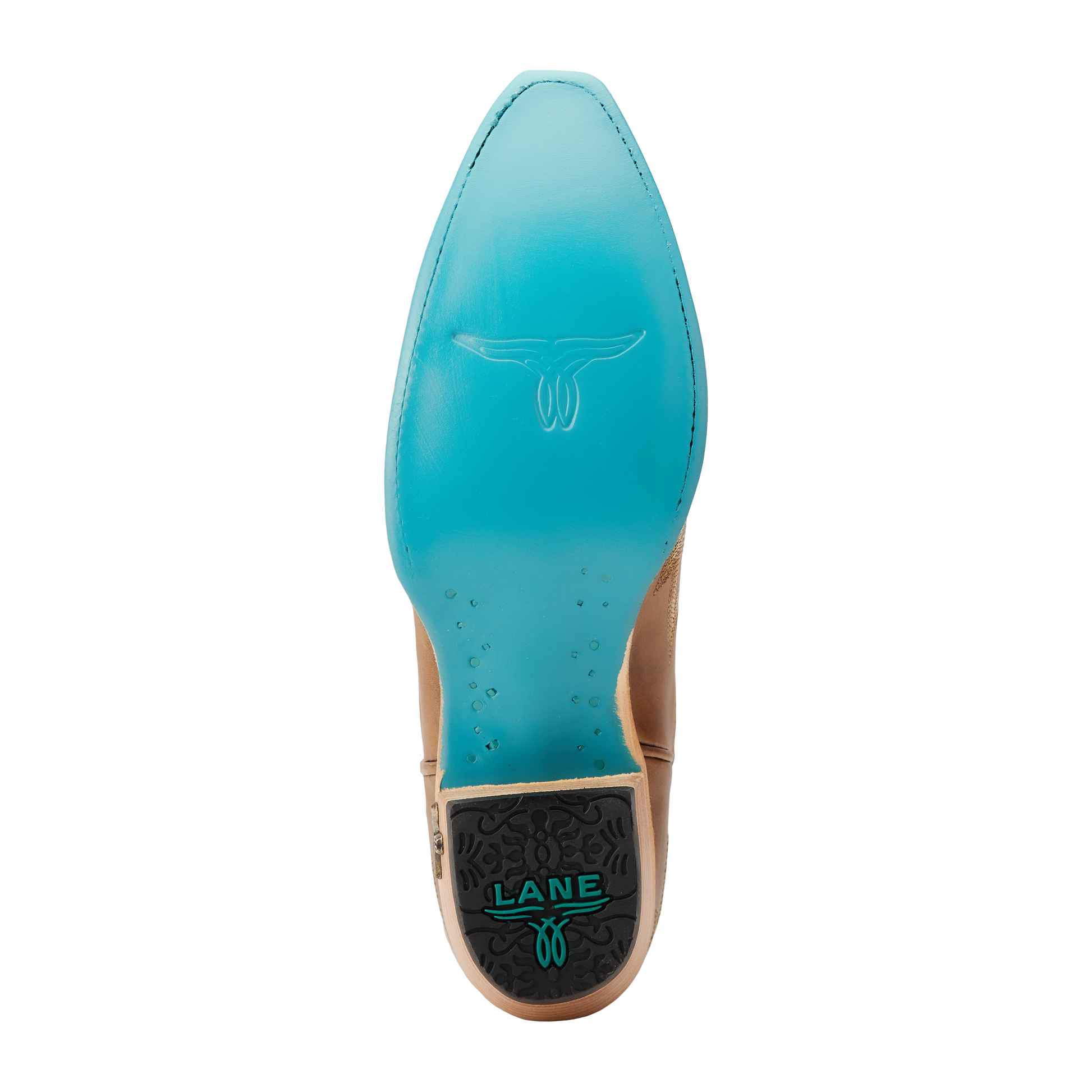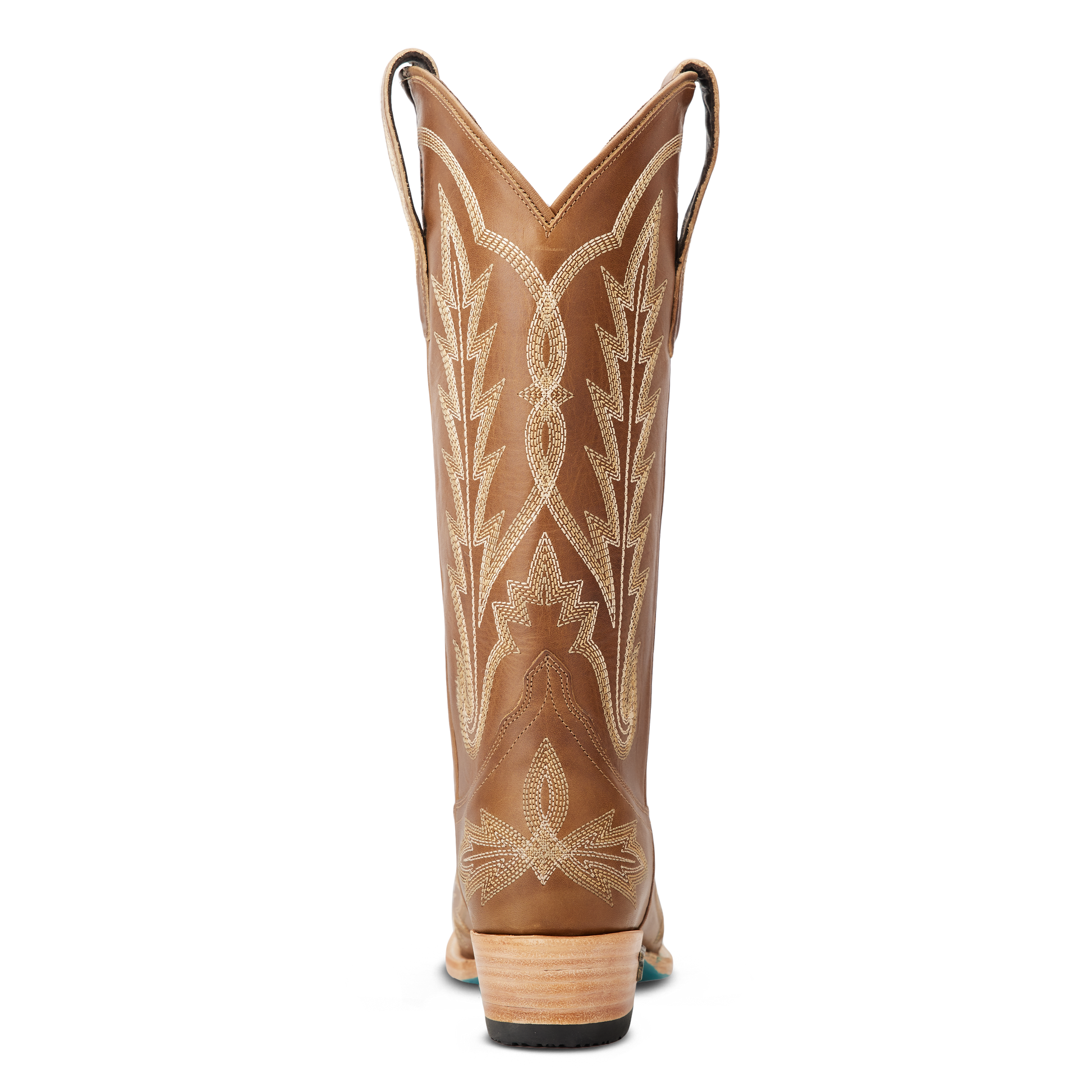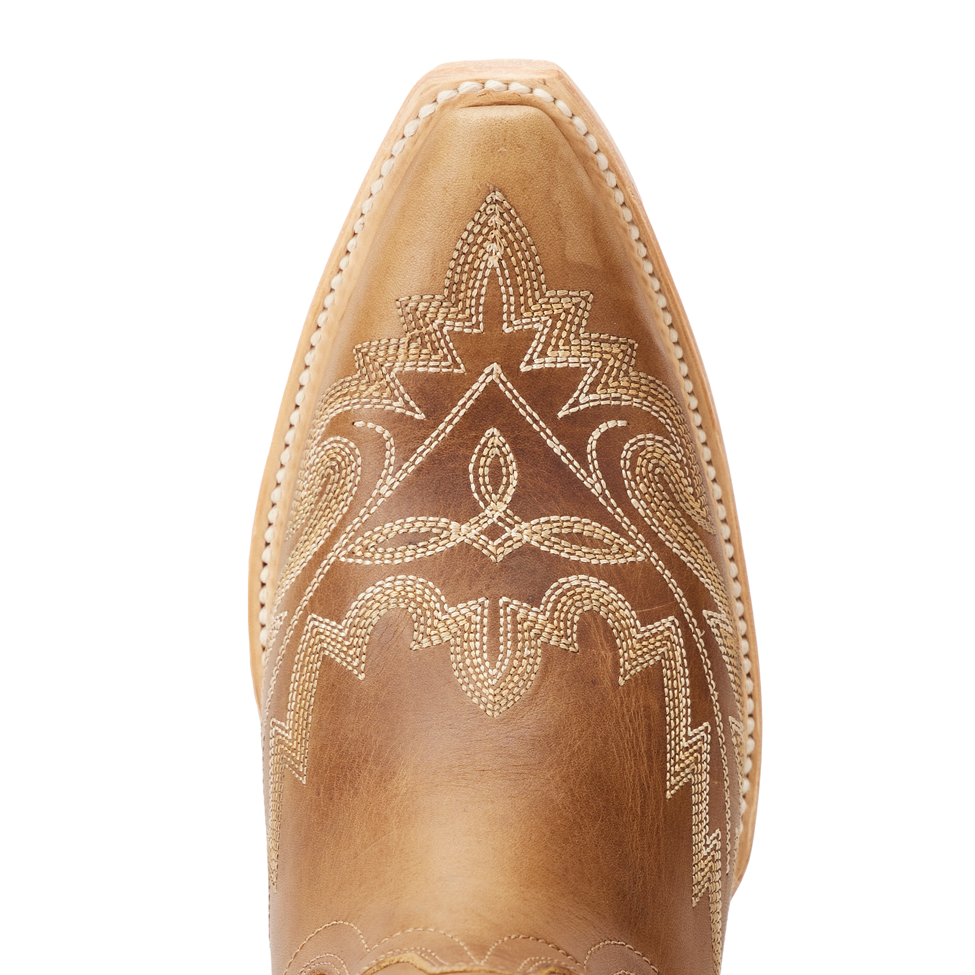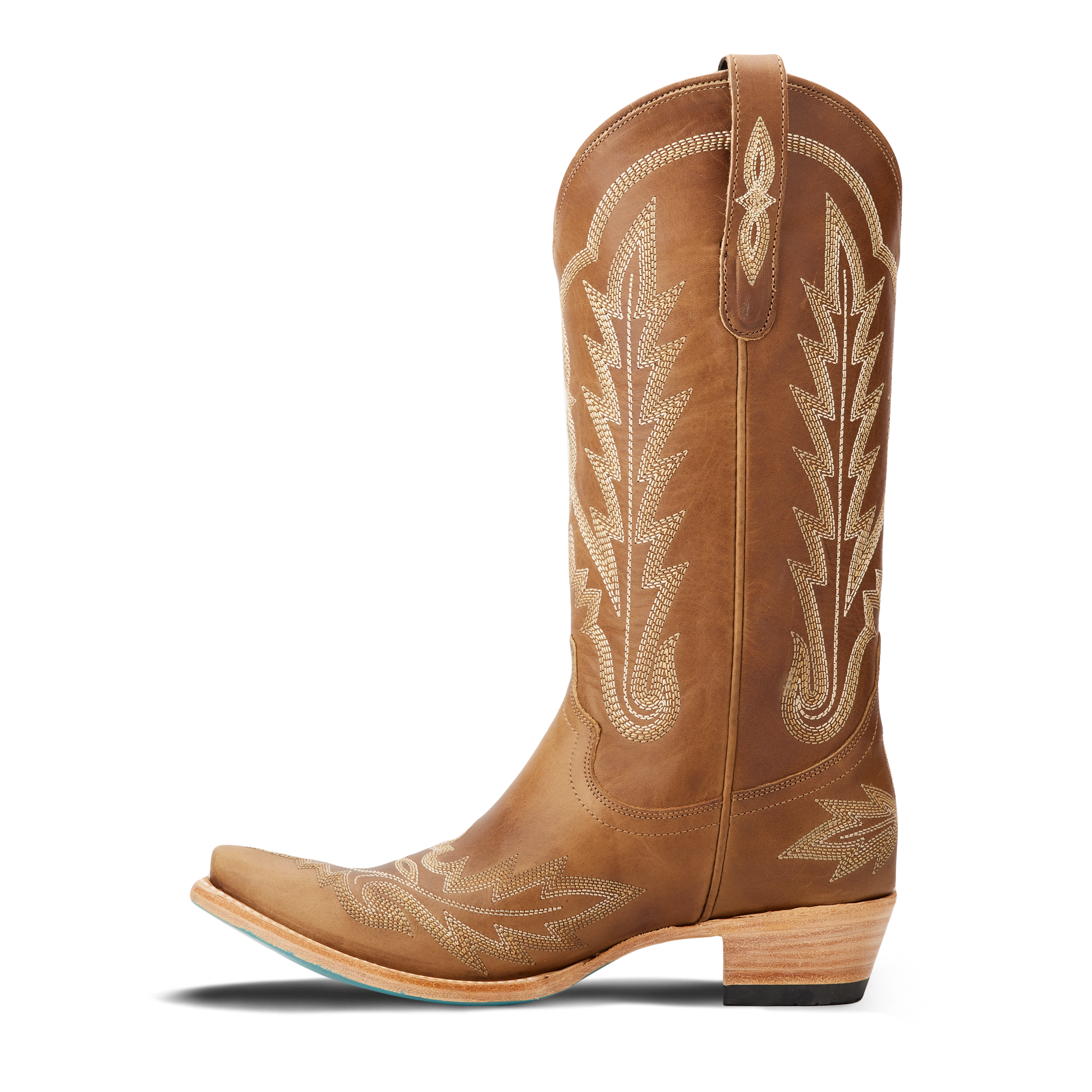 She's the perfect tan cowgirl boot. Heirloom quality with a western vibe. The classic snip toe profile is embroidered to perfection with a twist on traditional flame stitch. Her saddle finish makes it a perfect fit for everyday to girl's night out.