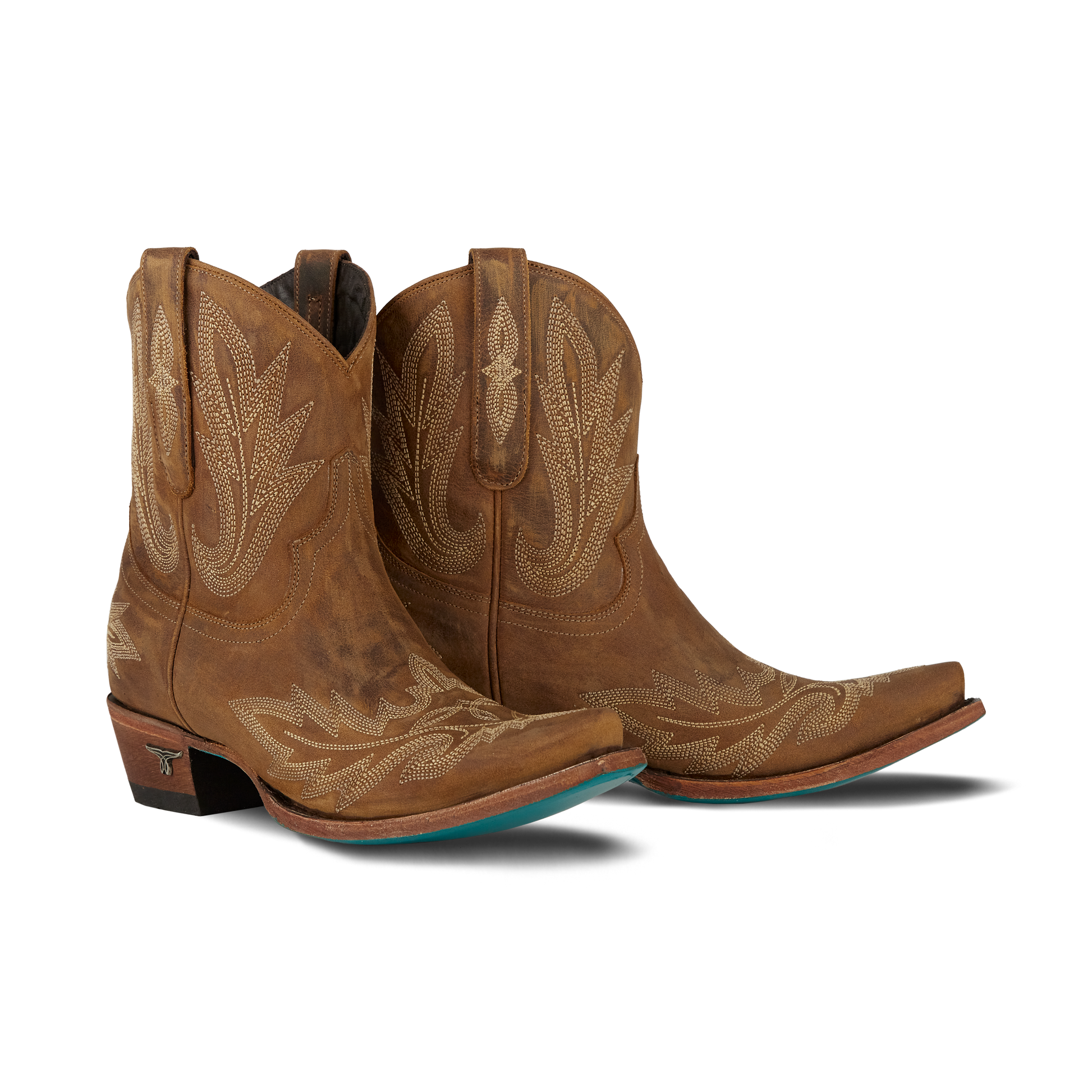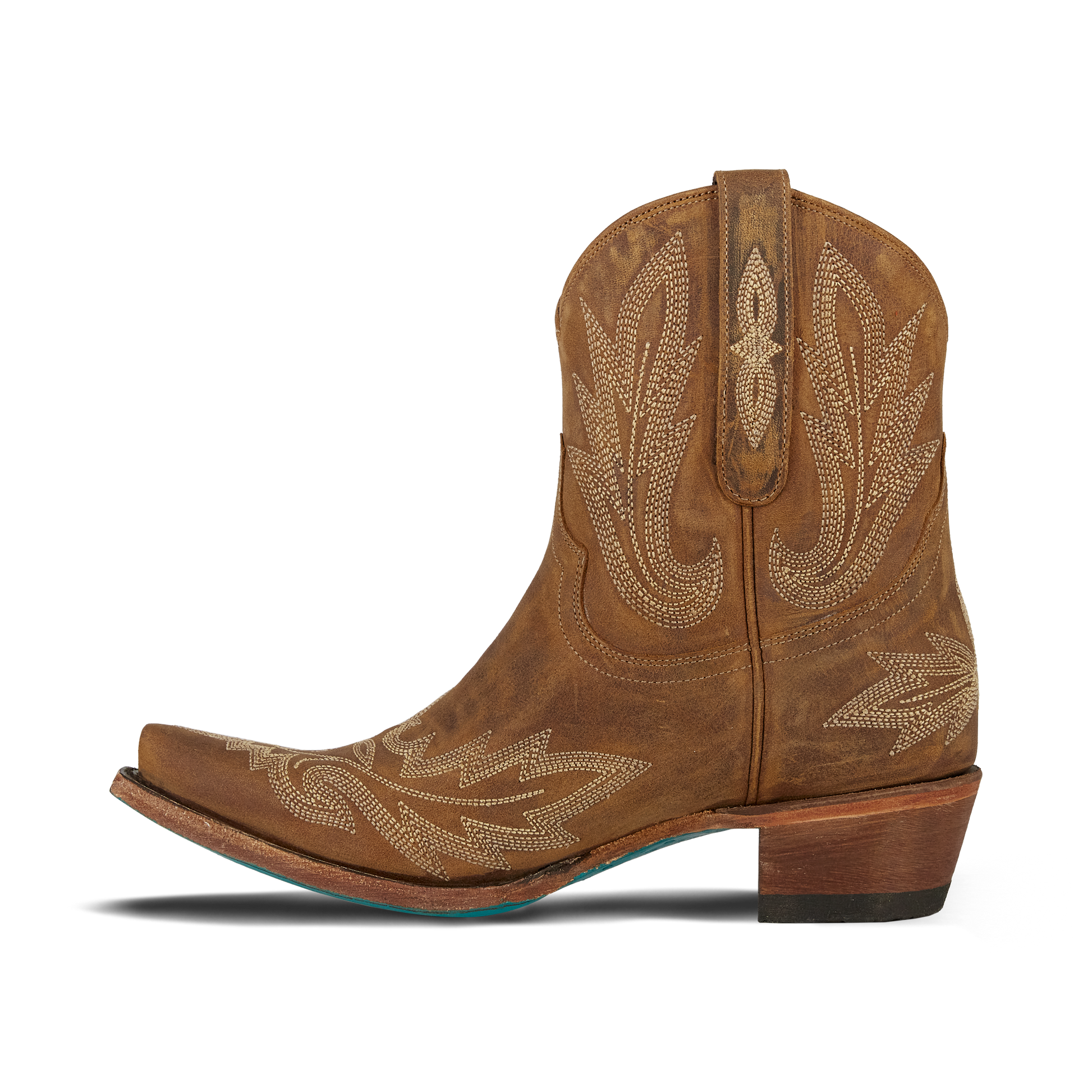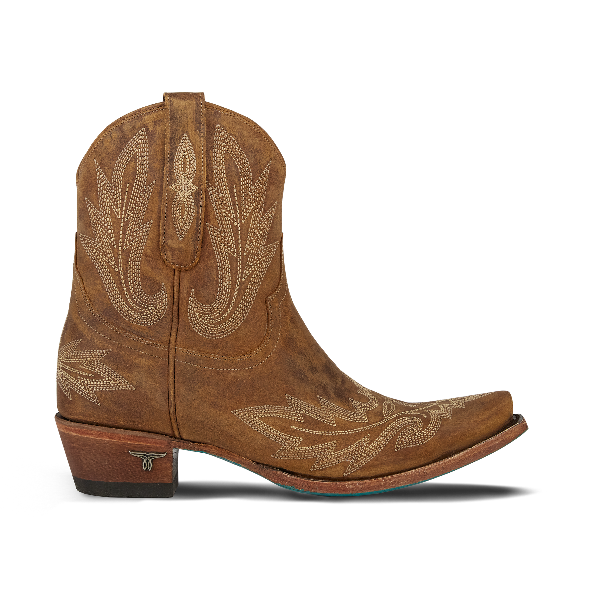 Heirloom quality ankle boots with a western influence. The classic snip toe profile is embroidered to perfection with a twist on traditional flame stitch in bootie form. She's short, sweet, and just the right height to pair well with your wardrobe.