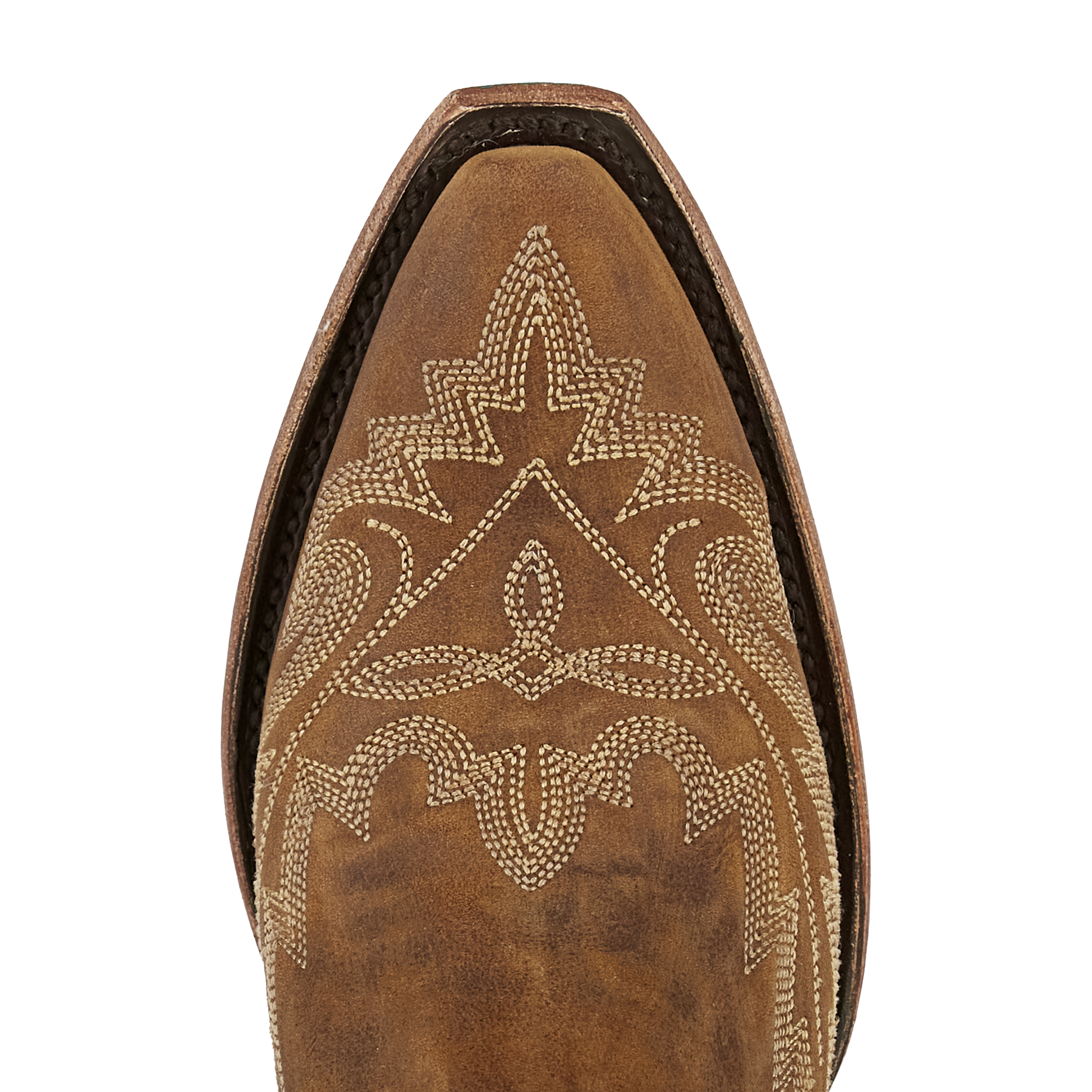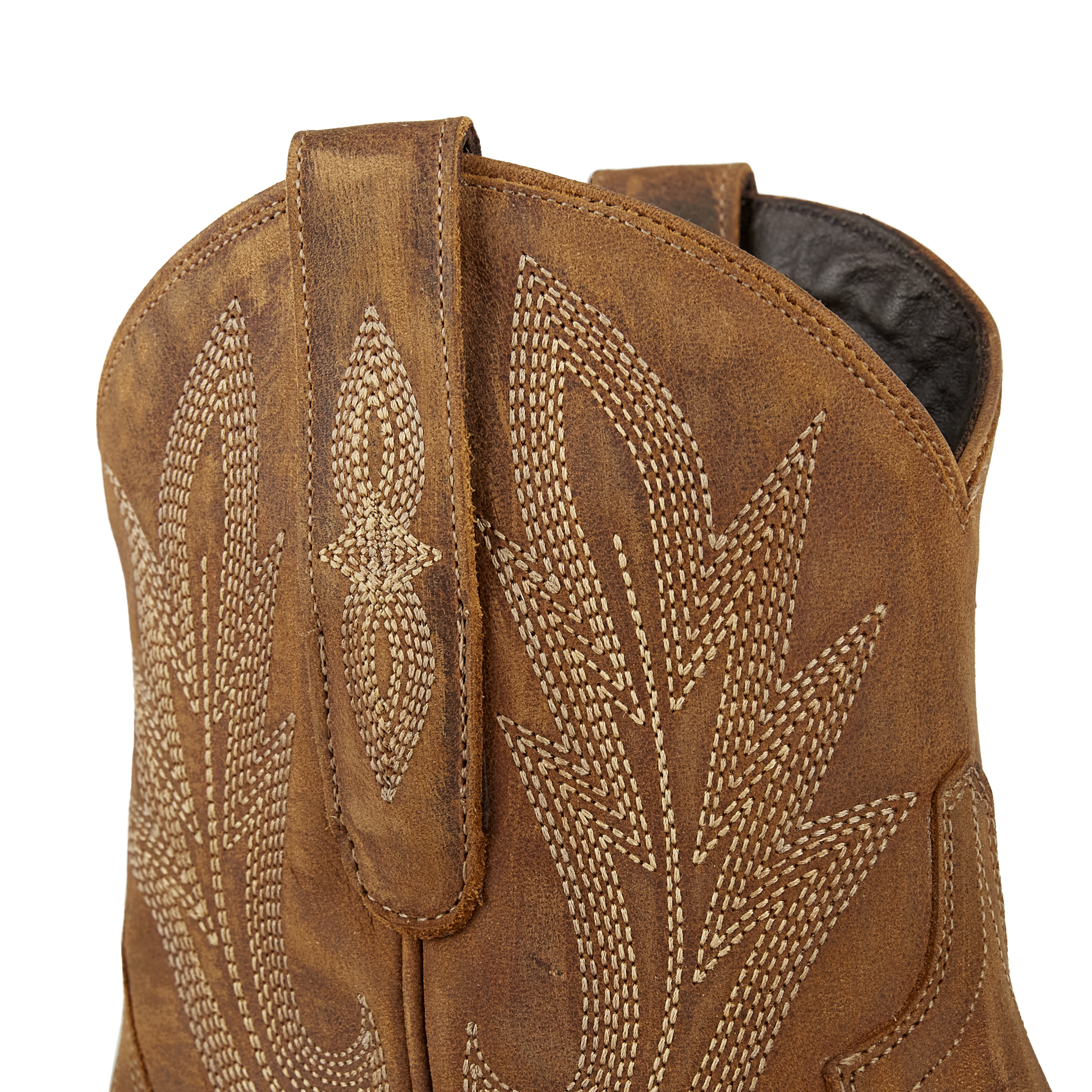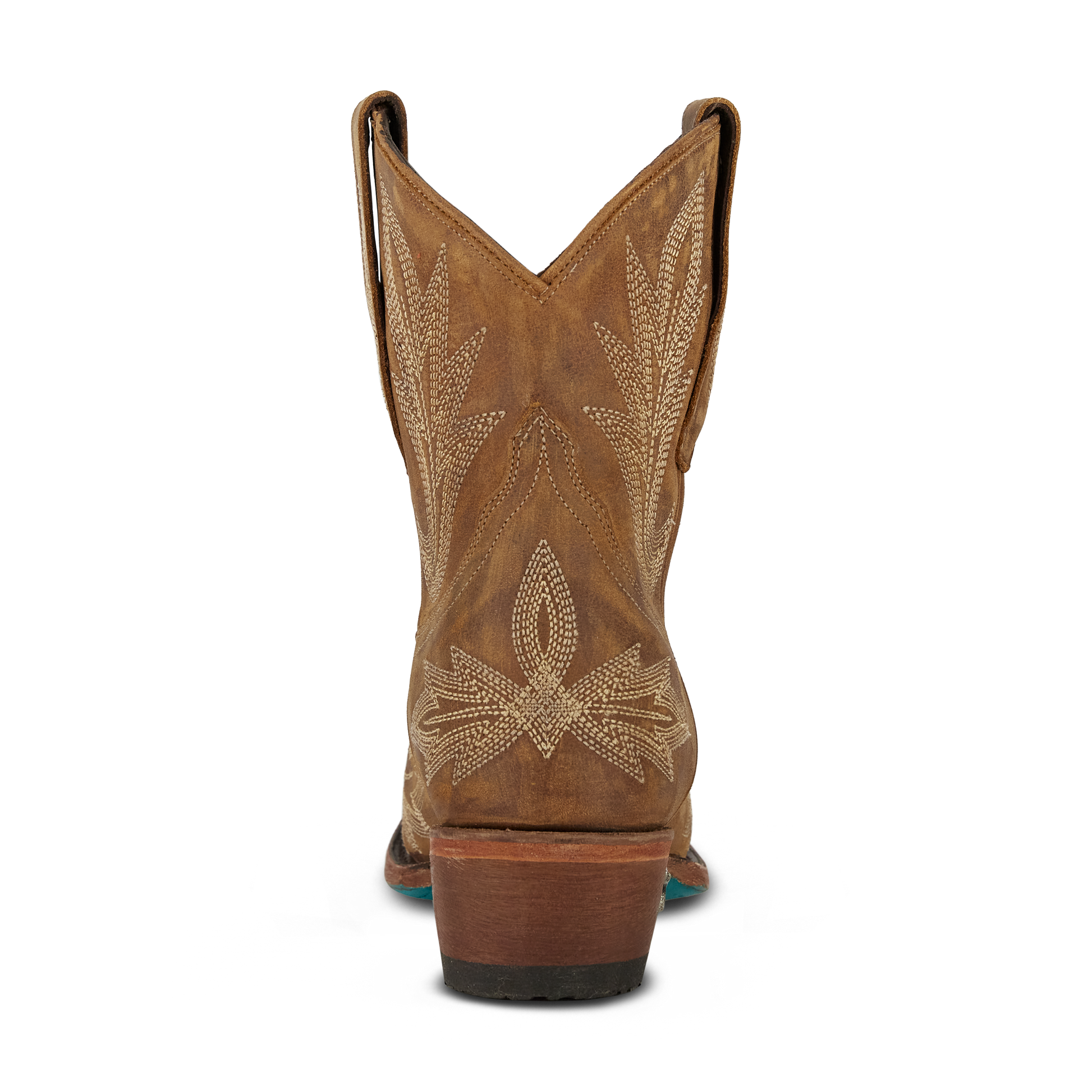 Heirloom quality ankle boots with a western influence. The classic snip toe profile is embroidered to perfection with a twist on traditional flame stitch in bootie form. She's short, sweet, and just the right height to pair well with your wardrobe.