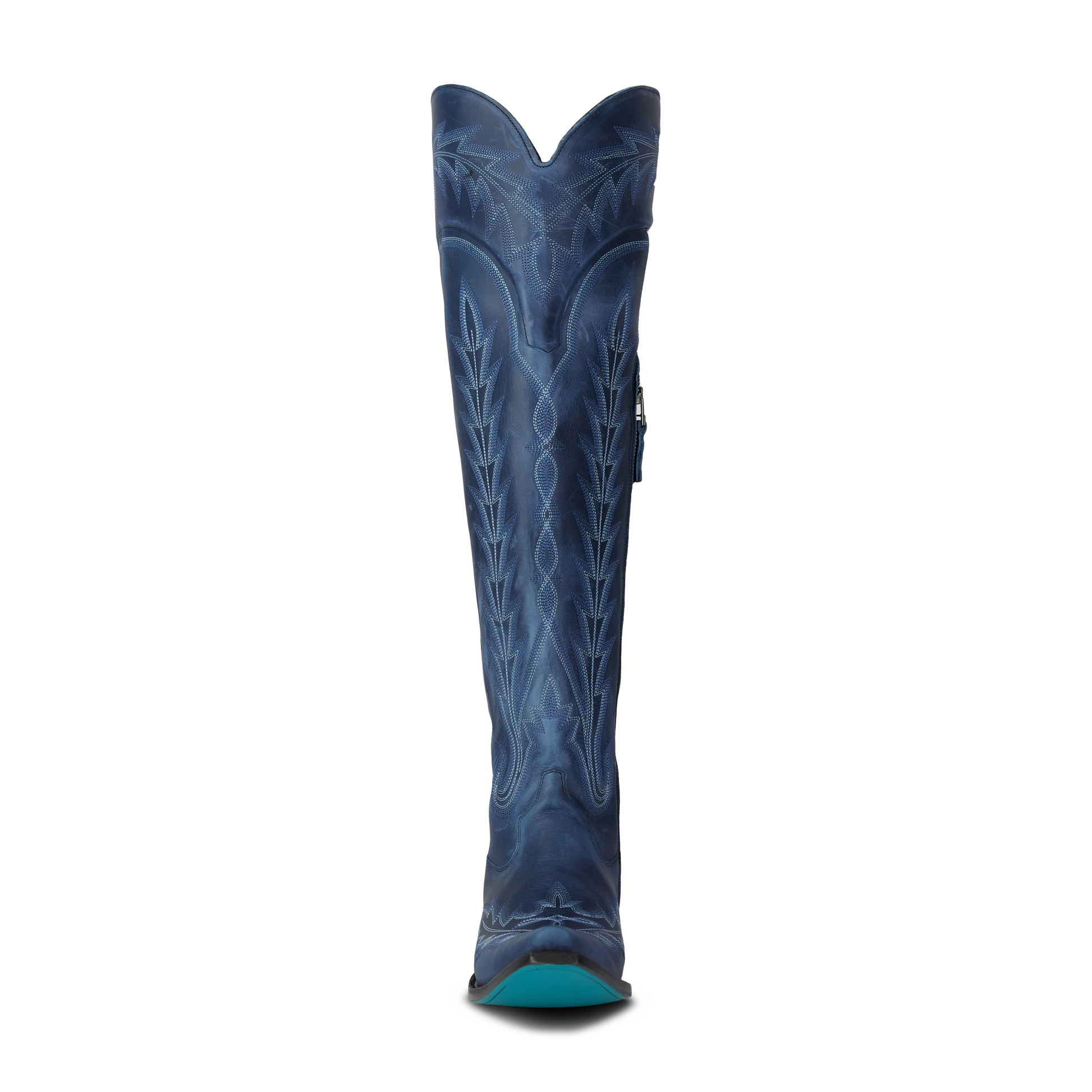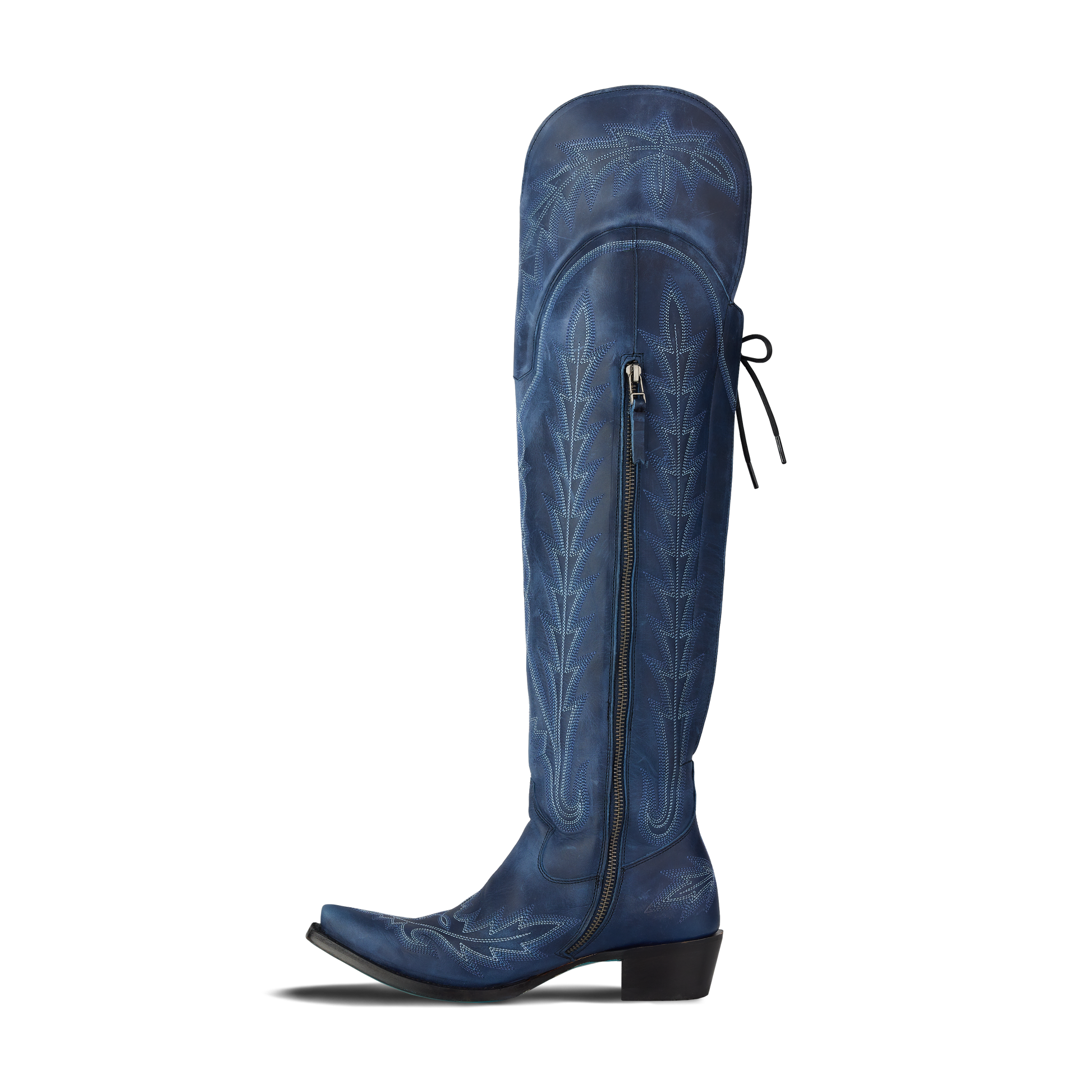 Sexy Over the Knee boot kicking classic retro stitch up all the notches.  Functional corset with wide tongue to accommodate all sexy leg types. Customize the corset to your leg one time and the easy in, easy out zipper will take care of the rest.