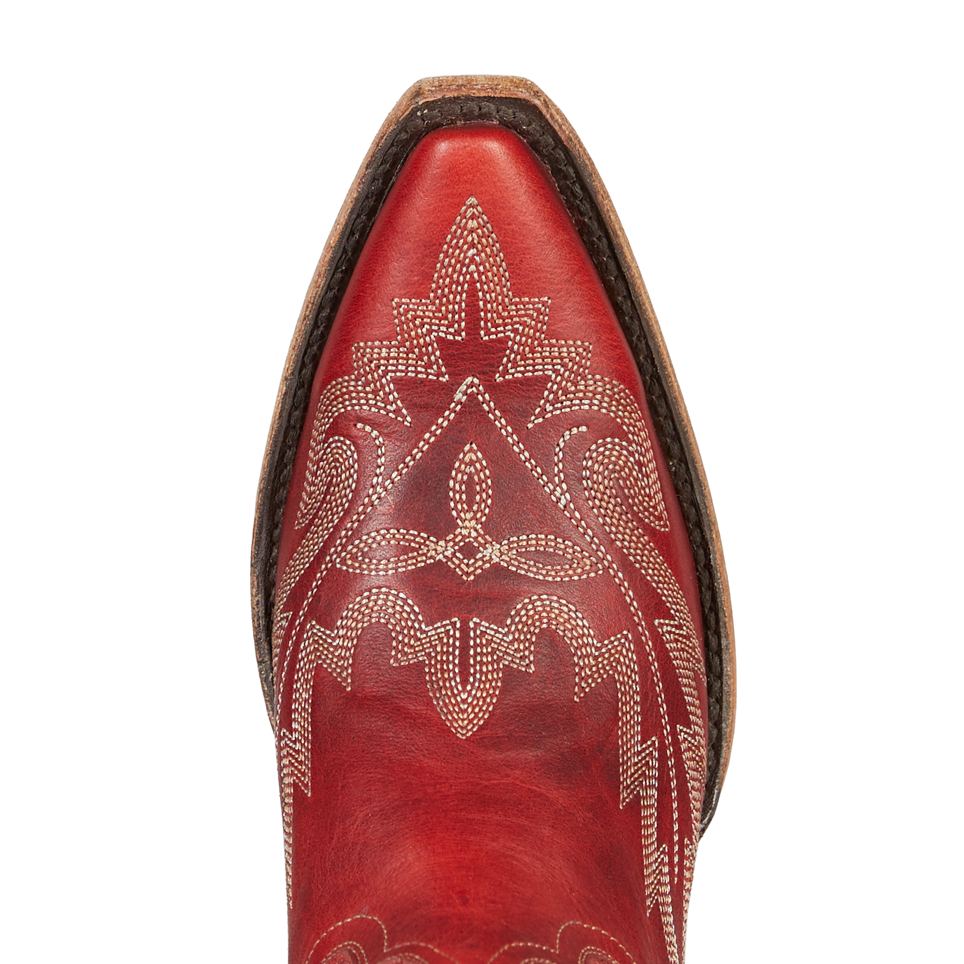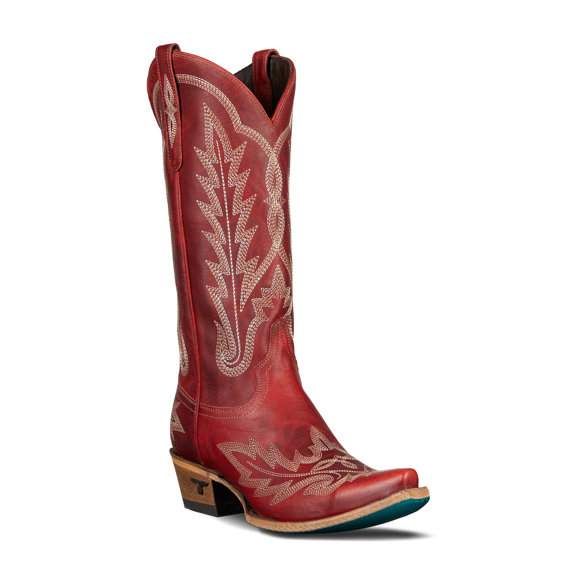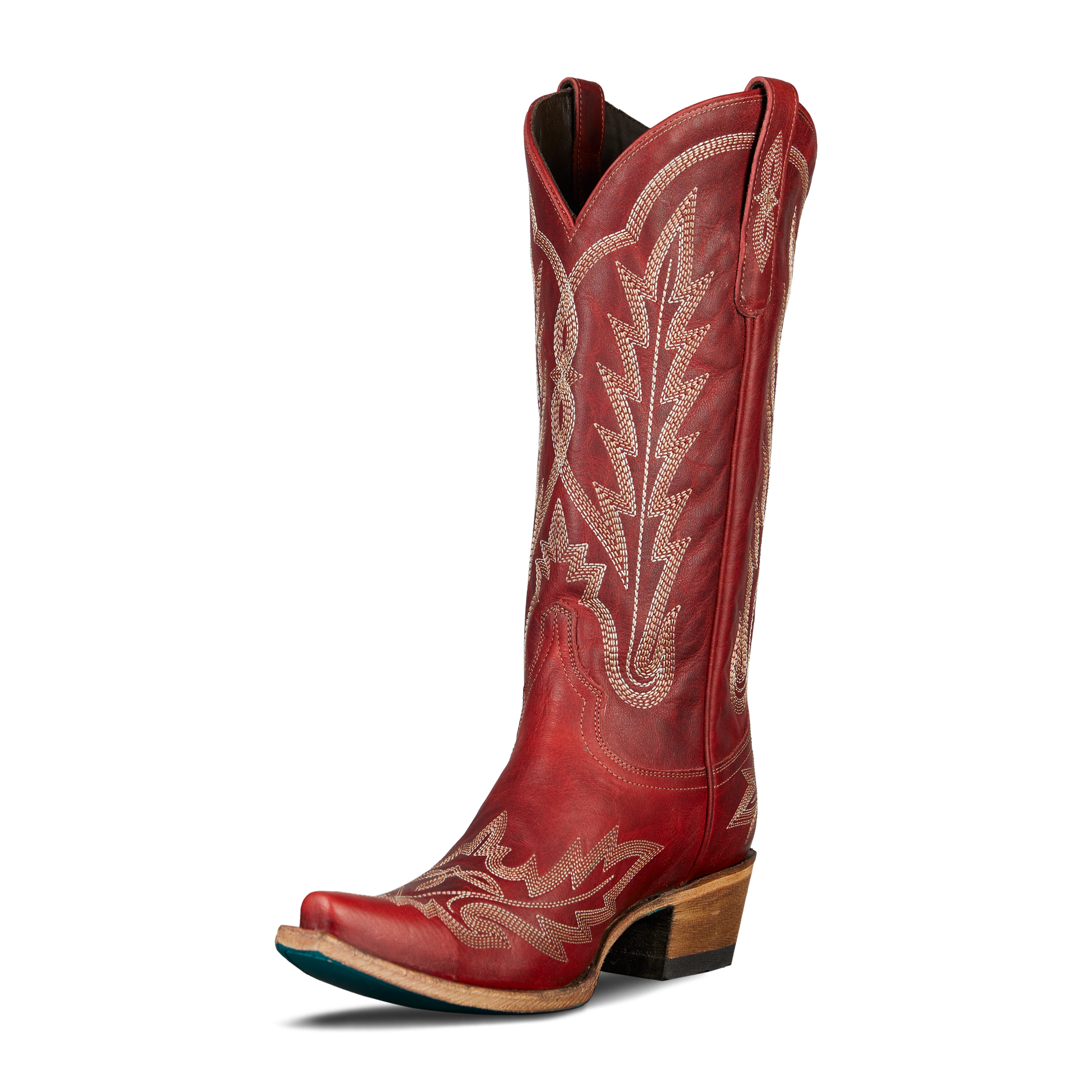 She's the perfect red cowgirl boot. Heirloom quality with a core western influence. The classic snip toe profile is embroidered to perfection with a twist on traditional flame stitch. Smoldering Ruby Red finish makes this a perfect fit for everyday to girl's night out.