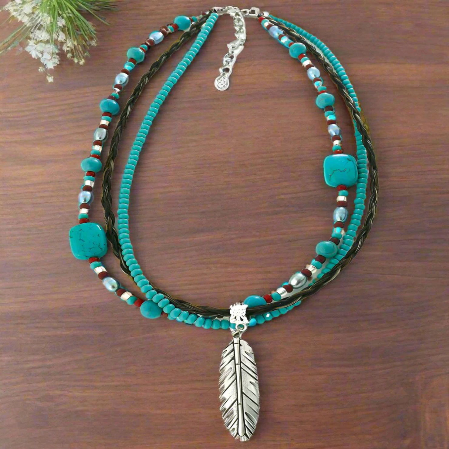 “Rain, wind & fire-they call the wind Mariah.” Cloudy iridescent freshwater pearls, howlite turquoise chunks with fire and ice seed beads twist around a spiral braid of authentic horse hair. The antiqued silver feather pendant makes this necklace soar. Adjustable from 17 to 20 inches with a chain and lobster closure. You’ll be blown away.