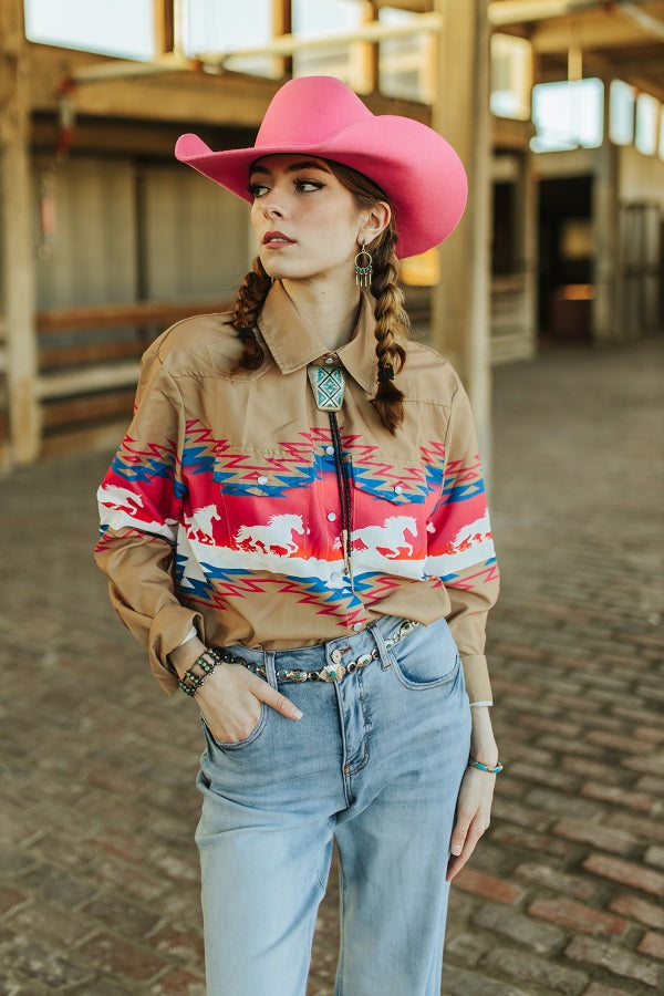 Mocha Pink Horse Aztec Printed Button Down Top Plus Size Bourbon Cowgirl