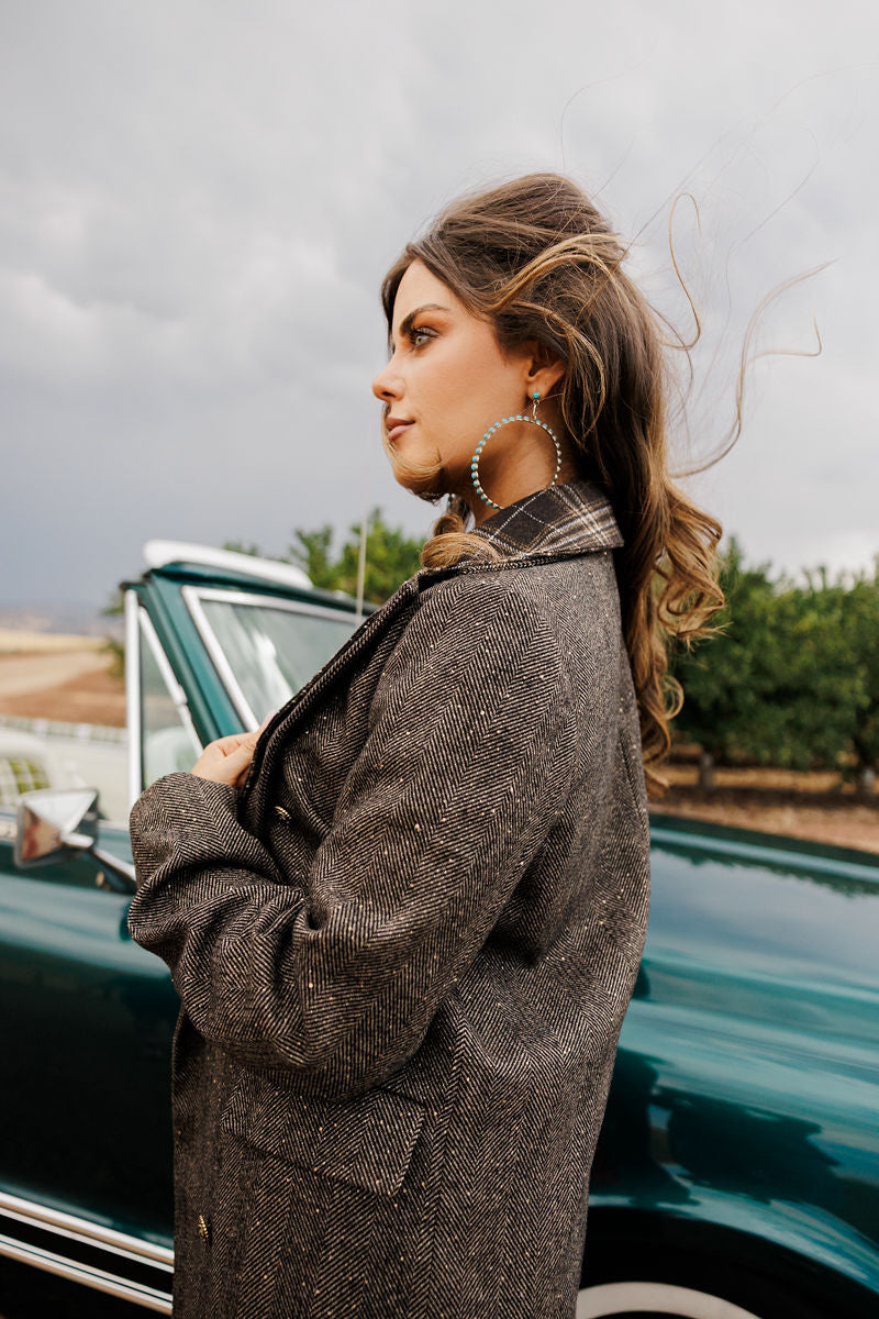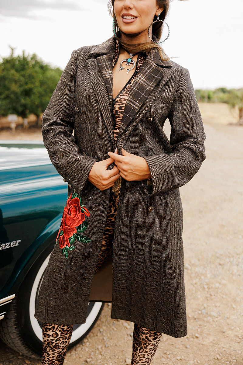 Wrap yourself in Western elegance with the Mrs. Marvel Coat—a long wool beauty that drapes past the knee and blooms with bold red roses by the pocket. It’s the perfect mix of vintage romance and modern cowgirl spirit. Wear it your way and make every entrance unforgettable.