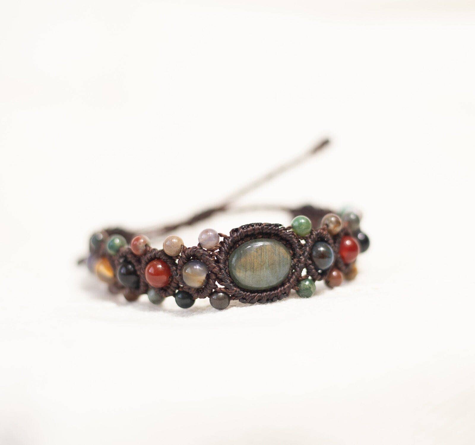 Specifications * Size: Length - 6"-10"/15-25cm adjustable, Width - 1"/2.5cm * Weight: 0.4 oz. * Color: Brown, Green, Blue, Orange and Red * Materials: Labradorite in the center & various Agate stones with Macrame Cord * Handmade in Chiapas. Due to the natural stone variations, each jewelry piece may differ slightly.