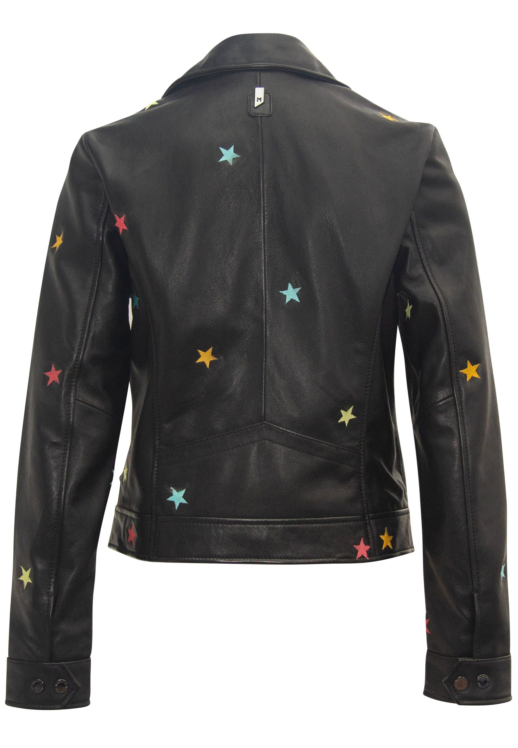 Add a touch of whimsy to your wardrobe with our Nanca Leather Jacket. Featuring embroidered small rainbow stars, this classic moto jacket will elevate any outfit with its unique and playful design. Flat rate shipping of $14 applies to leather coats and jackets.