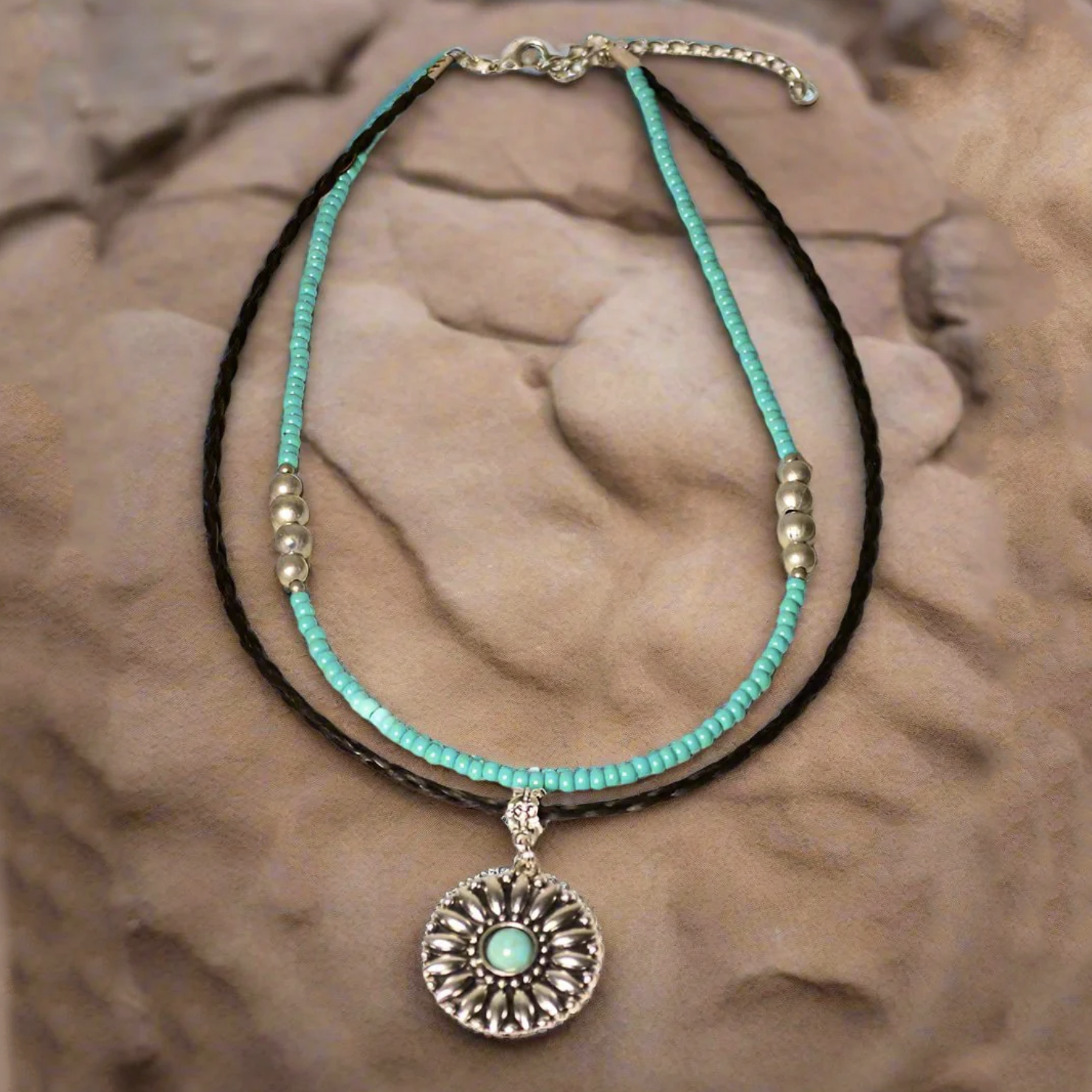 Grab some sun! Stylish Navajo Pearls and Turquoise seed beads are accented with a sunflower medallion that hangs from a single spiral braid of Authentic Horse Hair. Adjustable from 18 to 22" with a chain and lobster claw closure.