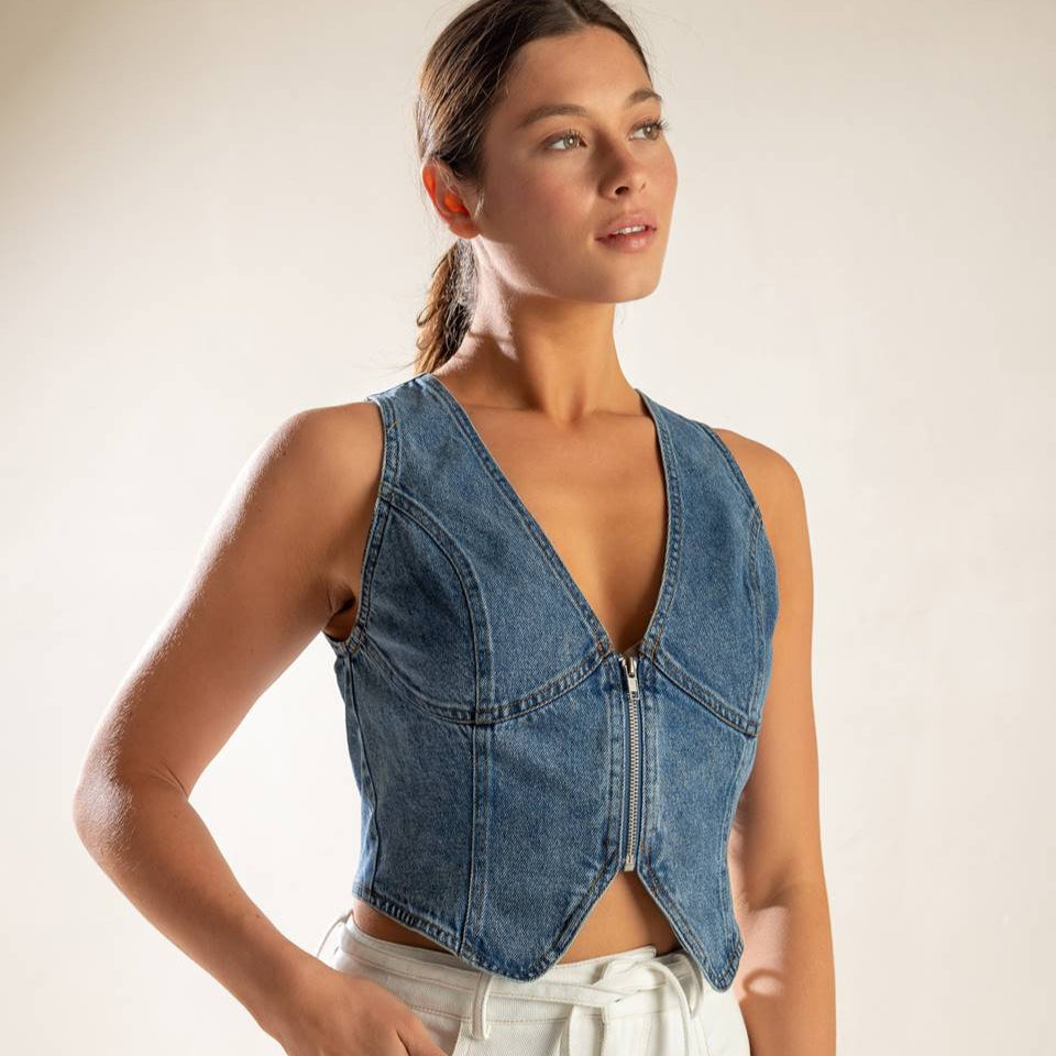 A washed denim vest featuring sleeveless and front zipper closure. Matching pant FP1524