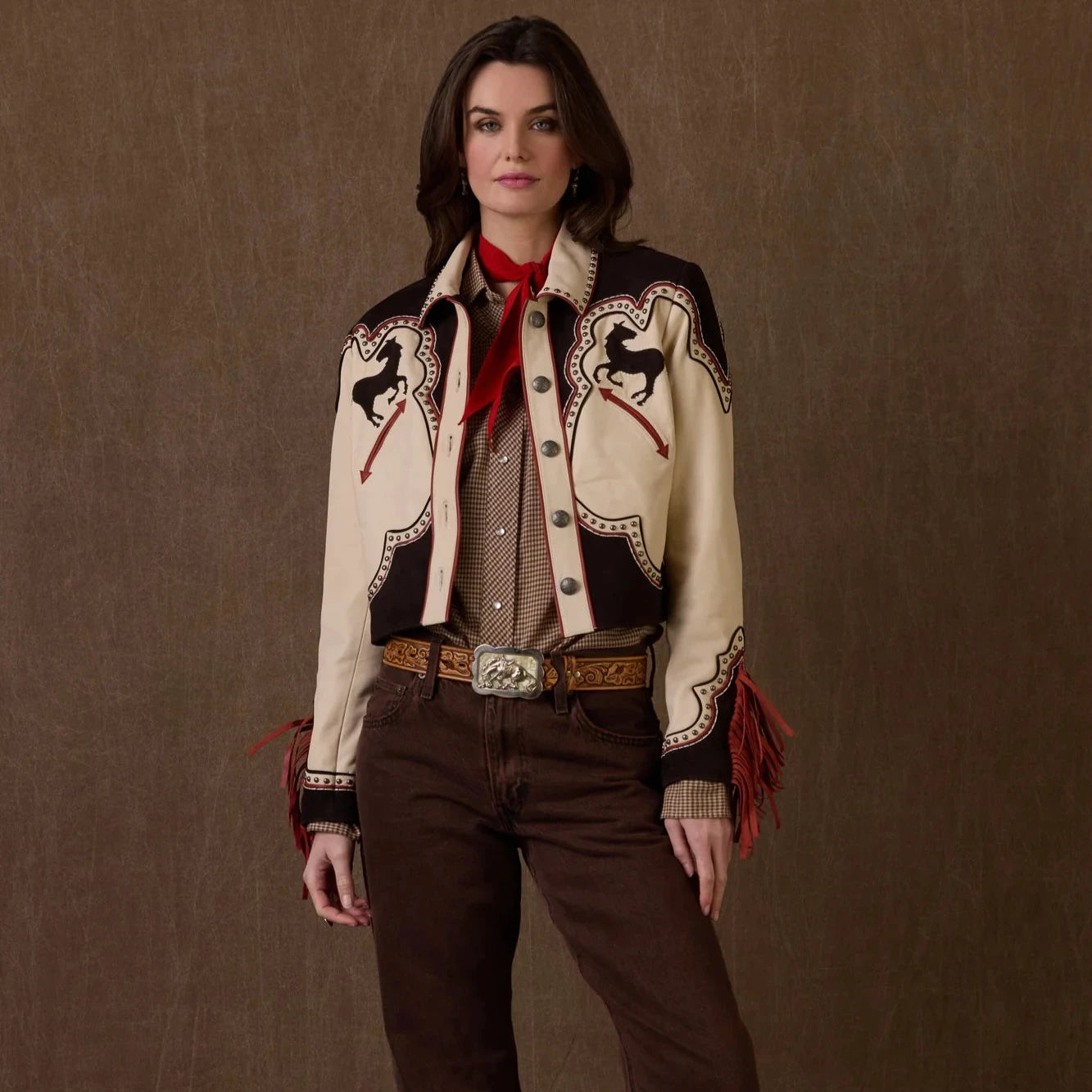 Get this cowgirl cutie in your closet immediately! Where do we even begin? The charming scallop contrast, the pops of retro red, the playful ponies, or that FABULOUS full-volume fringe on the cuffs – it’s all irresistible! And the ways to wear it are endless – jazz up jeans and tee, and some swagger to a simple sundress, or play up that bronco brown by pairing it with the McCoy gingham.