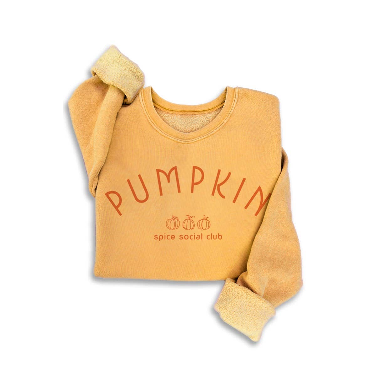 Pumpkin Spice Social Club Sweatshirt in Mustard. The best gift for the pumpkin spice lover and the cowgirl who loves everything fall! Graphic sweatshirt with an authentic vintage look and a softer feel that is only possible to achieve by using our special enzymes to dye and mineral wash processes.