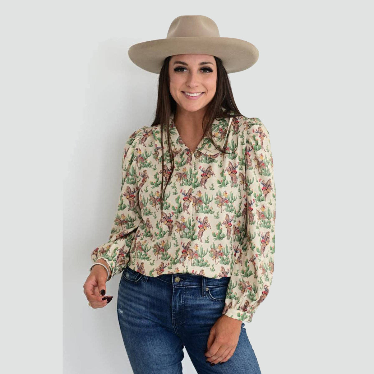Women's Western Cactus Print Button-Up Blouse for the cowgirl who loves western style clothing.