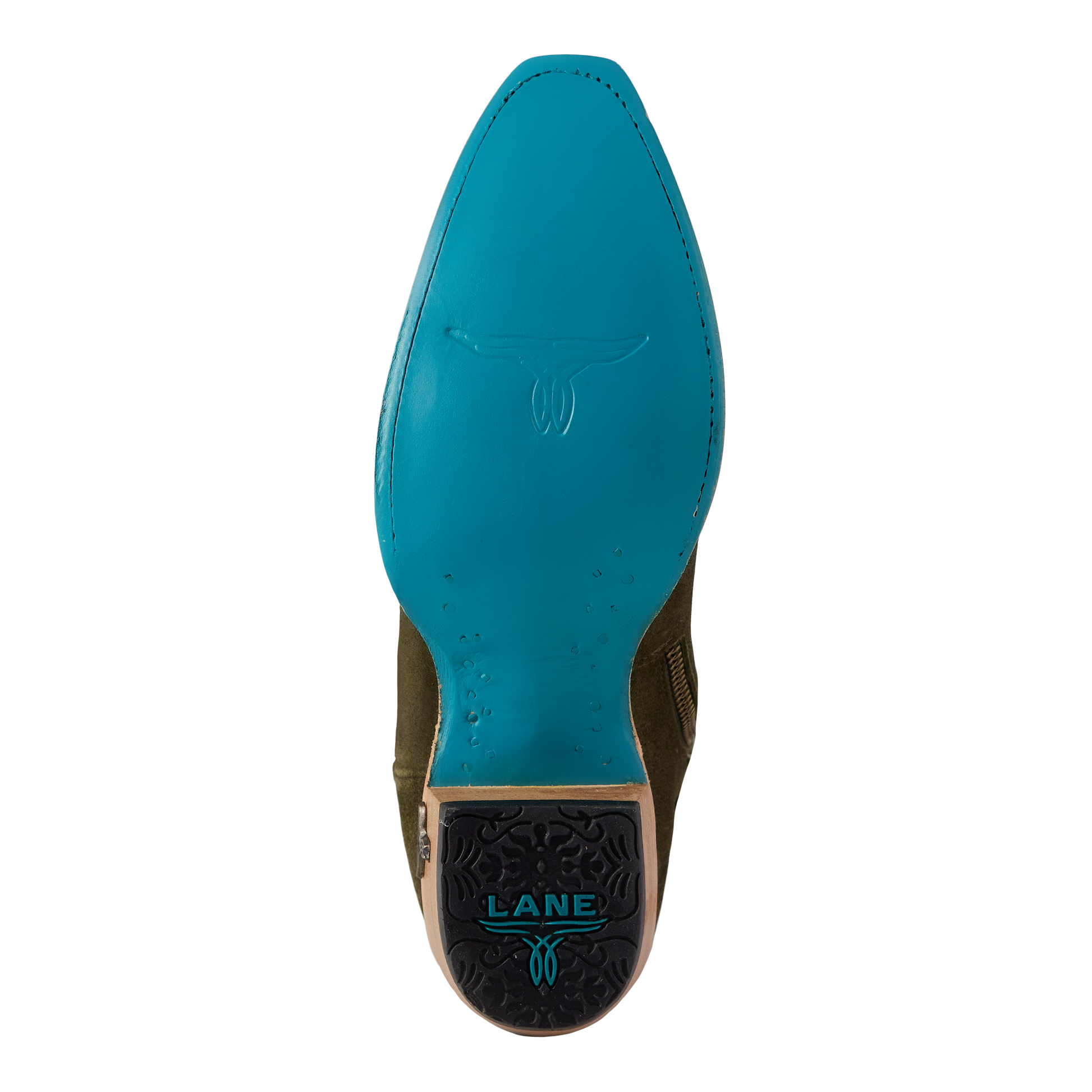 Featuring a convenient side zipper, these knee-high boots are easy to slip on and off, while the pull tabs and slightly distressed finish give them a well-loved, authentic feel. The pointed toe and classic Cuban heel provide a flattering silhouette, and the signature Lane turquoise sole adds a unique pop of color with every step.