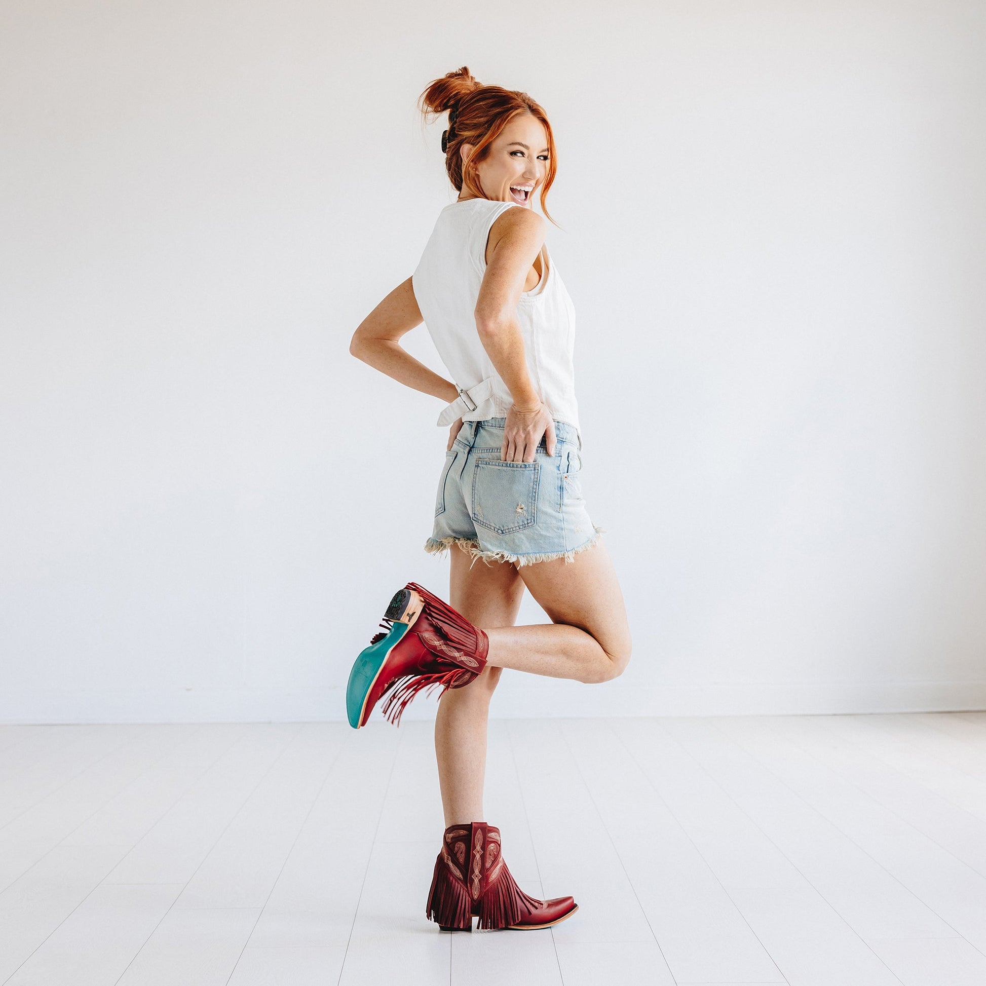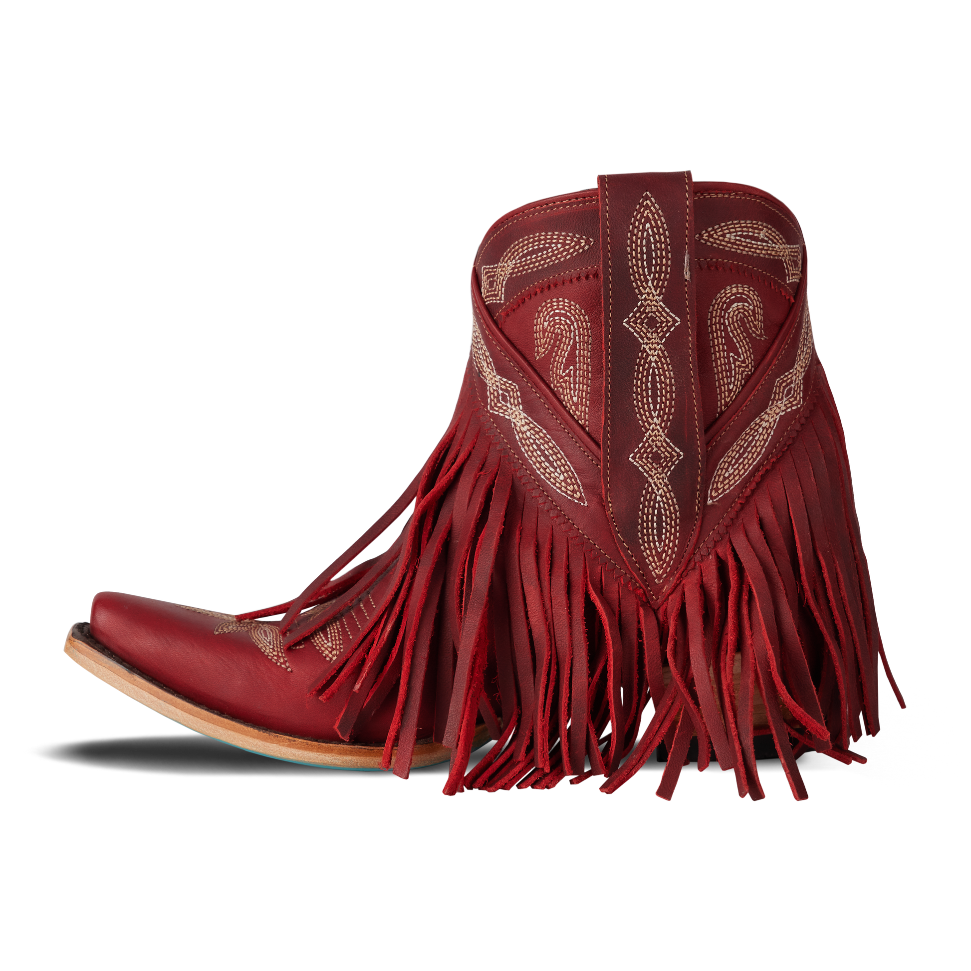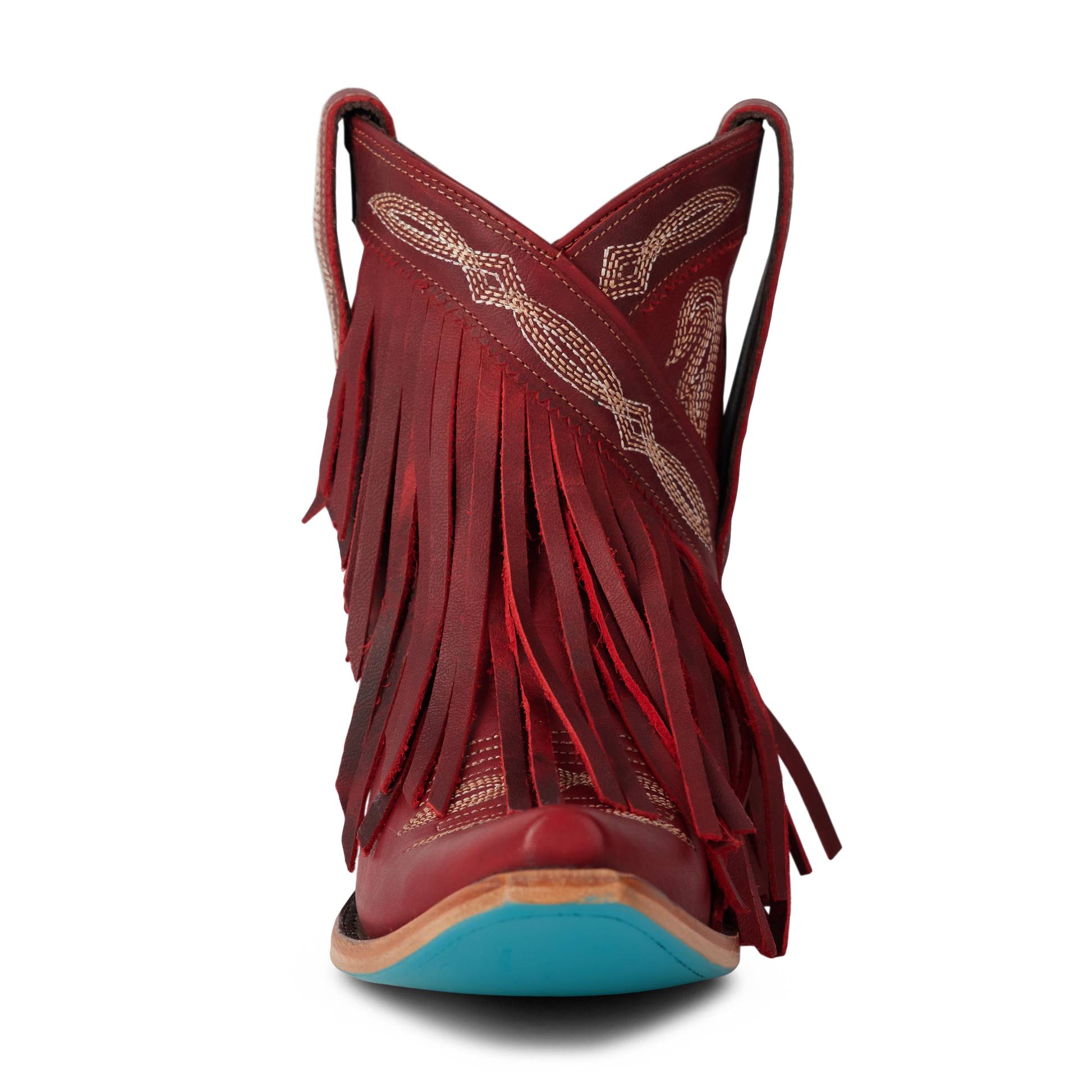 From rodeo to runway this chic boho western cowgirl bootie is ready for wherever the night takes you. A modern play on traditional flame stitch & asymmetrical fringe detailing. She's a must have in your closet. Dress her down with a chunky sweater and oversized blouse or spice her up for the ultimate girls night out with your favorite mini dress.
