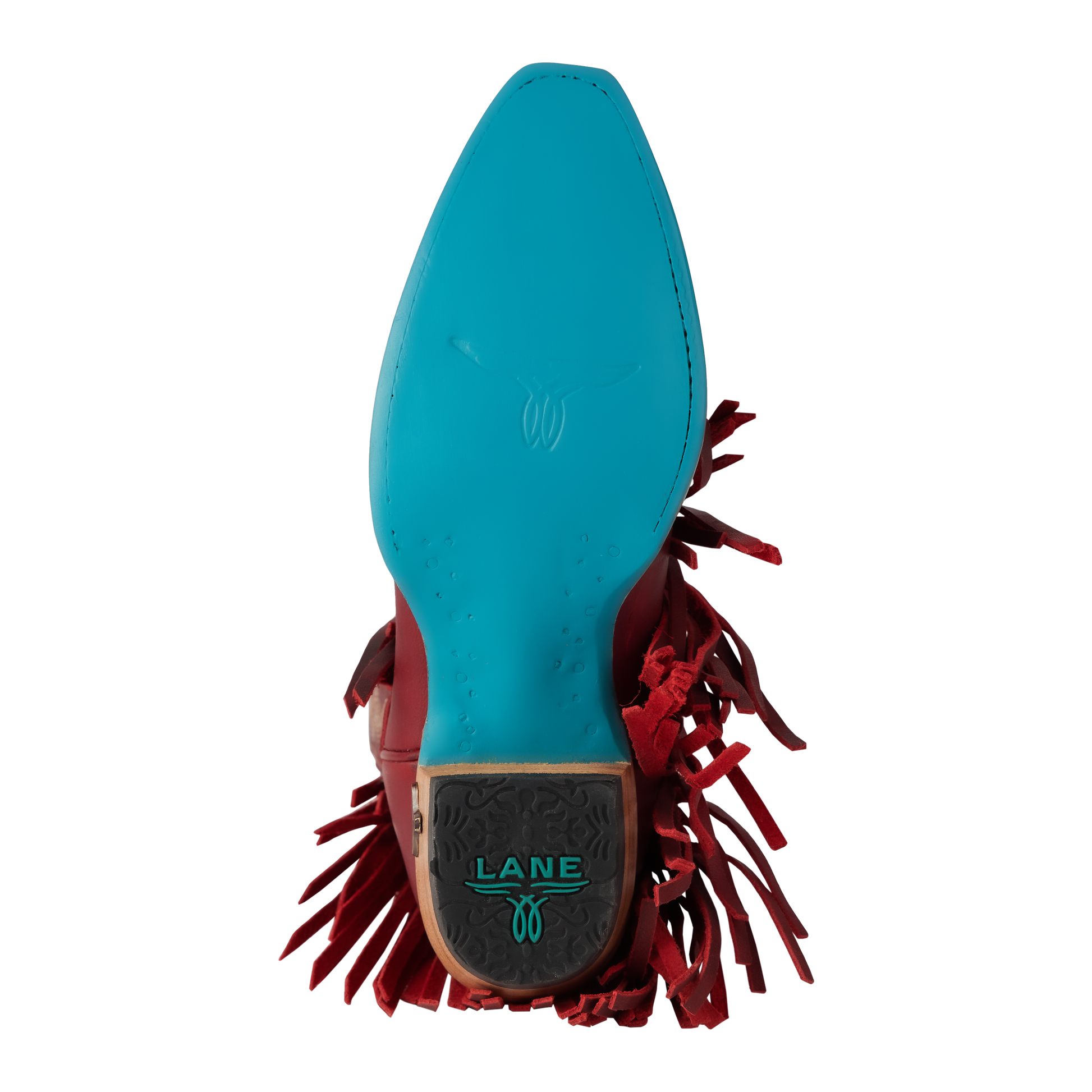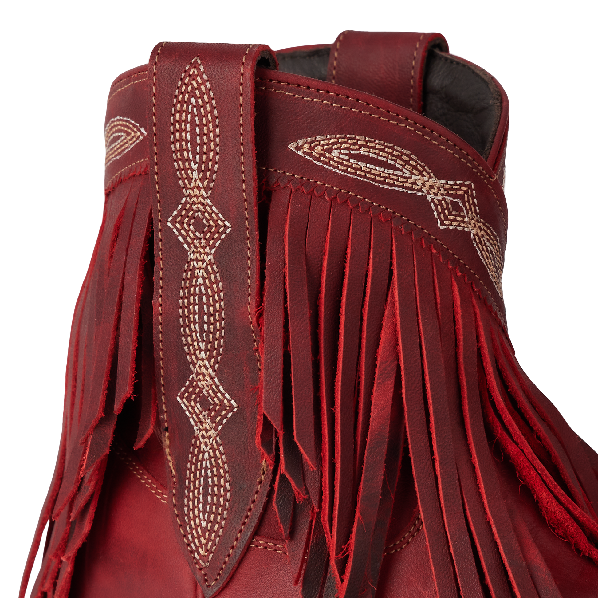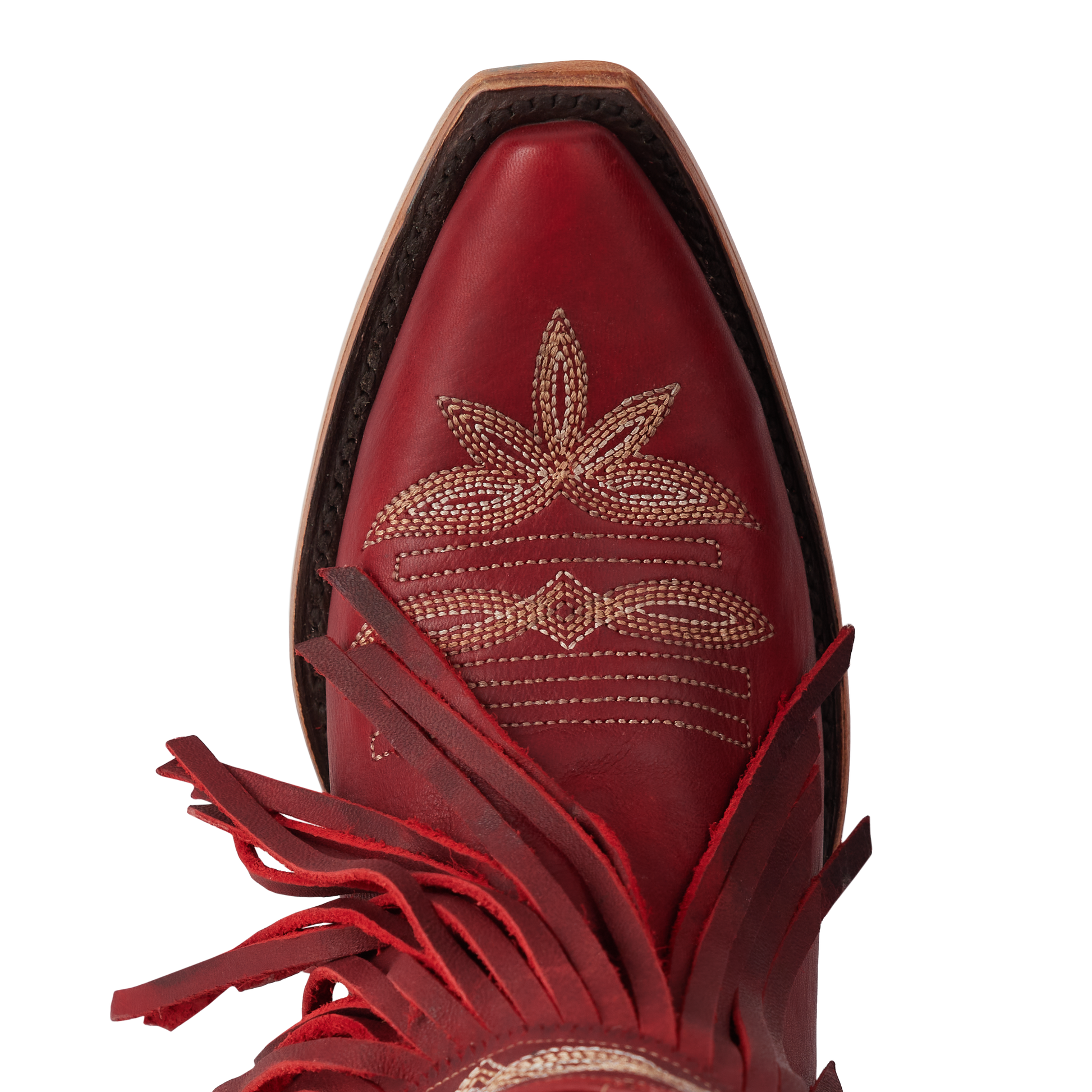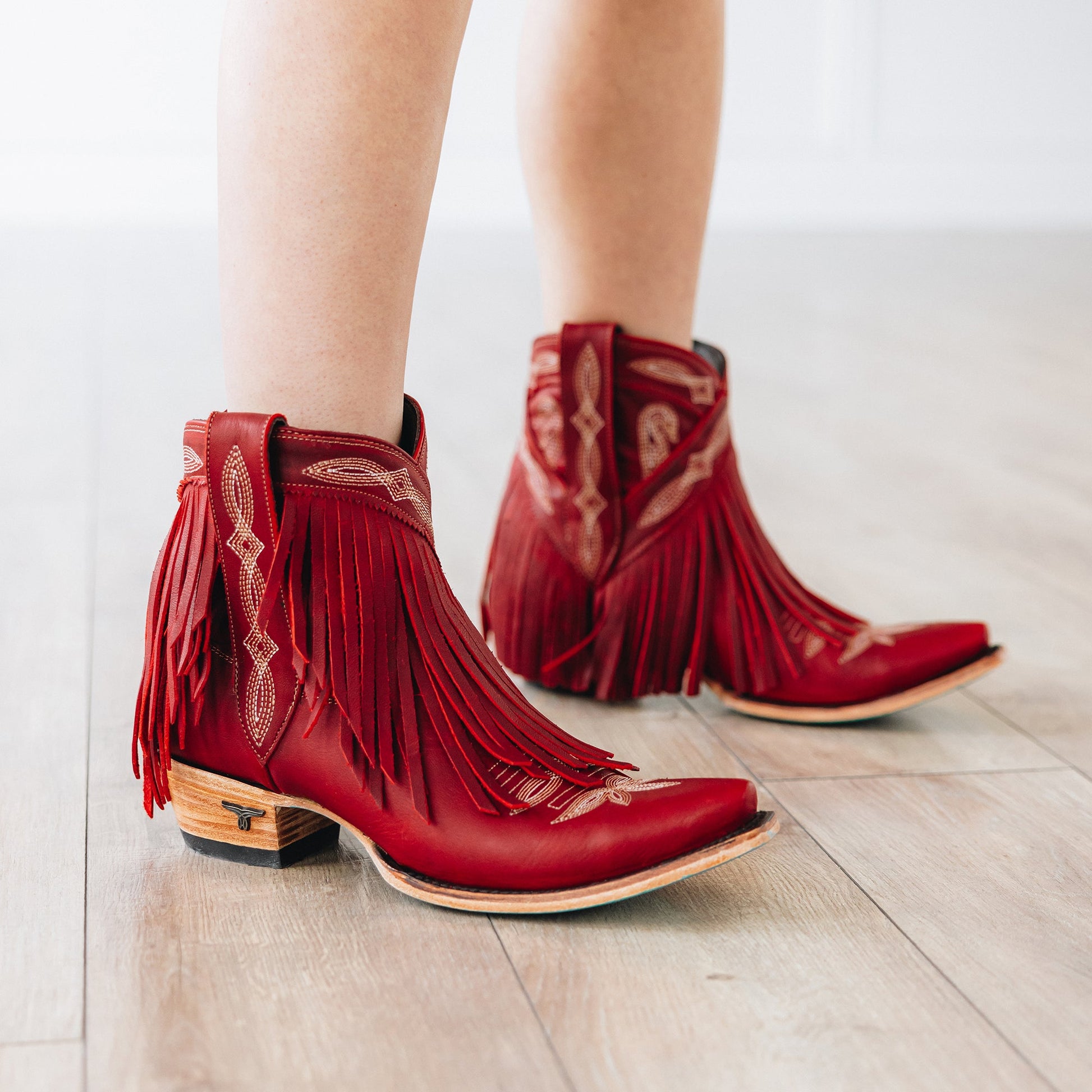 From rodeo to runway this chic boho western cowgirl bootie is ready for wherever the night takes you. A modern play on traditional flame stitch & asymmetrical fringe detailing. She's a must have in your closet. Dress her down with a chunky sweater and oversized blouse or spice her up for the ultimate girls night out with your favorite mini dress.