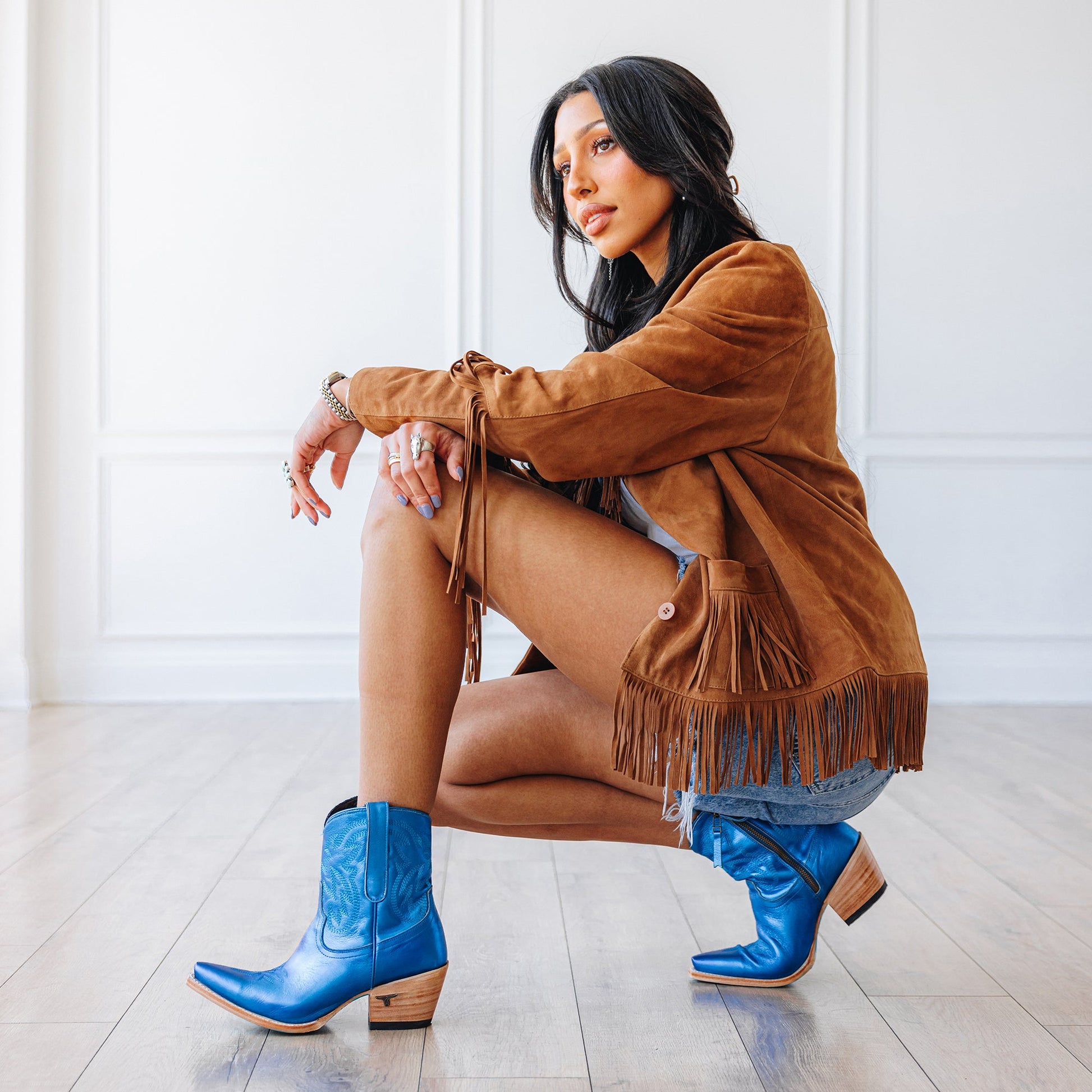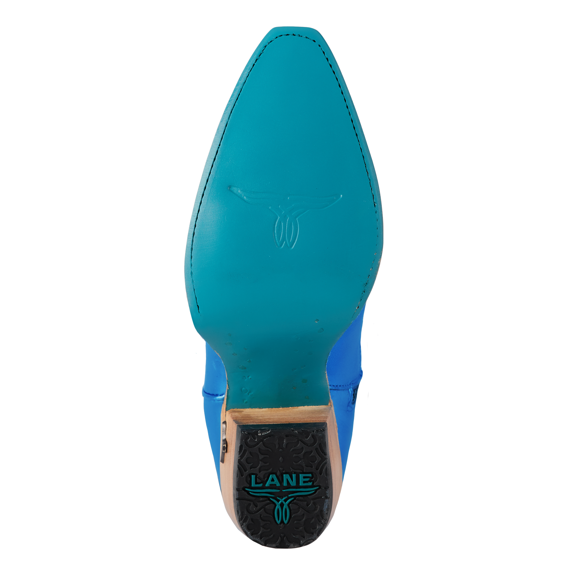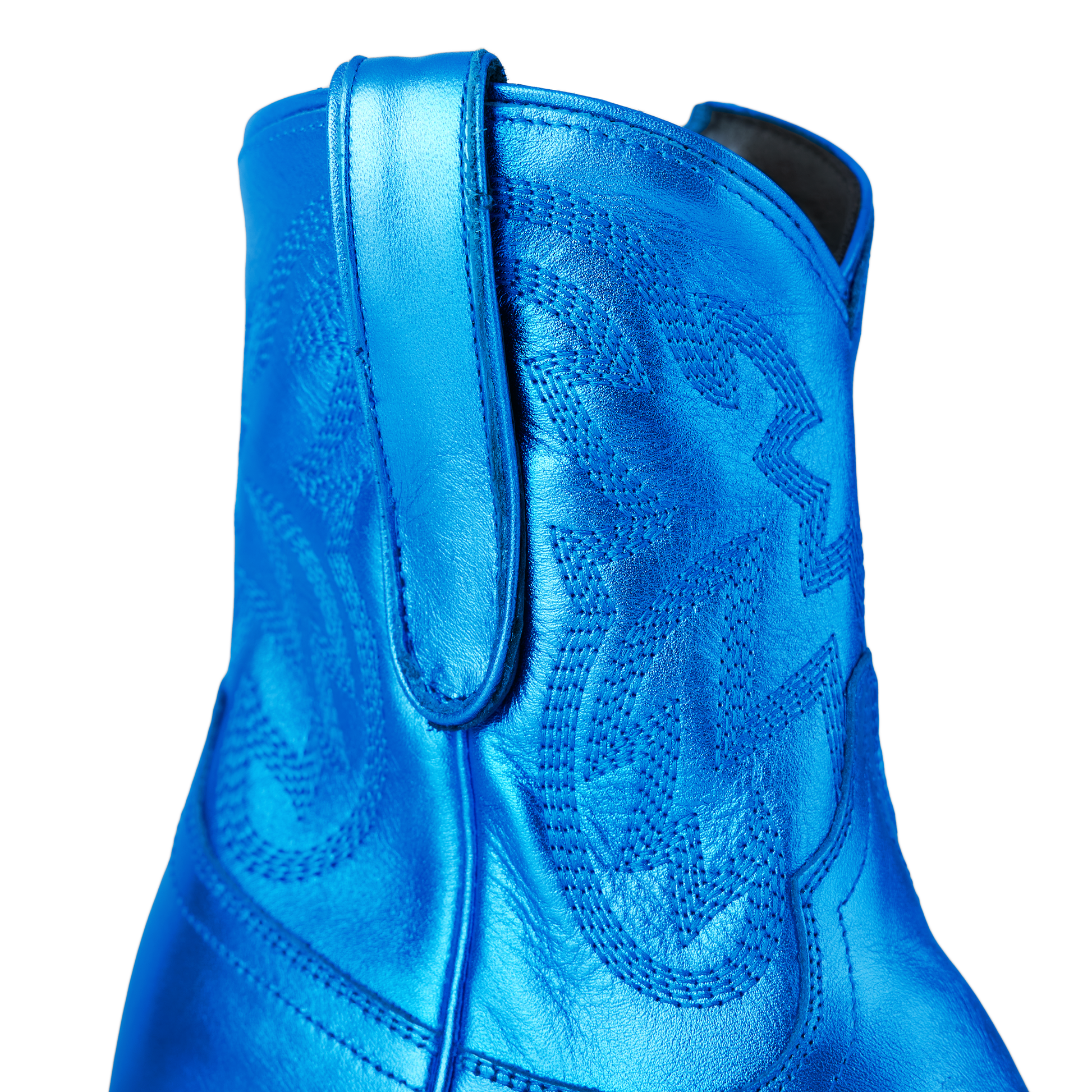 She's the same timeless renegade. A striking cobalt metallic cowgirl bootie right off the runway.  This classic snip toe is accompanied by an abstract cosmic starburst pattern and retro inspired toe stitch.  Level up your wardrobe and style this blue bottom hottie for a girls-night-out or concert outfit.
