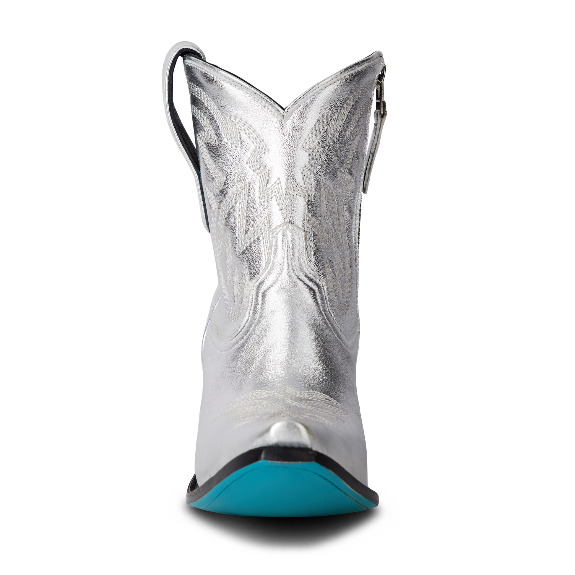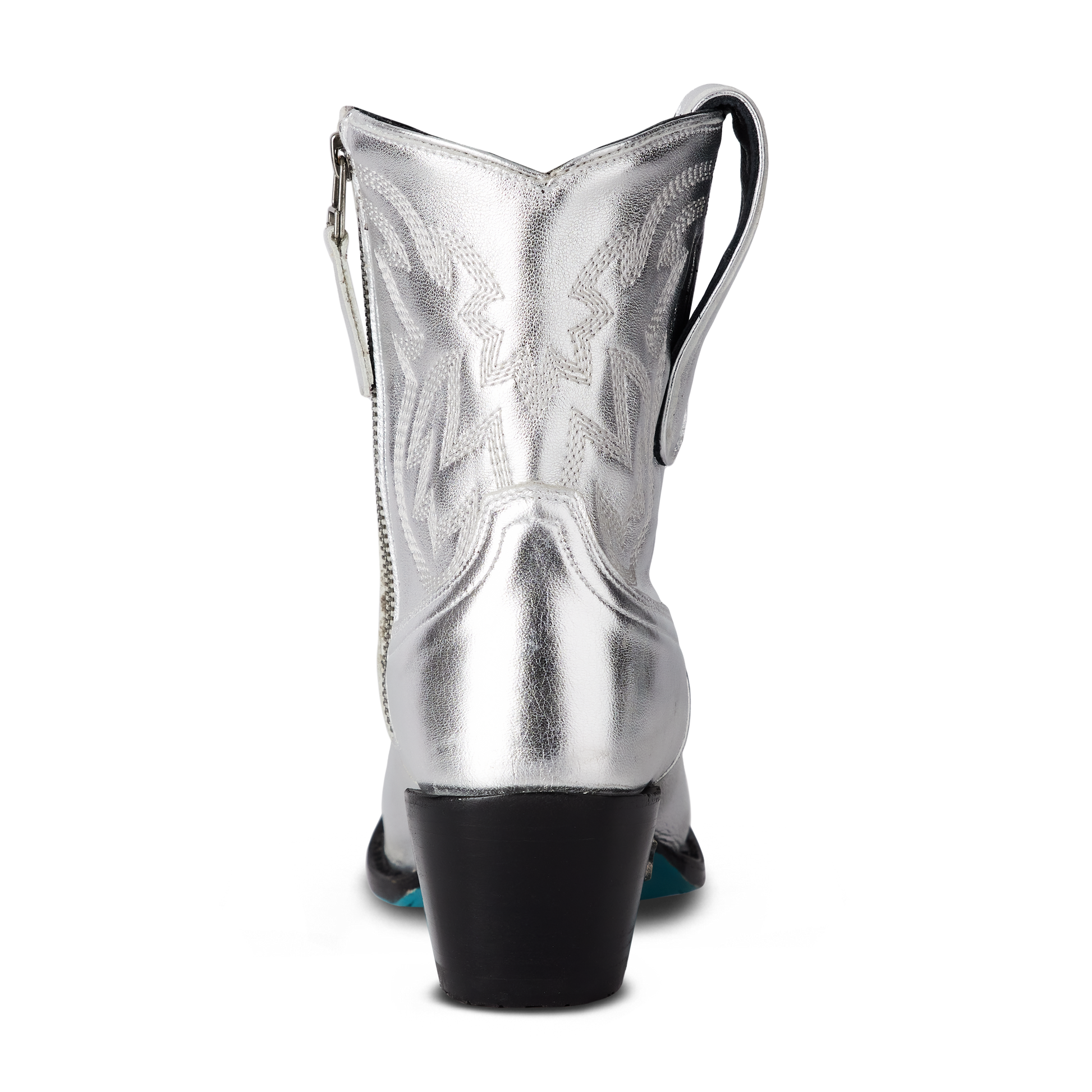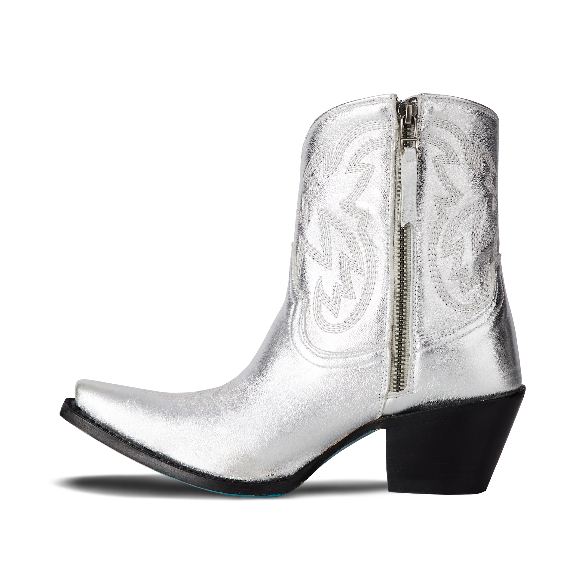 She's the same timeless renegade. A striking silver trail cowgirl bootie right off the runway. This classic snip toe is accompanied by an abstract cosmic starburst pattern and retro inspired toe stitch. Level up your wardrobe and style this blue bottom hottie for a girls-night-out or concert outfit.