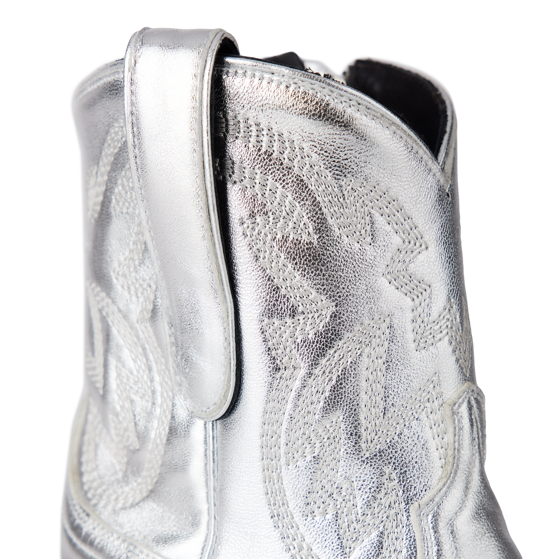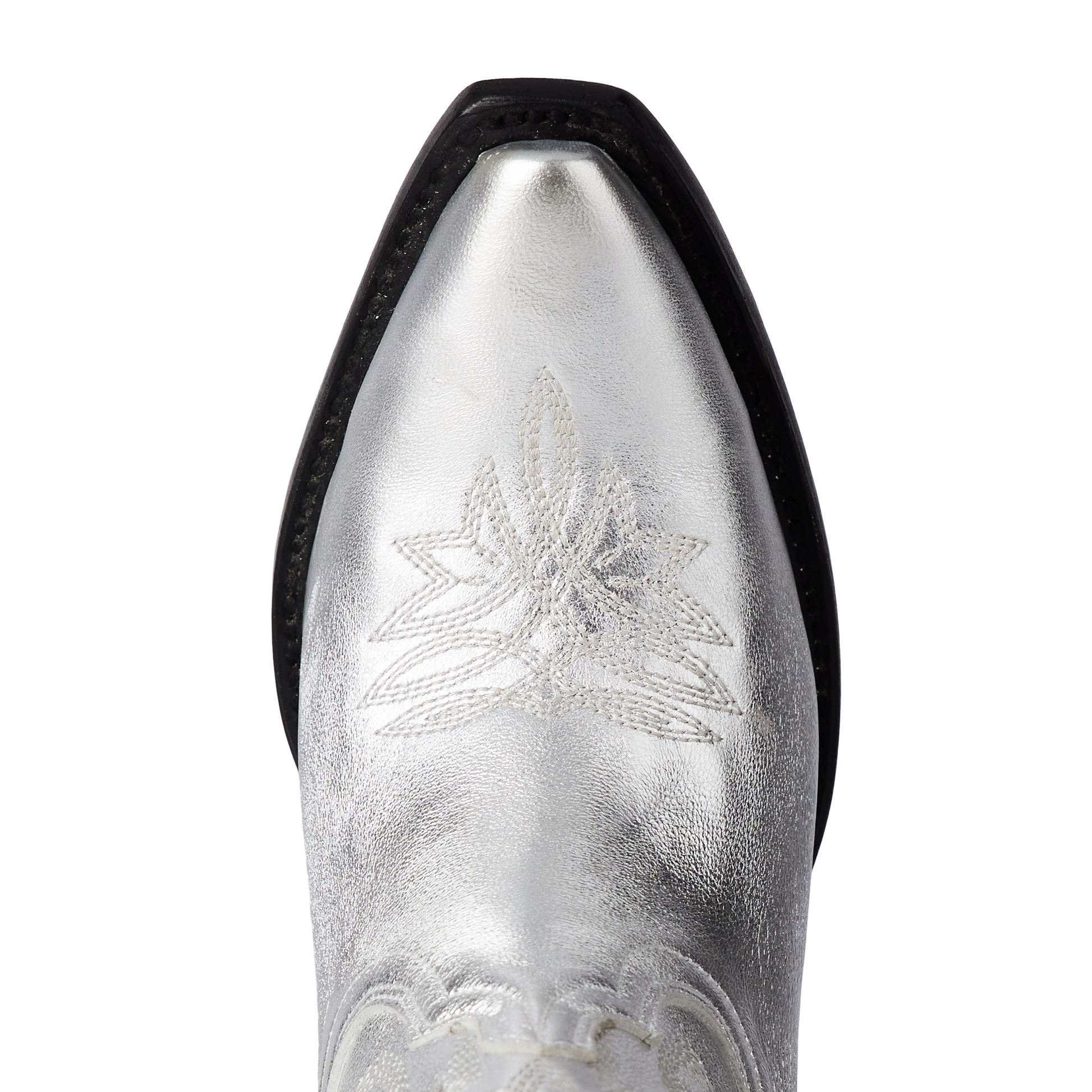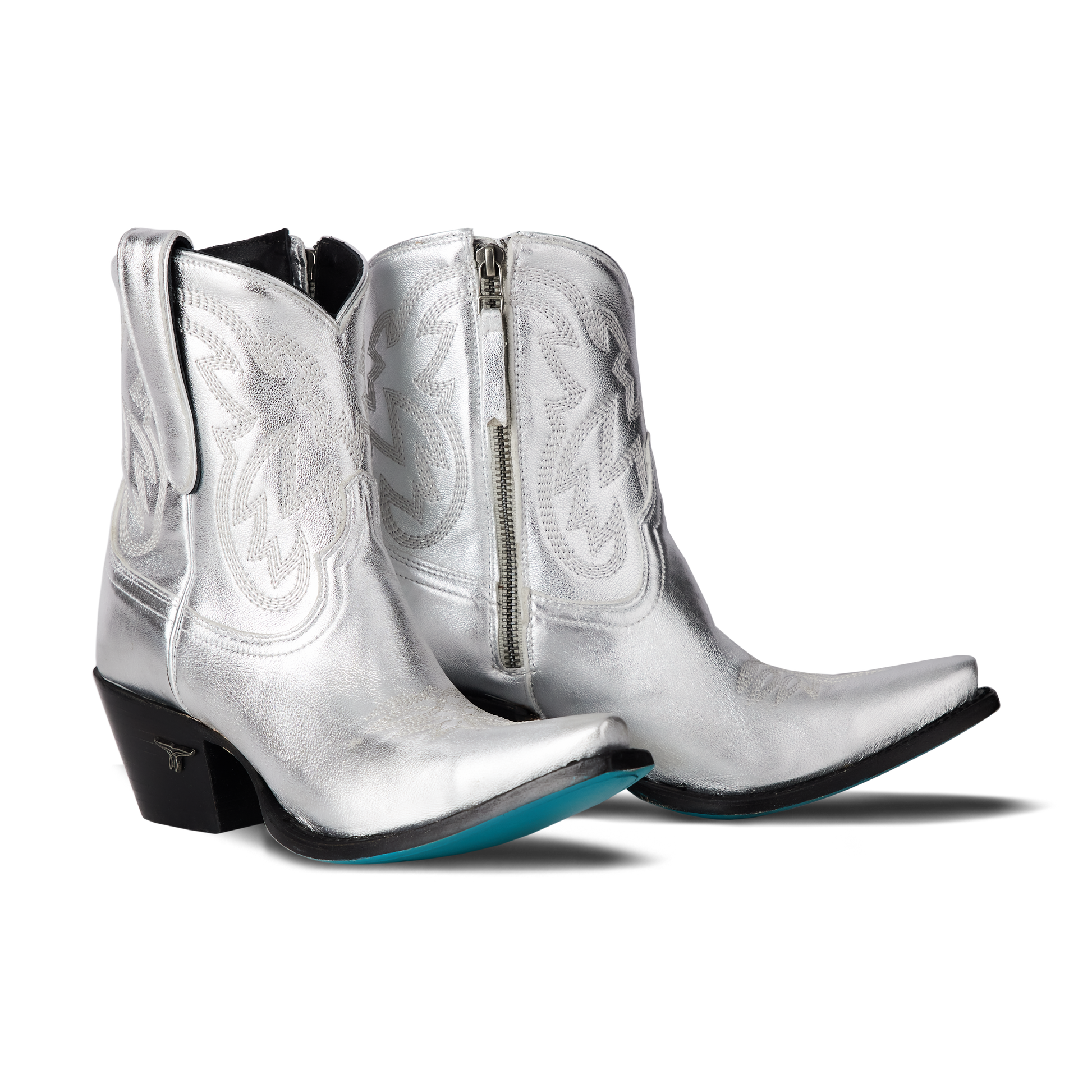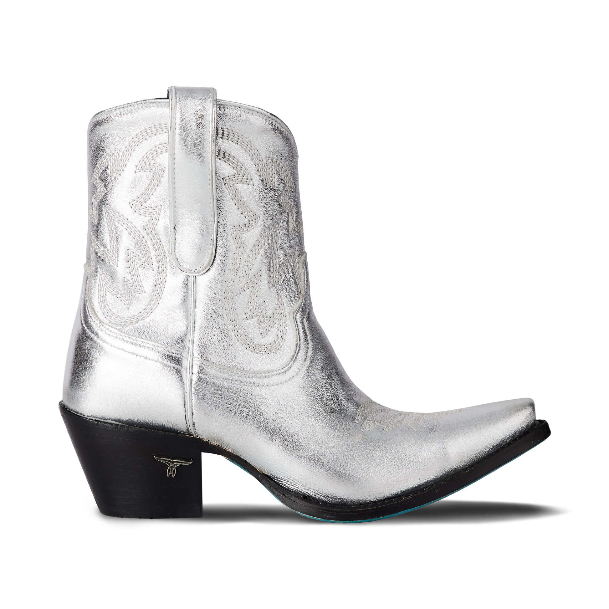 She's the same timeless renegade. A striking silver trail cowgirl bootie right off the runway. This classic snip toe is accompanied by an abstract cosmic starburst pattern and retro inspired toe stitch. Level up your wardrobe and style this blue bottom hottie for a girls-night-out or concert outfit.