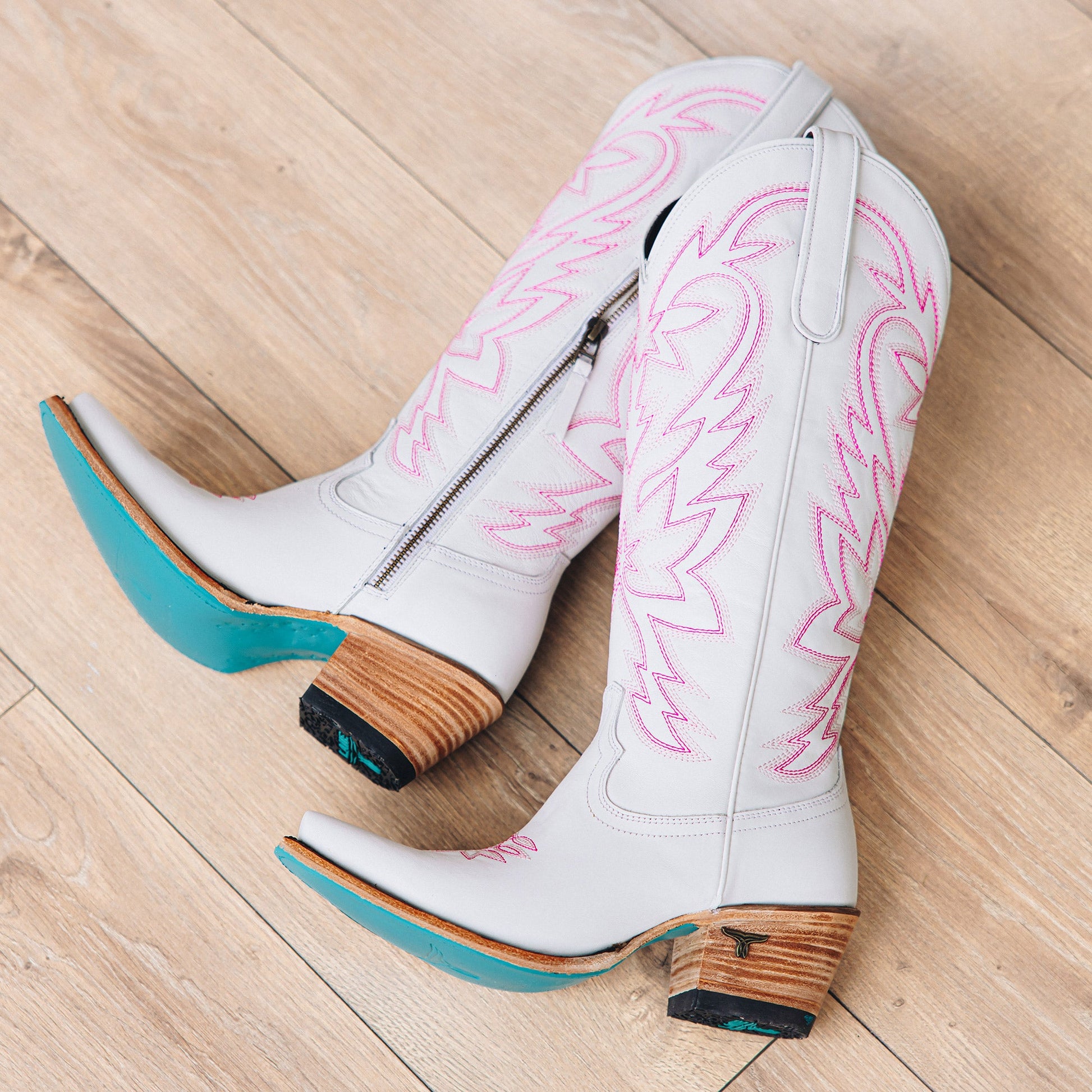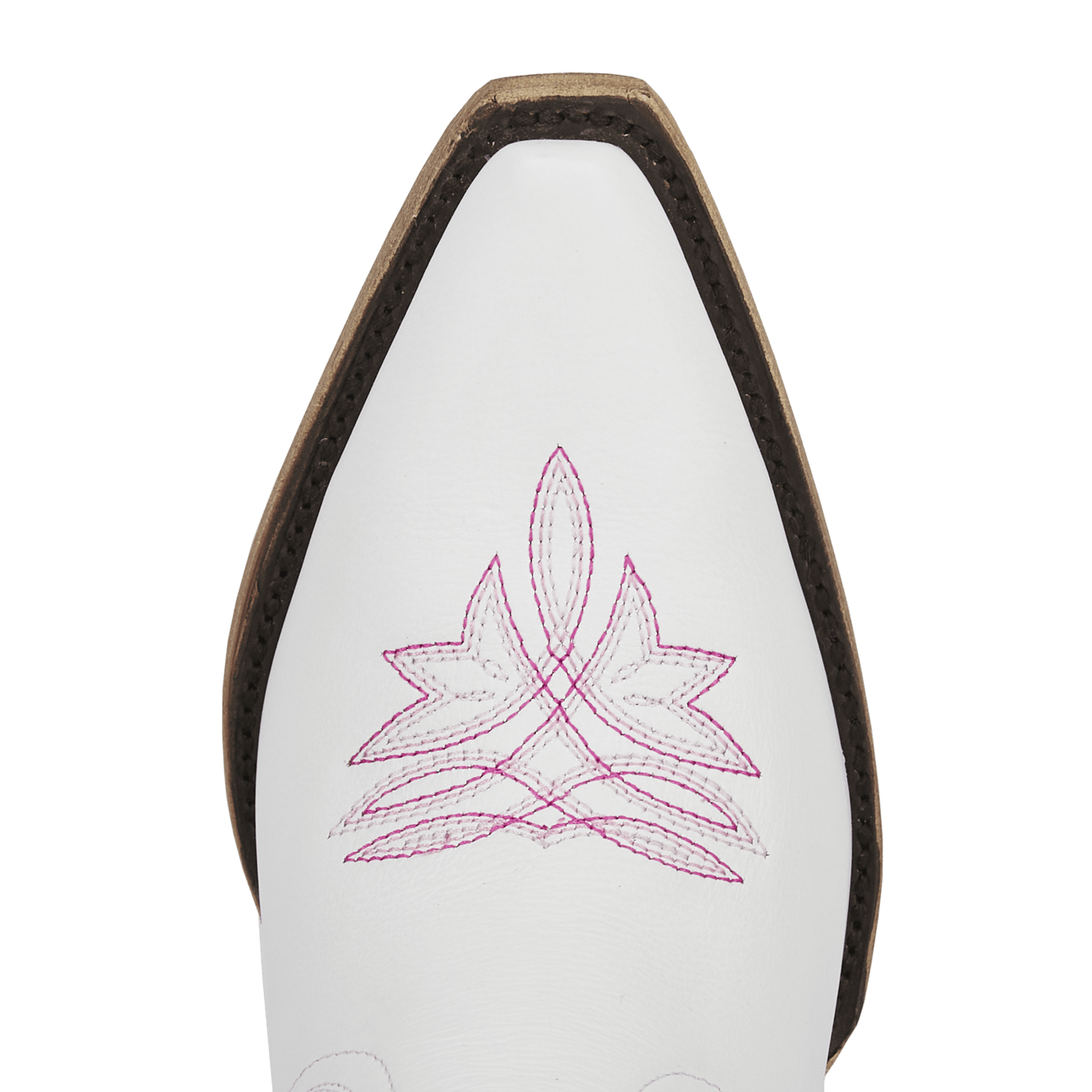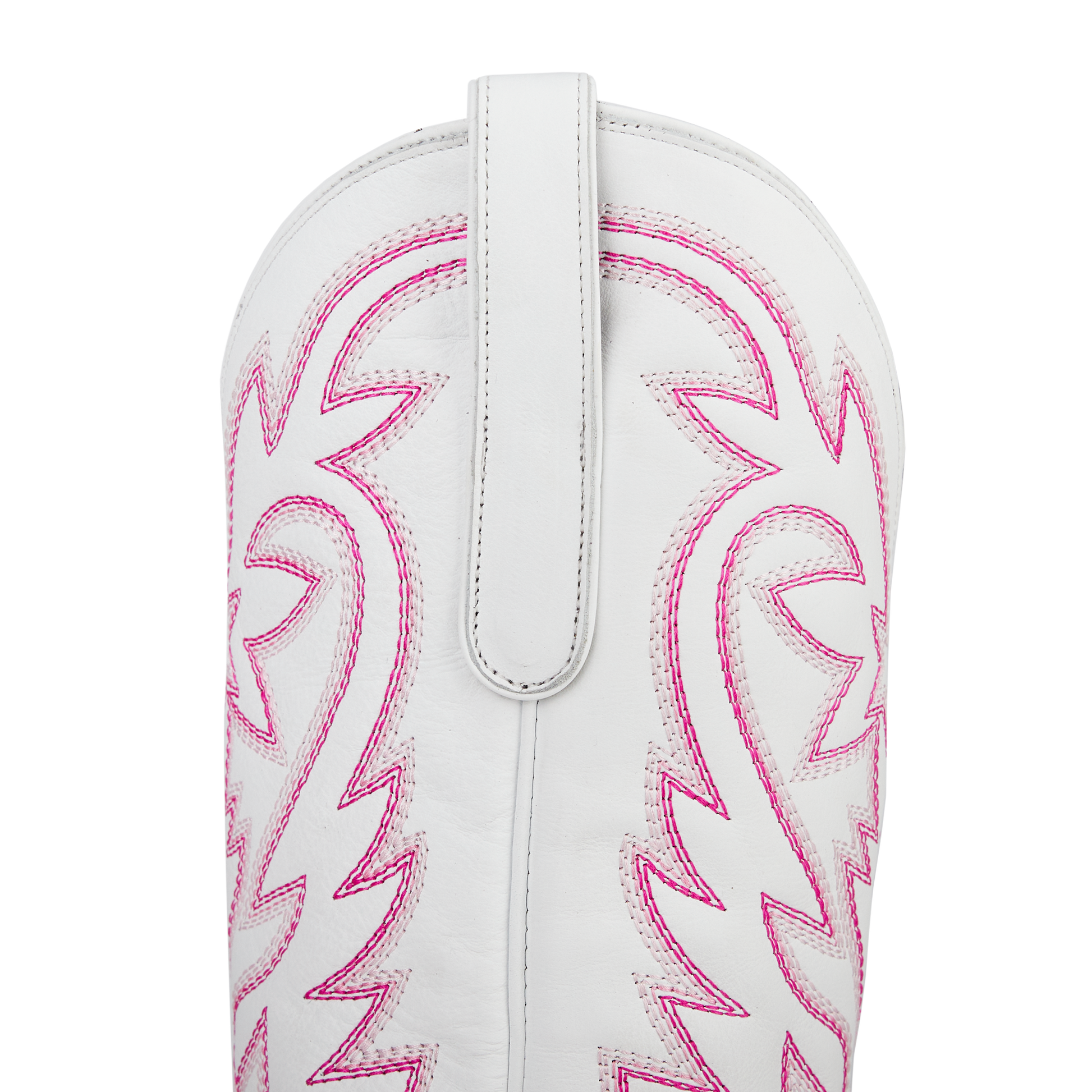 She's the perfect chic, white cowgirl boot with a pop of pink right off the runway.
