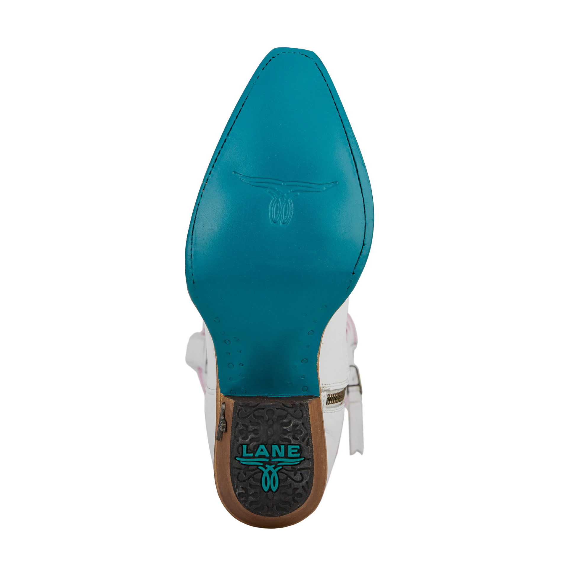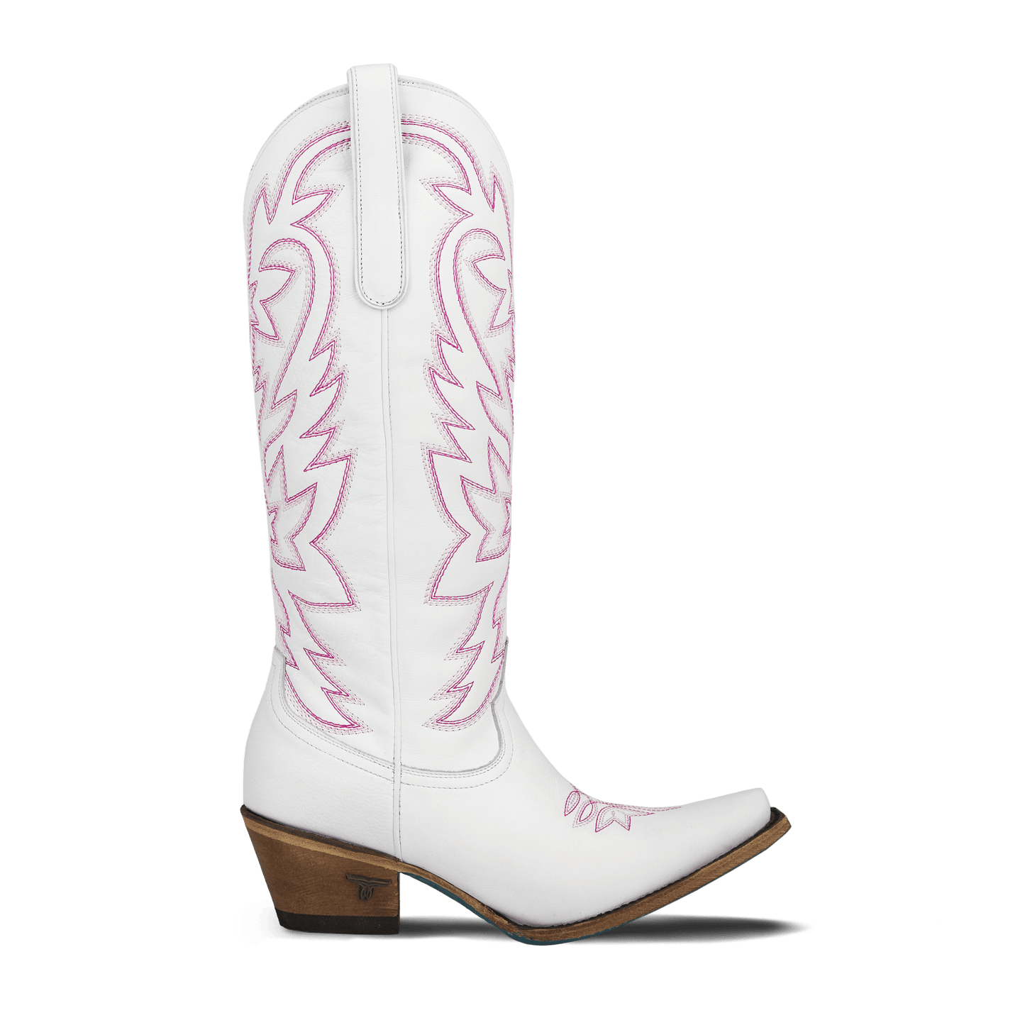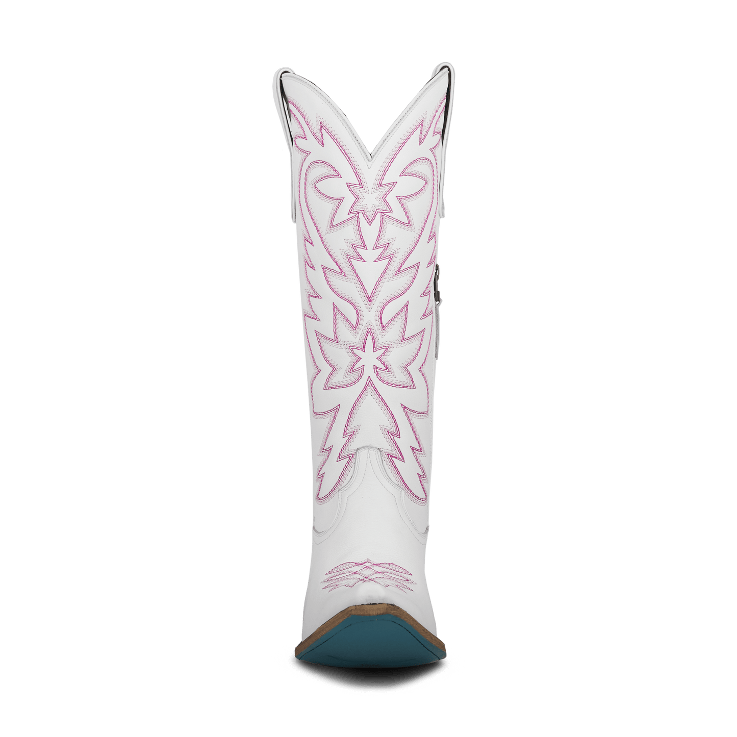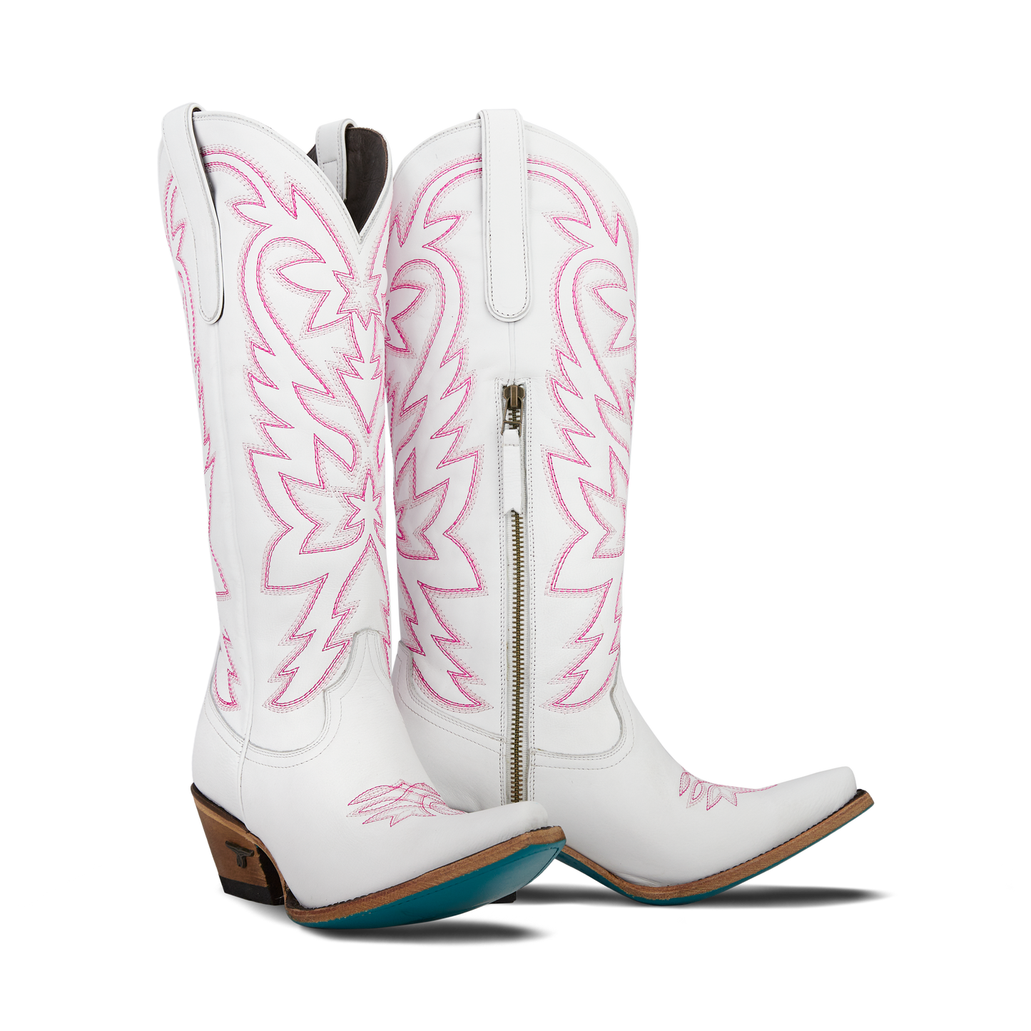 She's the perfect chic, white cowgirl boot with a pop of pink right off the runway.