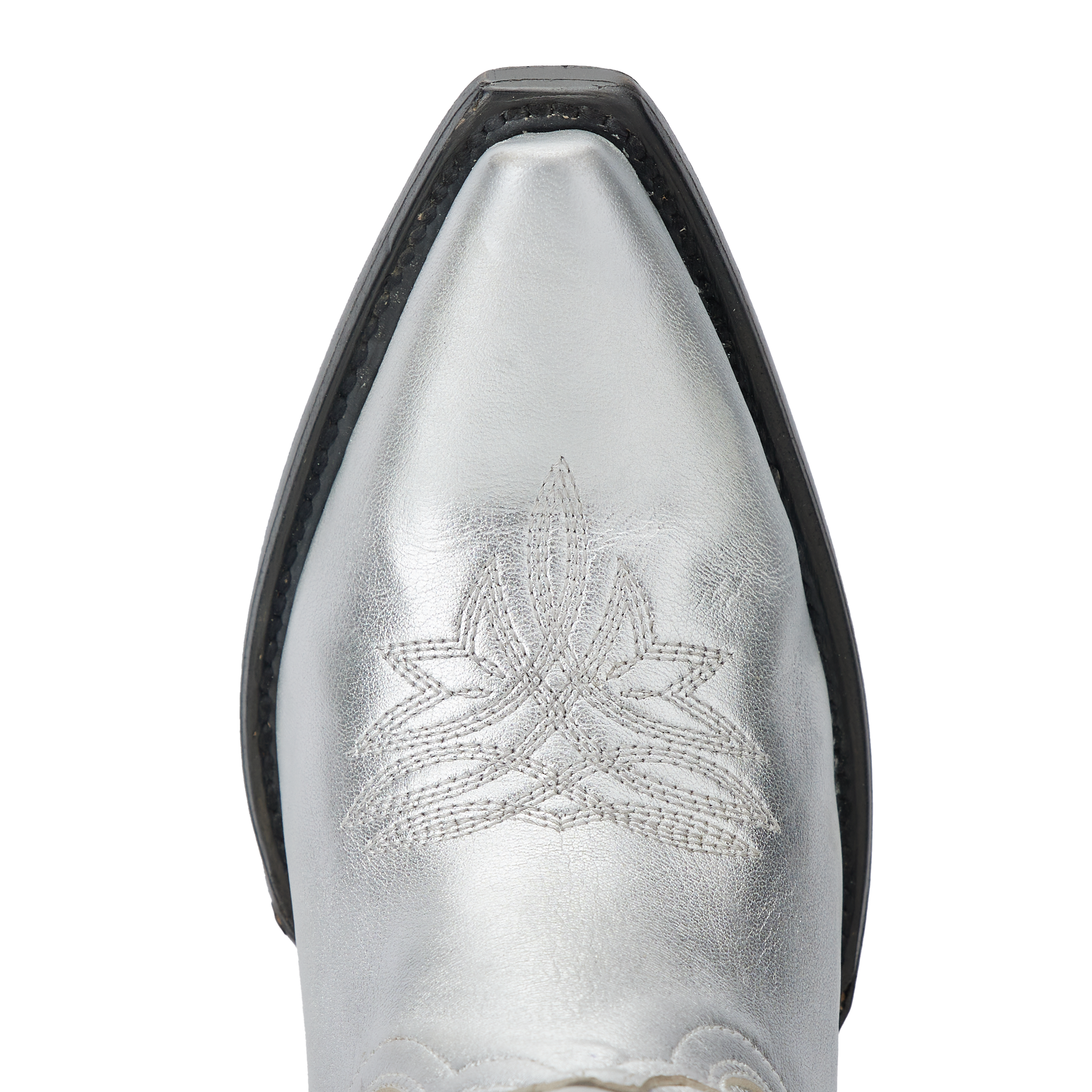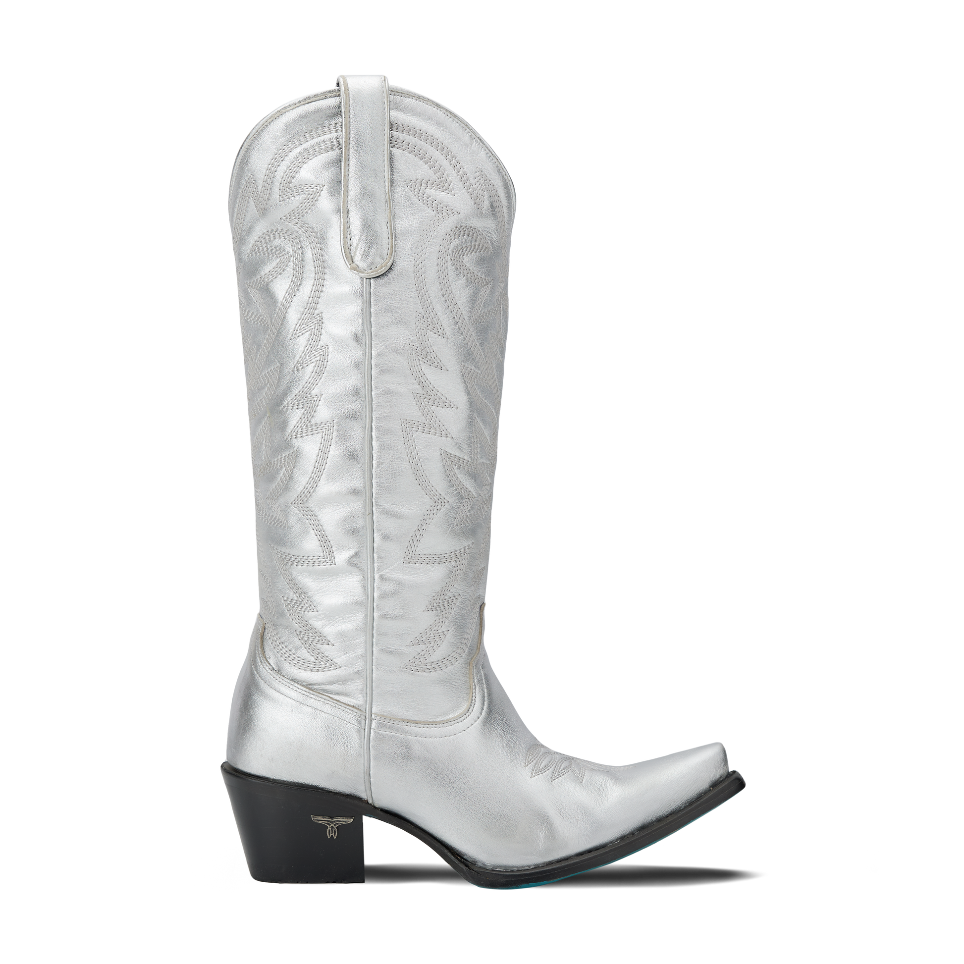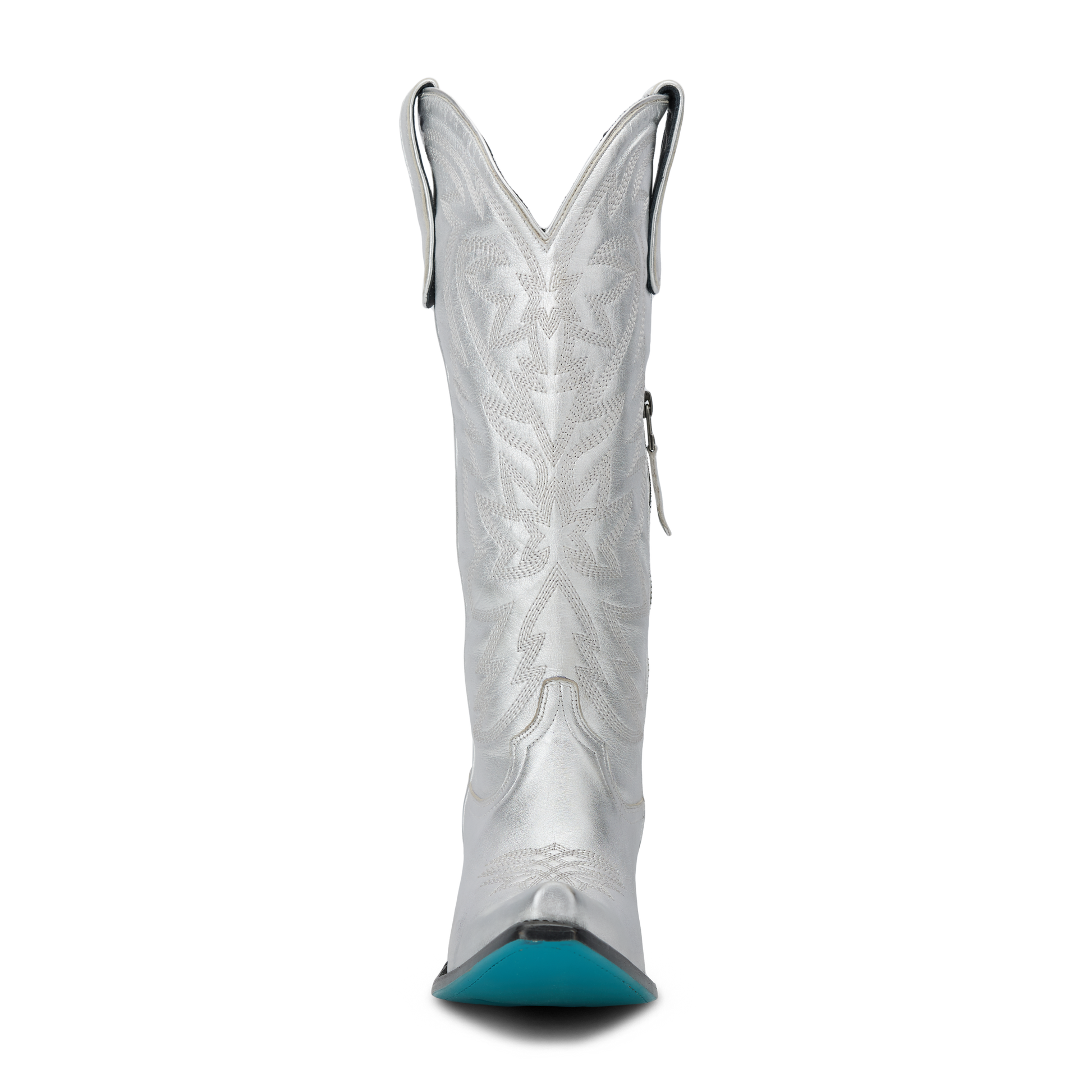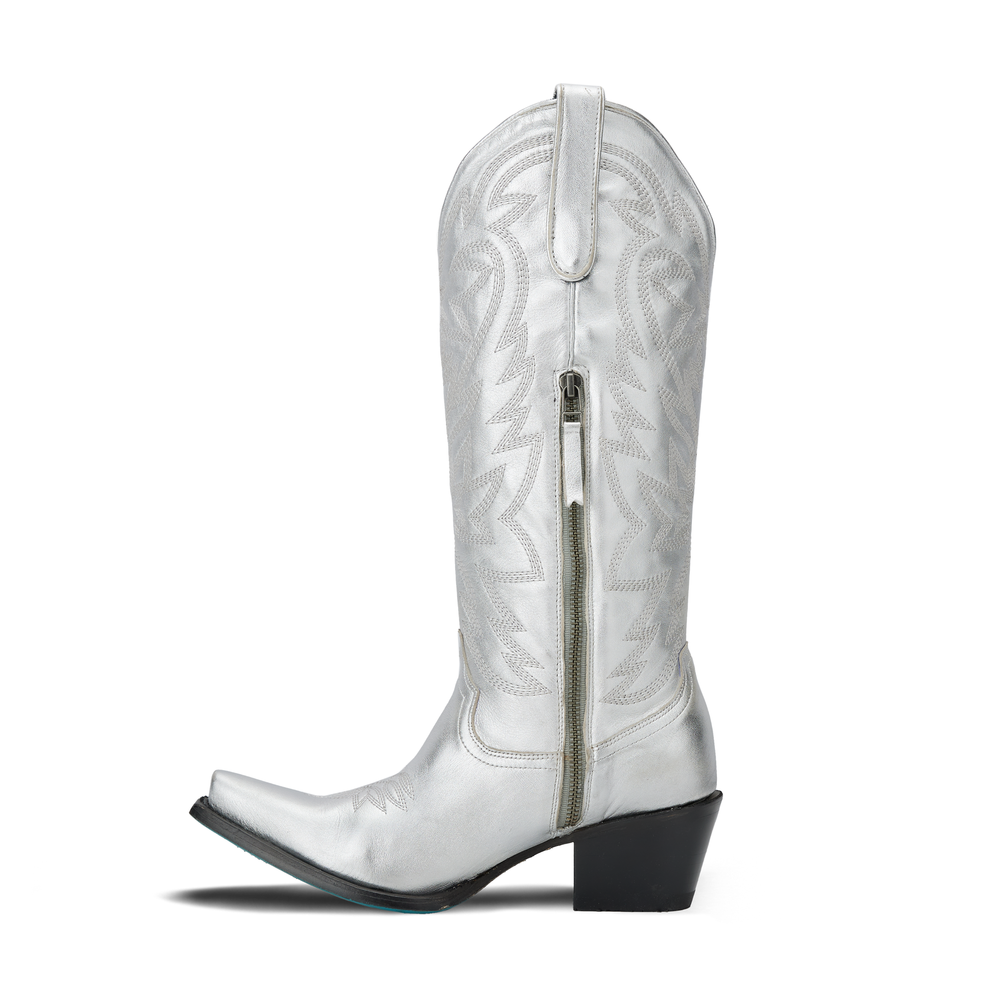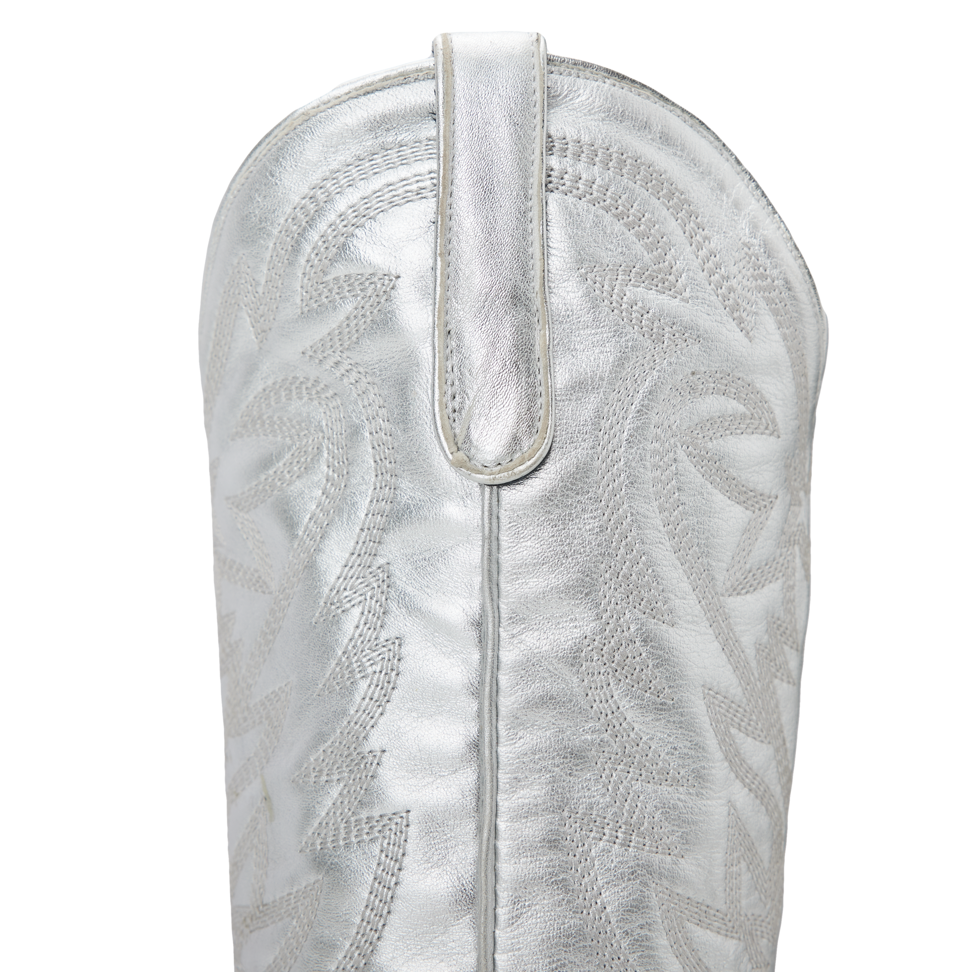 She's the perfect chic, metallic silver cowgirl boots right off the runway.