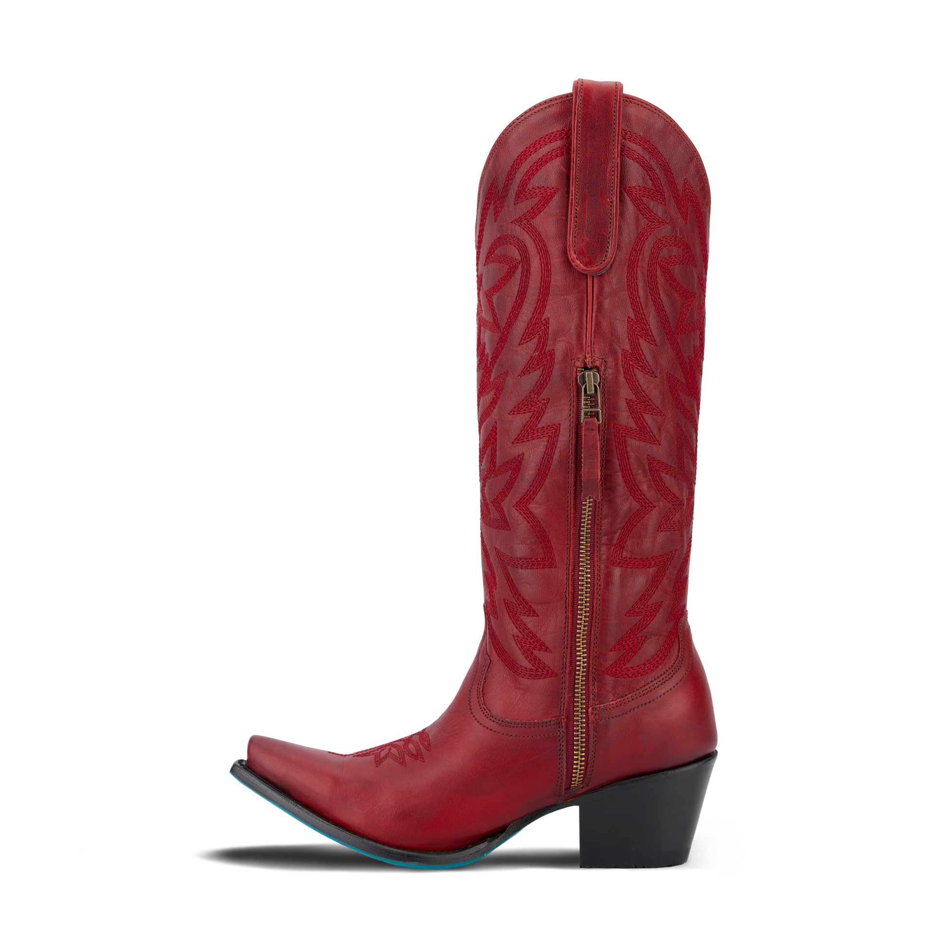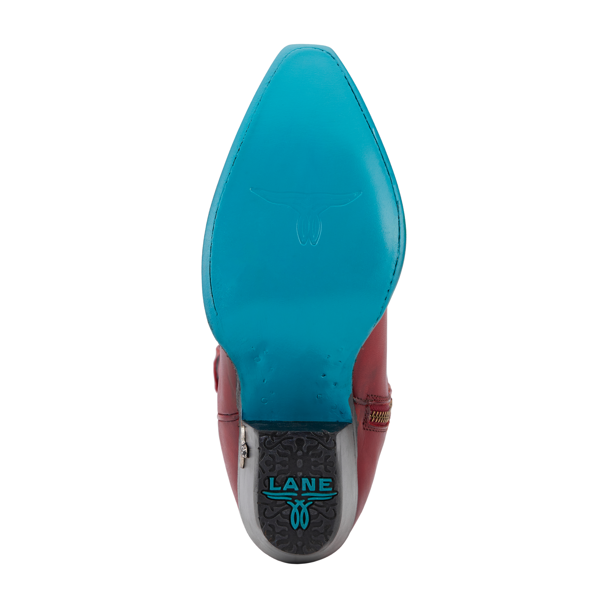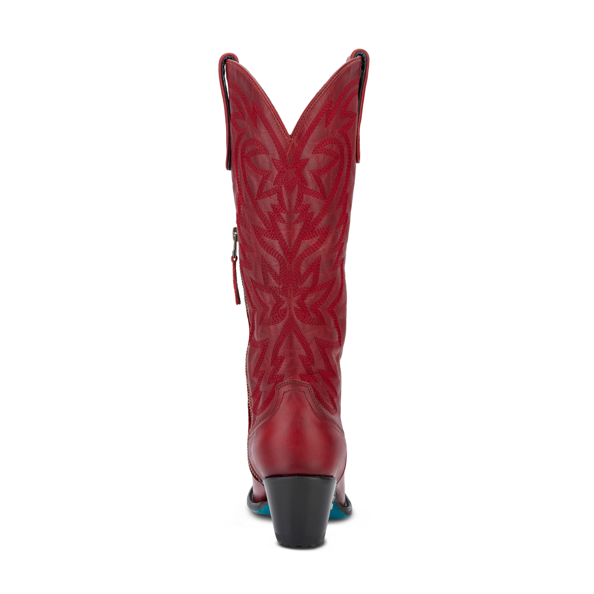 She's the perfect chic, red cowgirl boot right off the runway. This classic snip toe is accompanied by an abstract cosmic starburst pattern and retro-inspired toe stitch. Level up your wardrobe with this blue bottom hottie.