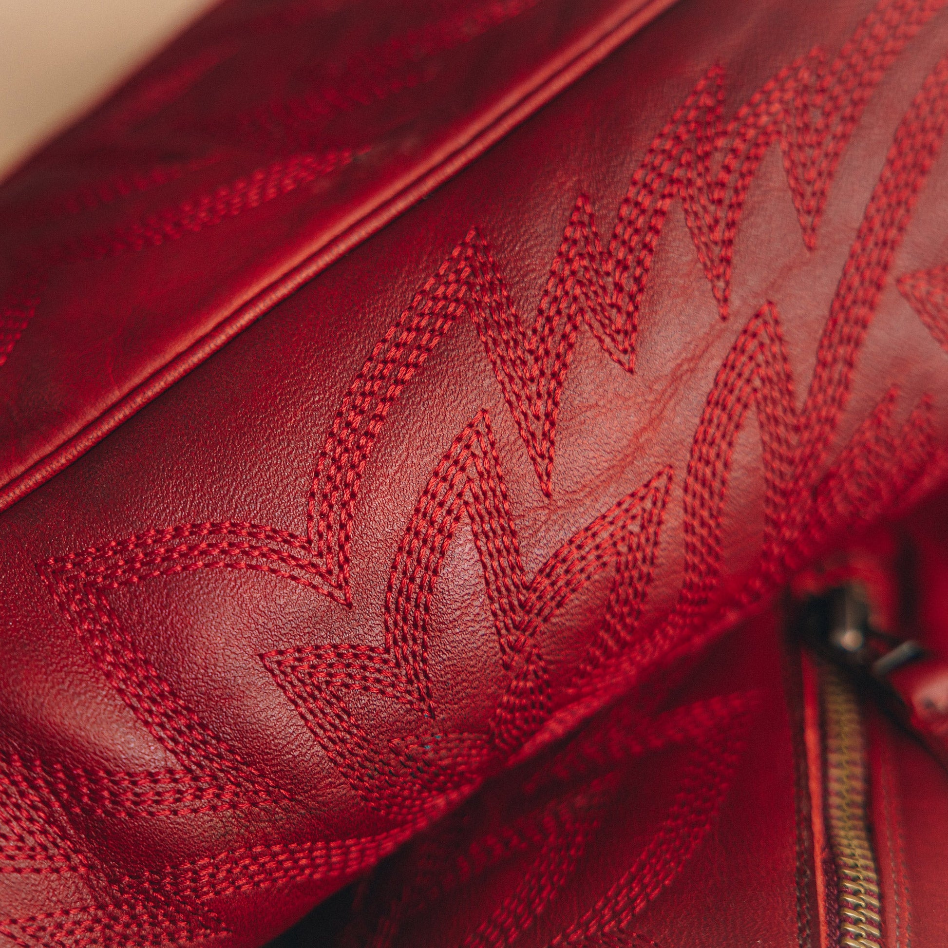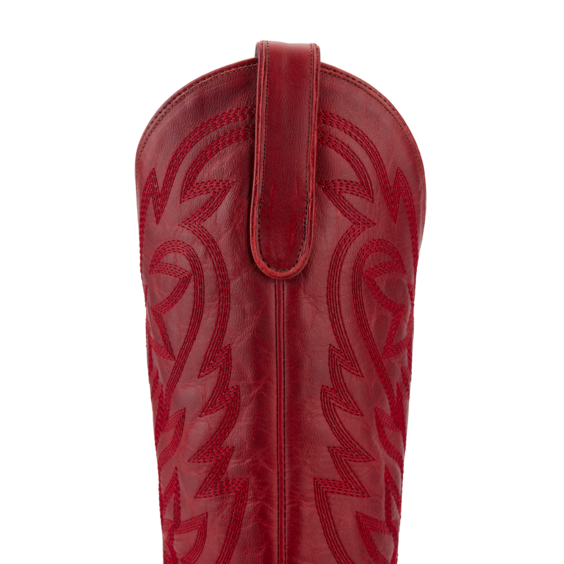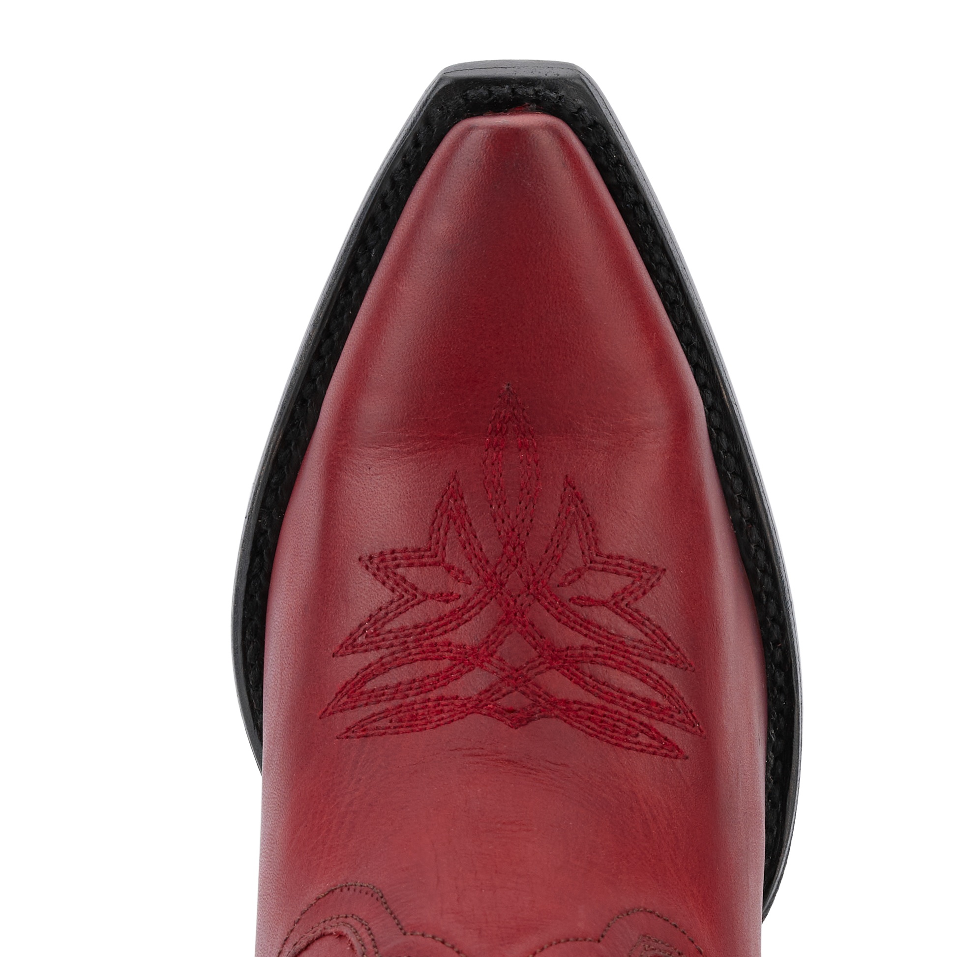 She's the perfect chic, red cowgirl boot right off the runway. This classic snip toe is accompanied by an abstract cosmic starburst pattern and retro-inspired toe stitch. Level up your wardrobe with this blue bottom hottie.