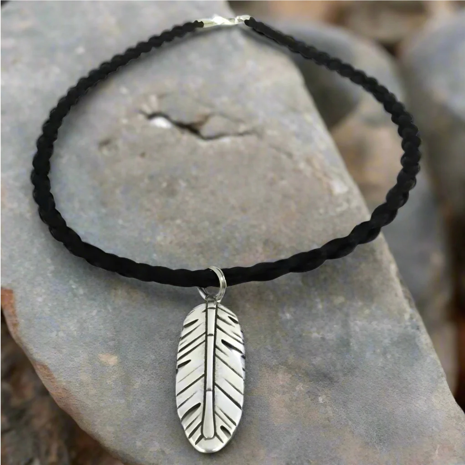 This silver feather symbolizes your freedom to soar and grow. To share your message. This pendant is made of Zamak metal, an aluminum alloy, and hangs from a genuine black horsehair necklace. 18 inches.